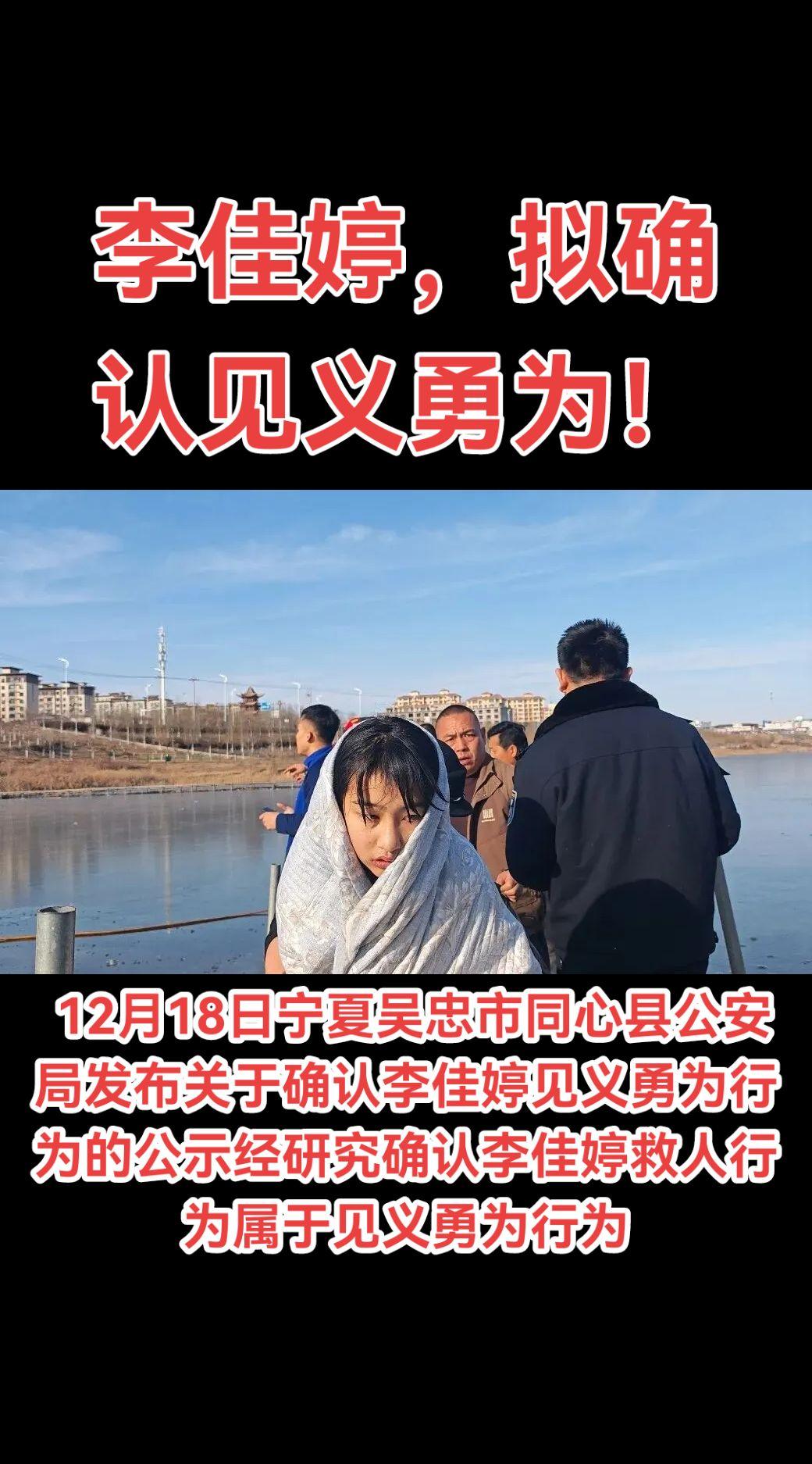 月18日宁夏吴忠市同心县公安局发布关于确认李佳婷见义勇为行为的公示经研究确认李佳婷救人行为属于见义勇为行为