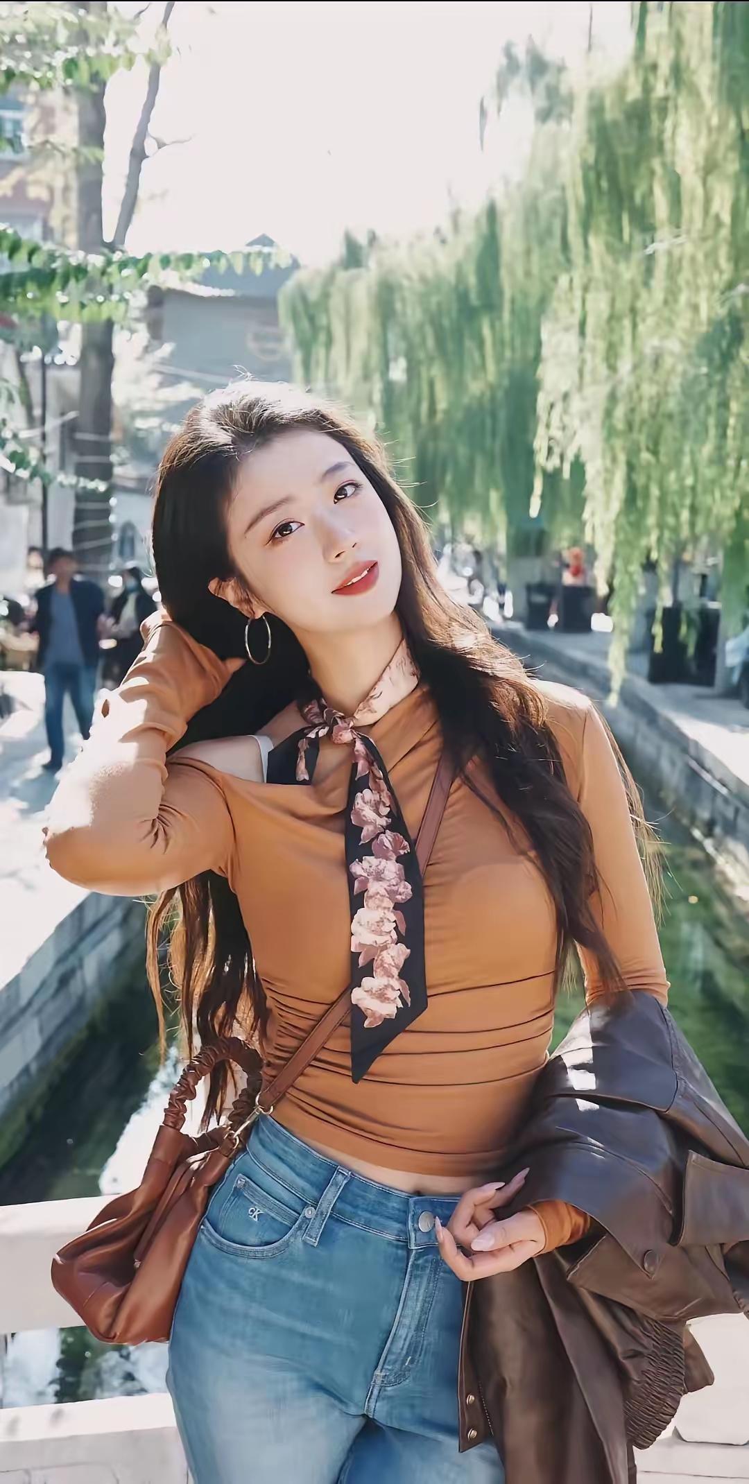 《湖岸晴光里》湖风裹着树影的柔,她倚在栏杆旁,浅灰衫子浸着晴日的温软,牛仔
