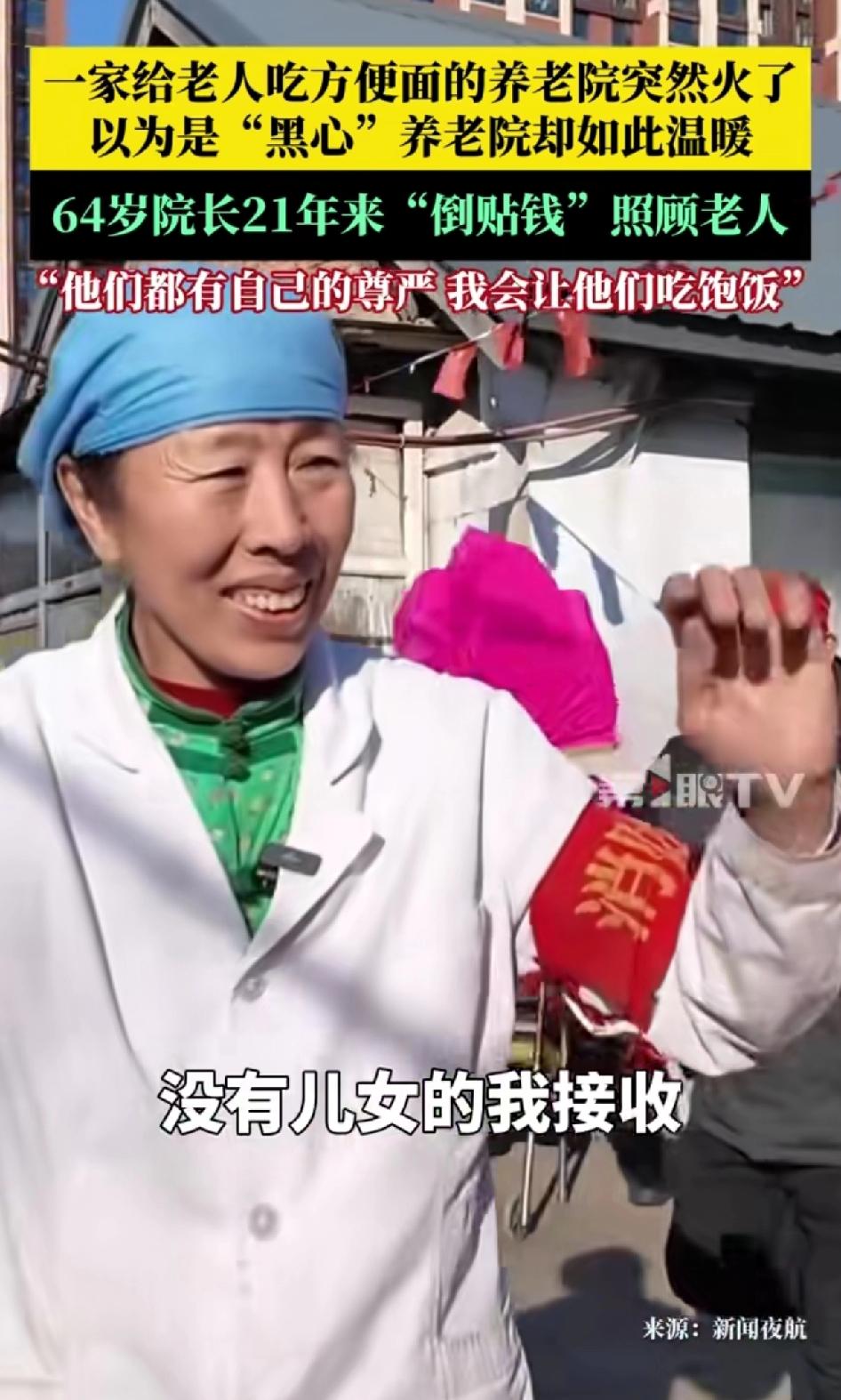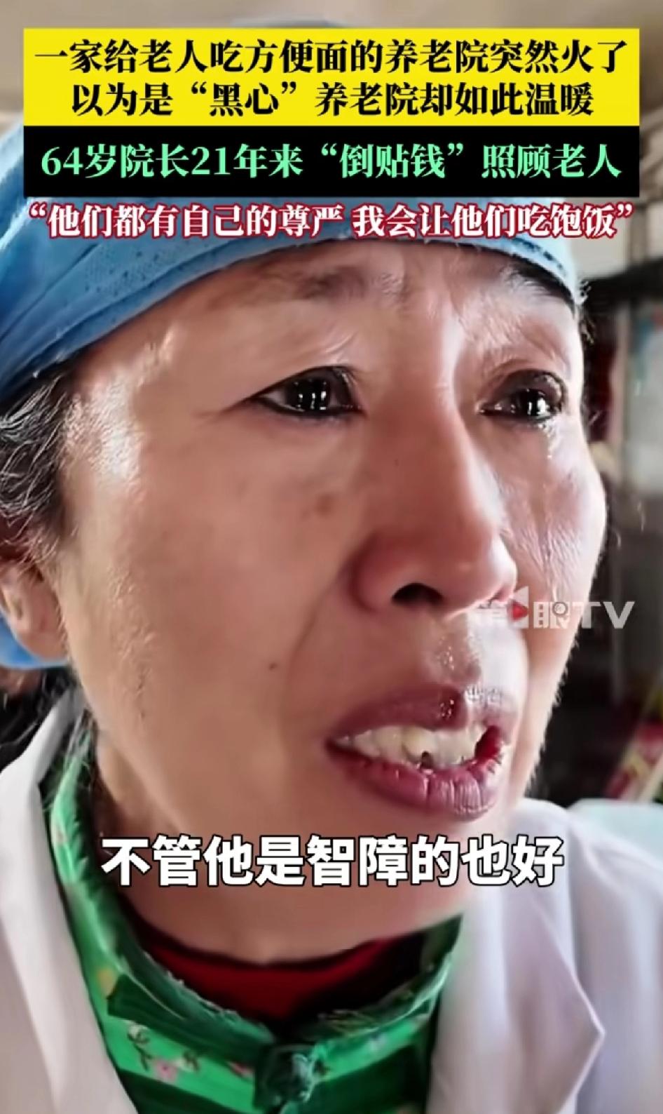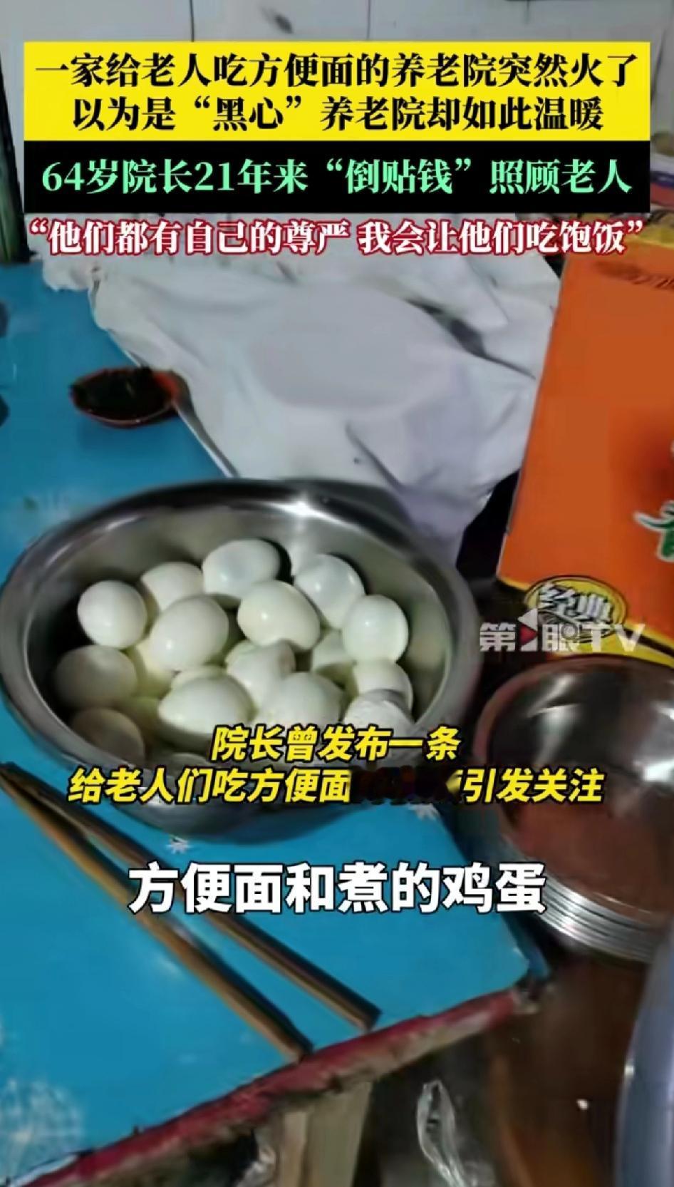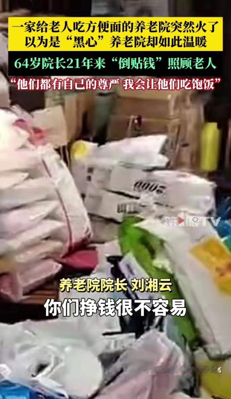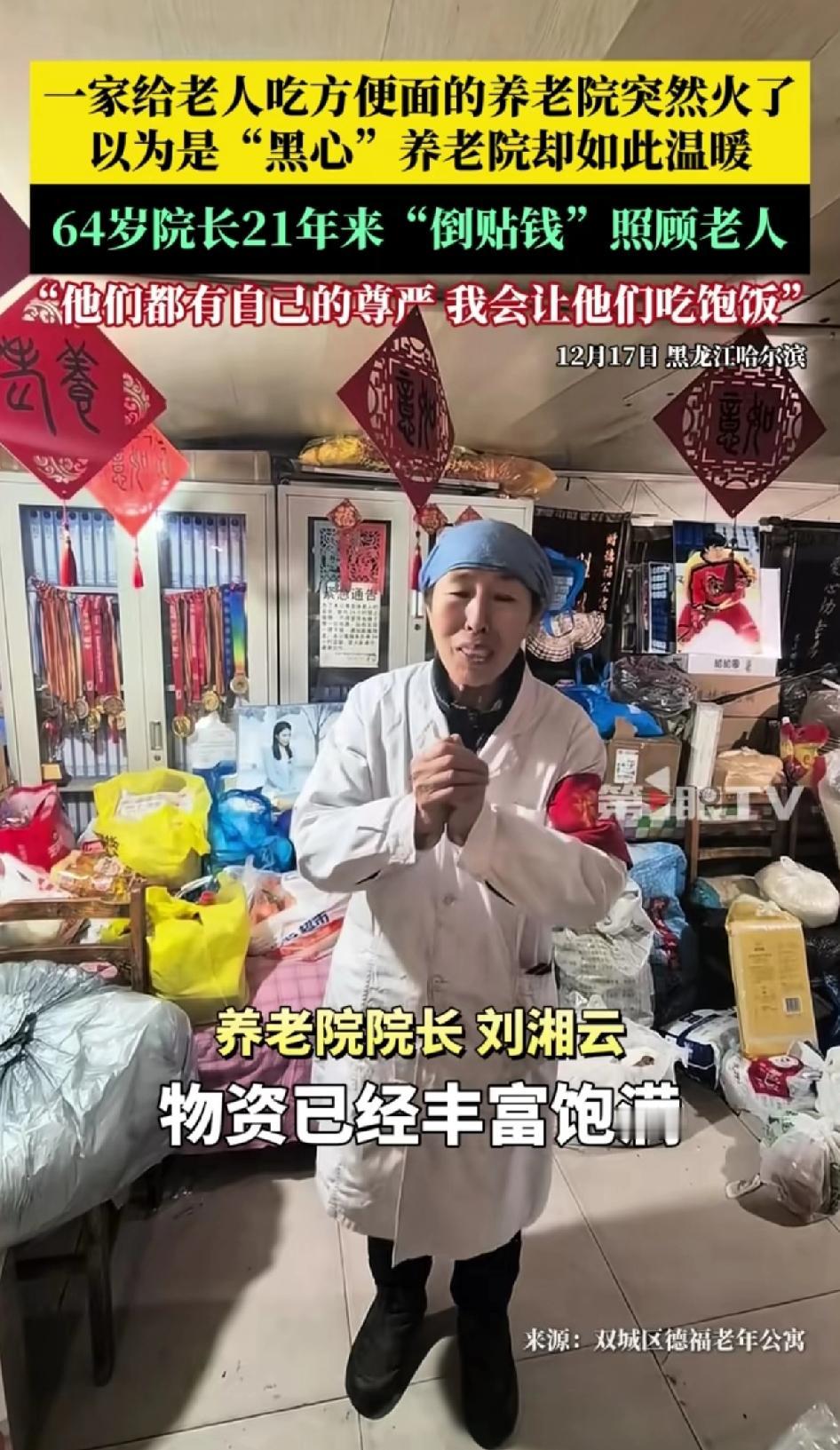 一家给老人吃方便面的养老院突然火了,却被部分网友吐槽是“黑心养老院”。但了解背后故事,才知错得离谱。 哈尔滨双城区德福养老公寓院长刘湘云21年如一日经营养老院,不仅收留无家可归者,还倒贴钱维持运营, 64岁的院长刘湘云21年无偿或低价收留近3000名特殊老人,院里有8位是她无偿收留,其余大多欠费数月甚至三年。 没有儿女的她管,zhizhang的也收。 不管环境怎么样都会让大家吃饱穿暖。 12月11日那顿方便面,是网友捐赠物资,院长还特意让给每个碗卧个鸡蛋、撒点葱花。 了解养老院背后的故事,热心网友自发捐赠了很多食品物品。 刘院长面对镜头,表示感谢网友的捐赠,现在房间里堆满了米面油,和生活用品。 表示现在物资已经丰富,大家不用再捐了,知道大家挣钱也很难,现在物品够用了,不用再捐了。 这哪是什么“黑心”,分明是善良的坚守。如今,这份善举被看到,希望爱心能持续温暖这些老人。