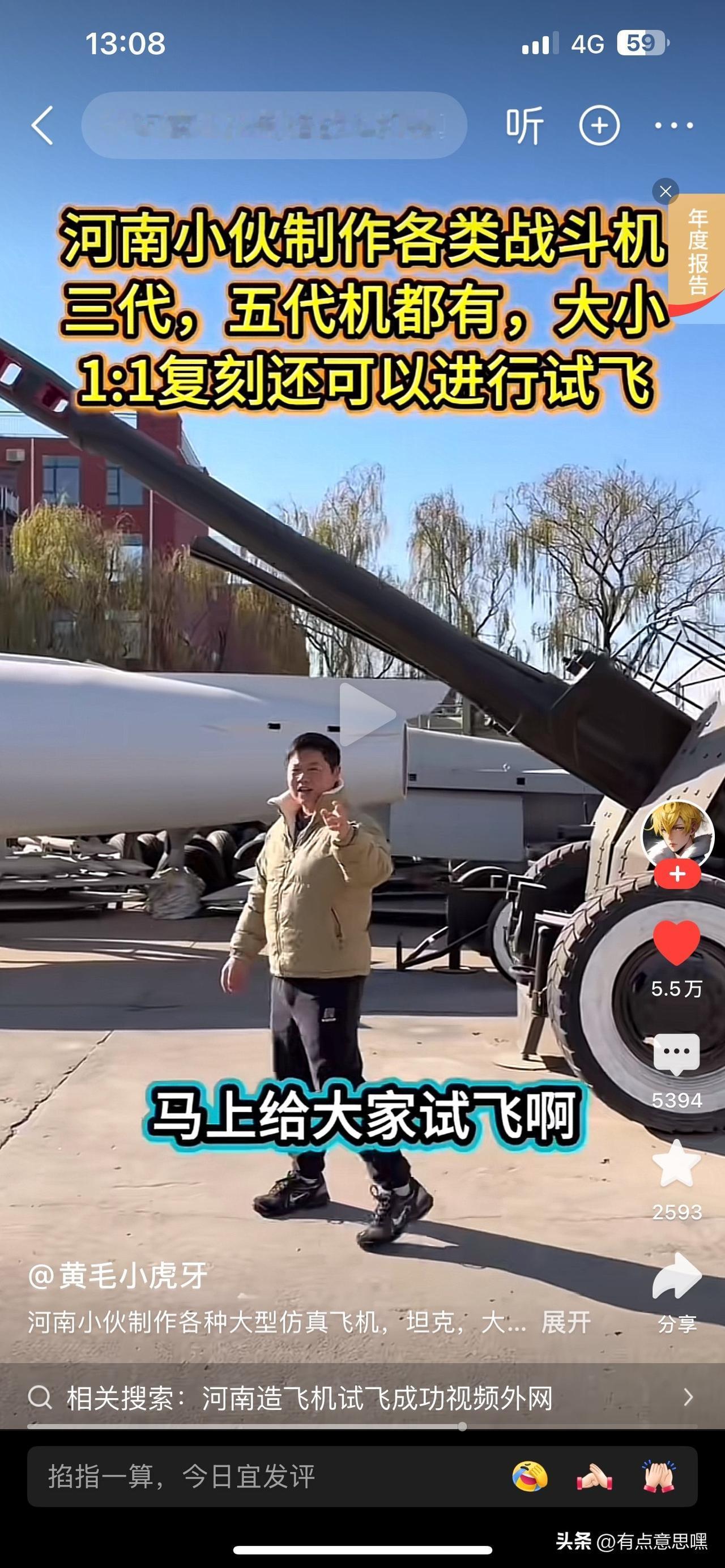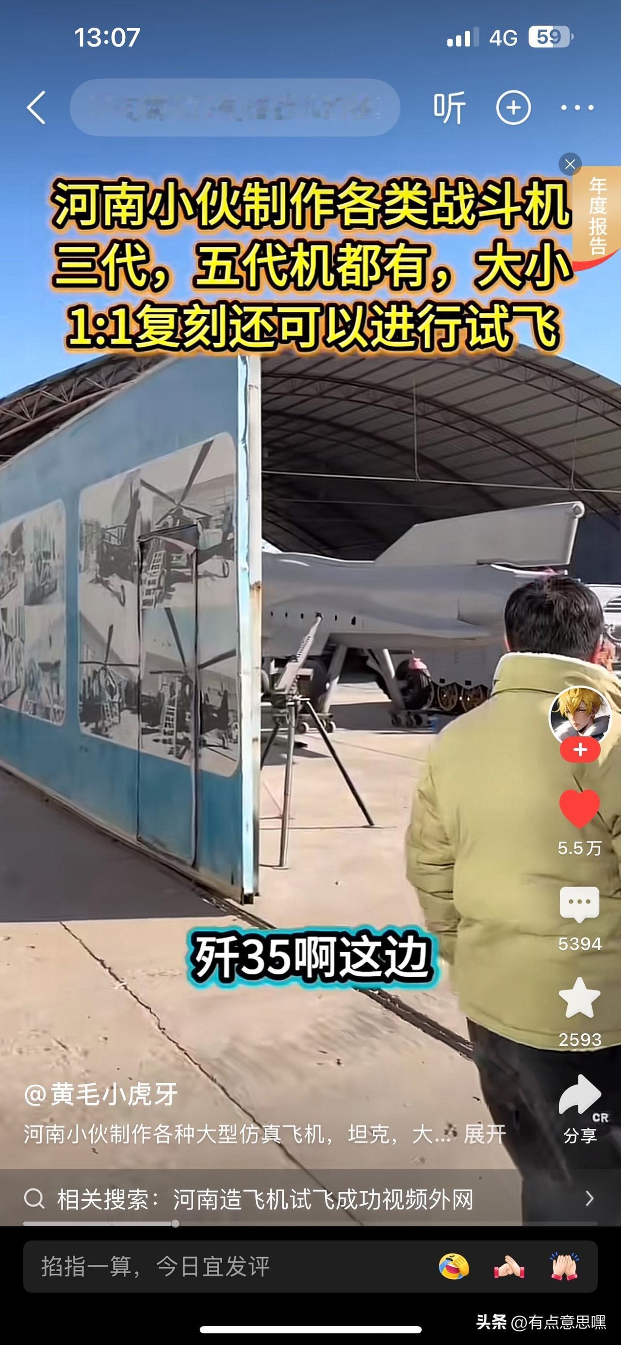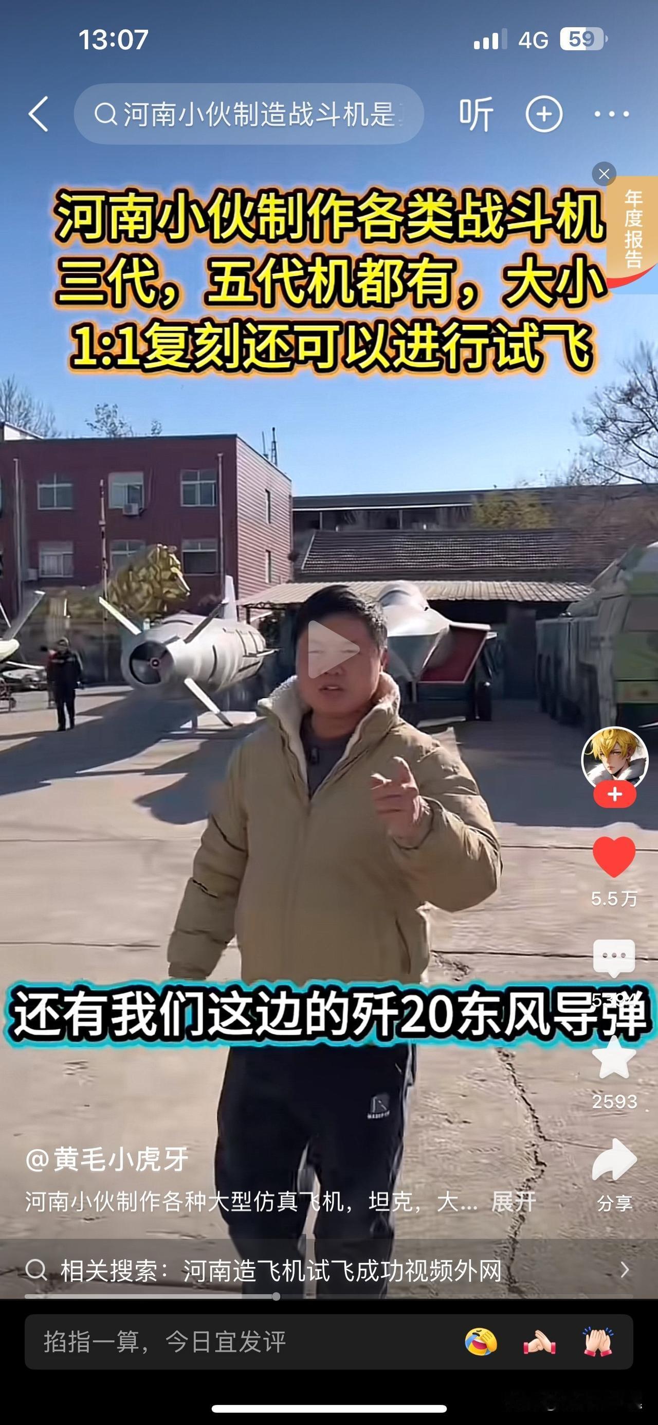 国家禁止仿真枪是真的吗? 此前曾看到一篇报道,一个少年购买多支仿真枪,被判十几年徒刑,所以俺知道,拥有仿真武器是违法的。 可这个河南小伙真是颠覆了我的认知,人家不玩那些小打小闹,人家直接干大的。人家自己攒,什么J6、J10、J20、J35,武直九、甚至坦克大炮都整出来了,关键是坦克真的能跑,飞机它真能上天,挂没挂导弹咱就不知道了,不过都整出飞机了,挂俩导弹也没啥难度吧。 为啥说没啥难度,因为人家都有东风导弹了,整几个飞机挂载导弹有个p的难度。 最后的问题是,这哥们儿做是做出来了,谁敢买啊,买个仿真手枪钥匙扣被判了3年,这要是整个东风买回去,还不得直接死刑啊。 ——————————