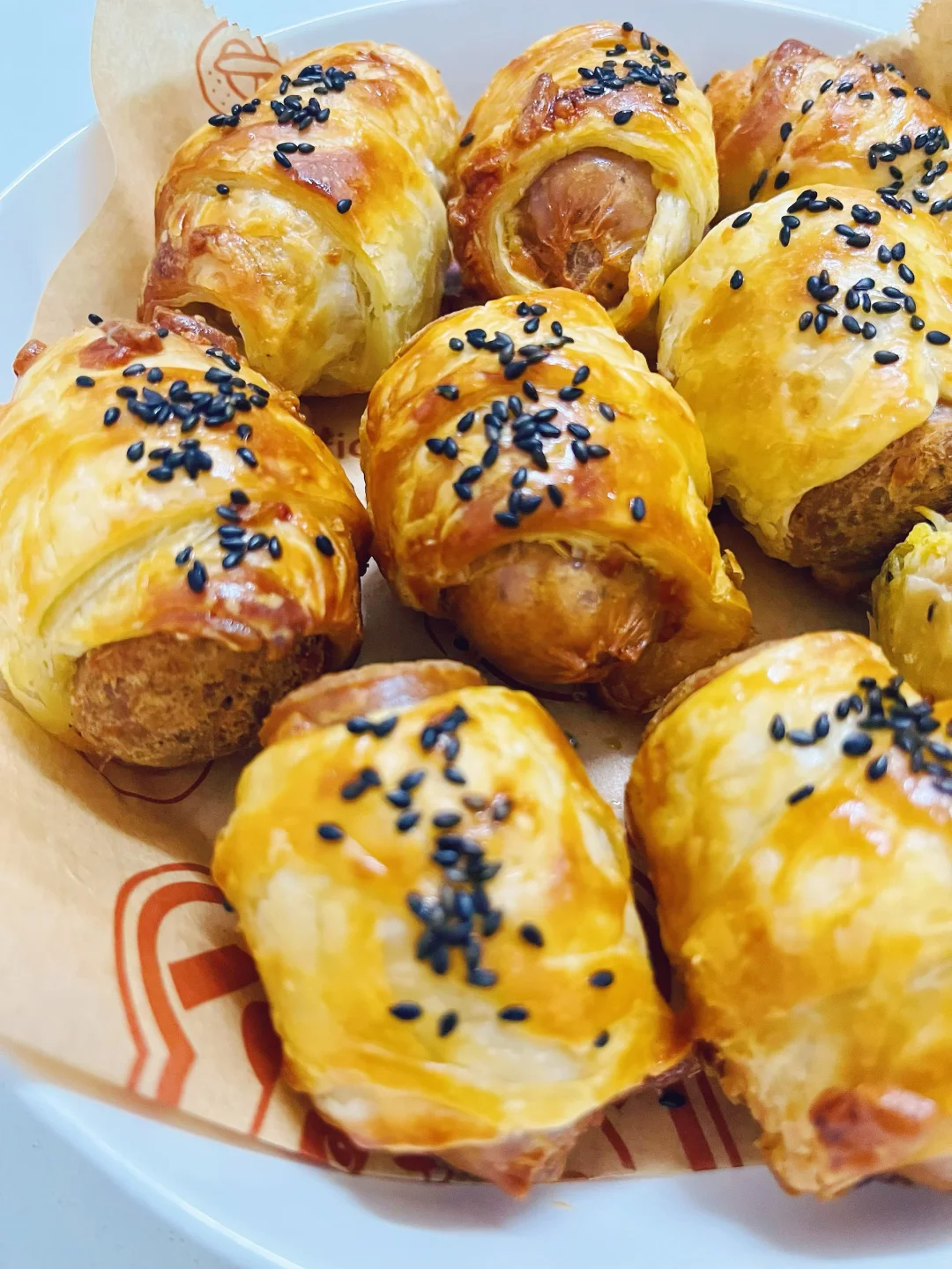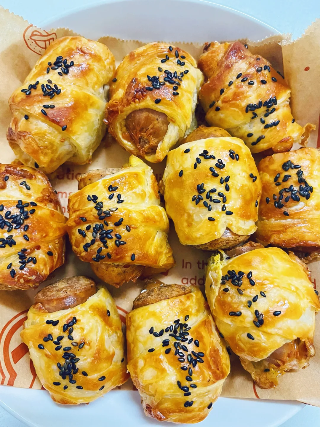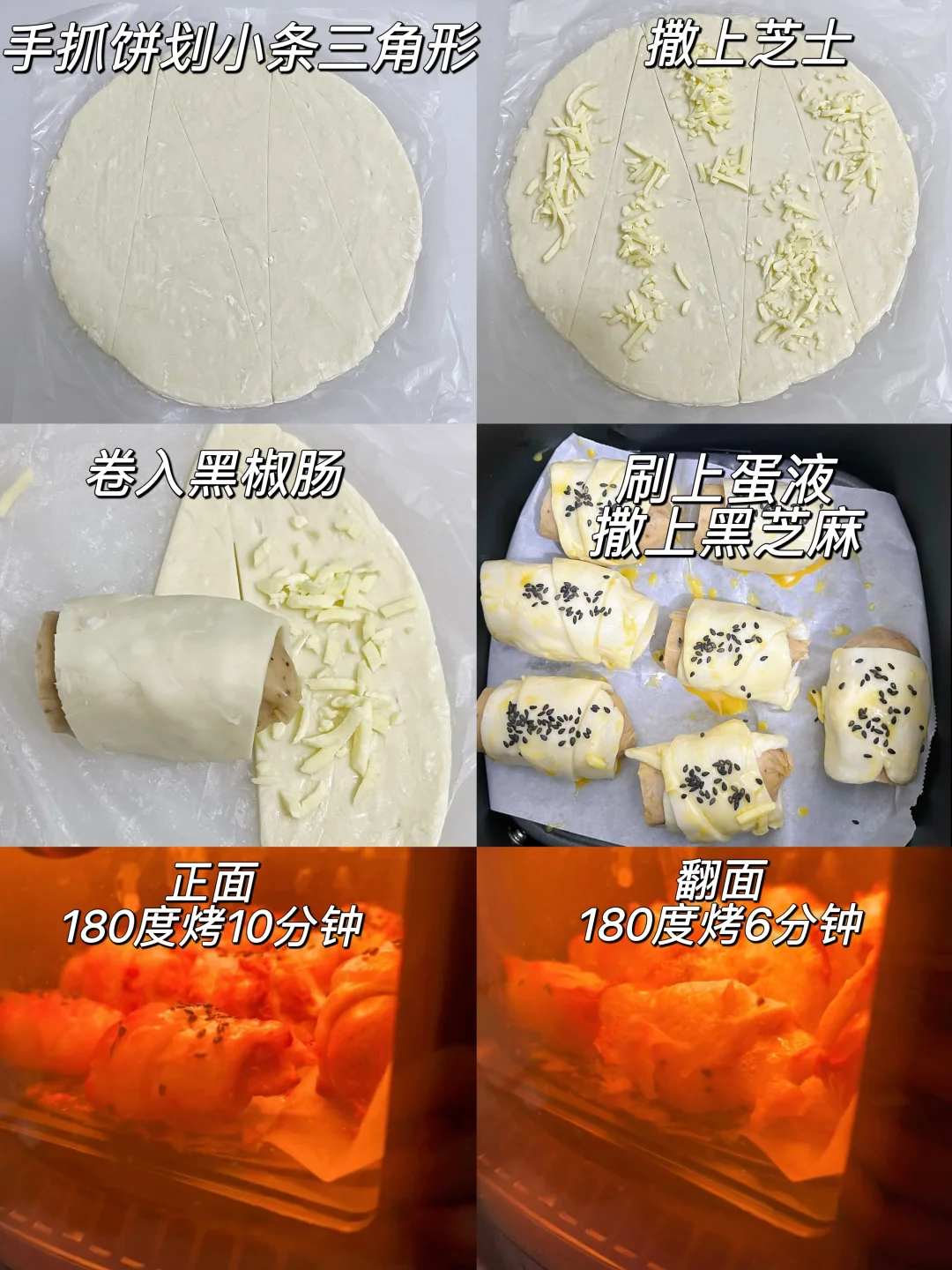 烤的时候满屋飘香!饼皮金黄酥脆,里面是爆汁的黑椒肠和拉丝的芝士,一口下去超满足!