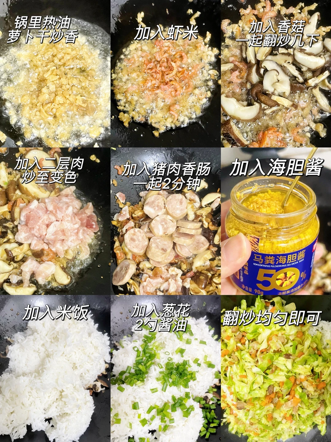 4️⃣ 加入海胆酱(饭比较多,直接倒一瓶,满满海胆酱香味),加入白米饭,葱花,2勺酱油,翻炒均匀即可。