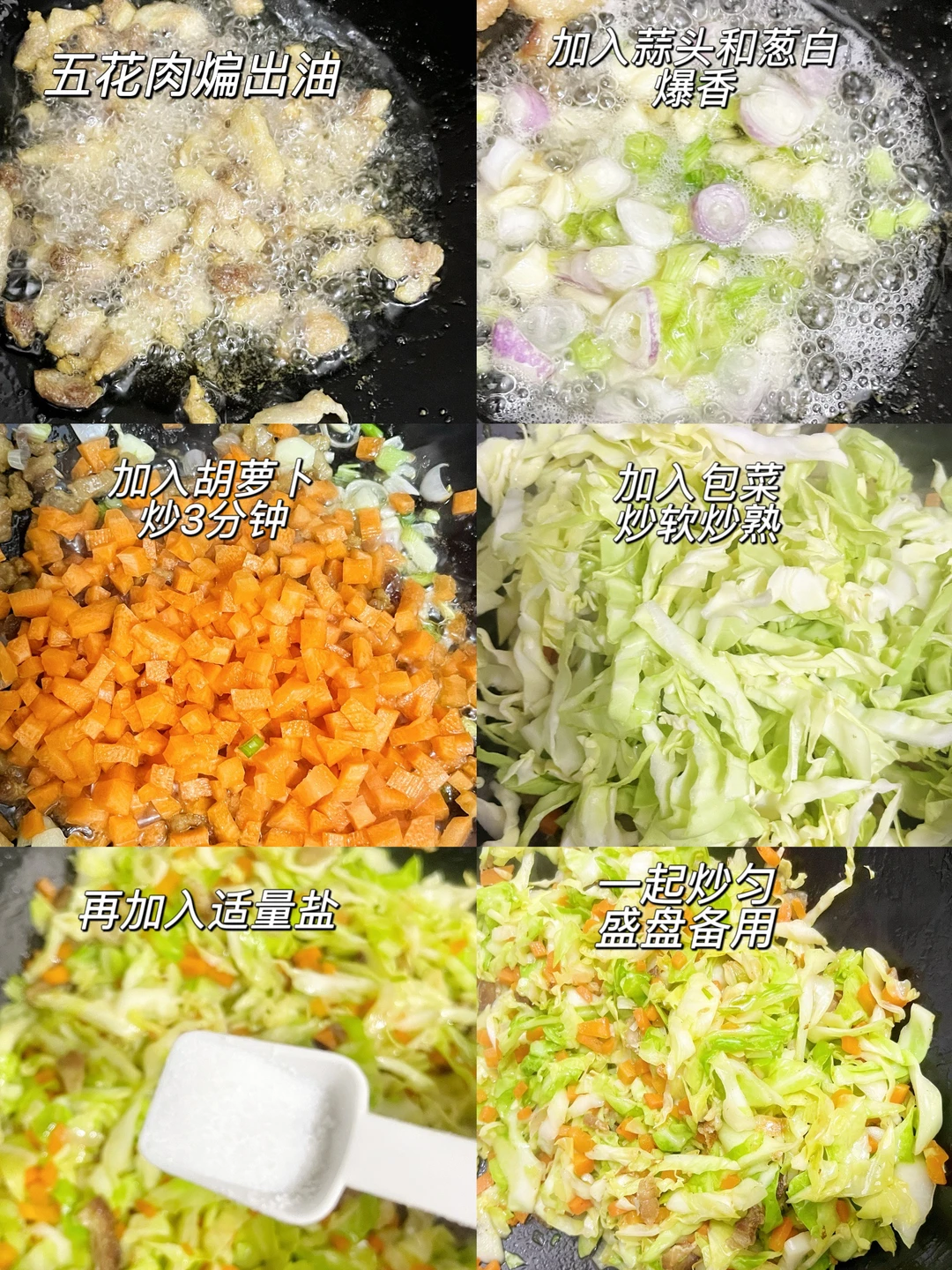 2️⃣ 五花肉煸出油,加蒜、葱白爆香,加入胡萝卜炒3分钟,再加入包菜,炒软炒熟,加适量盐翻炒均匀,盛盘备用。