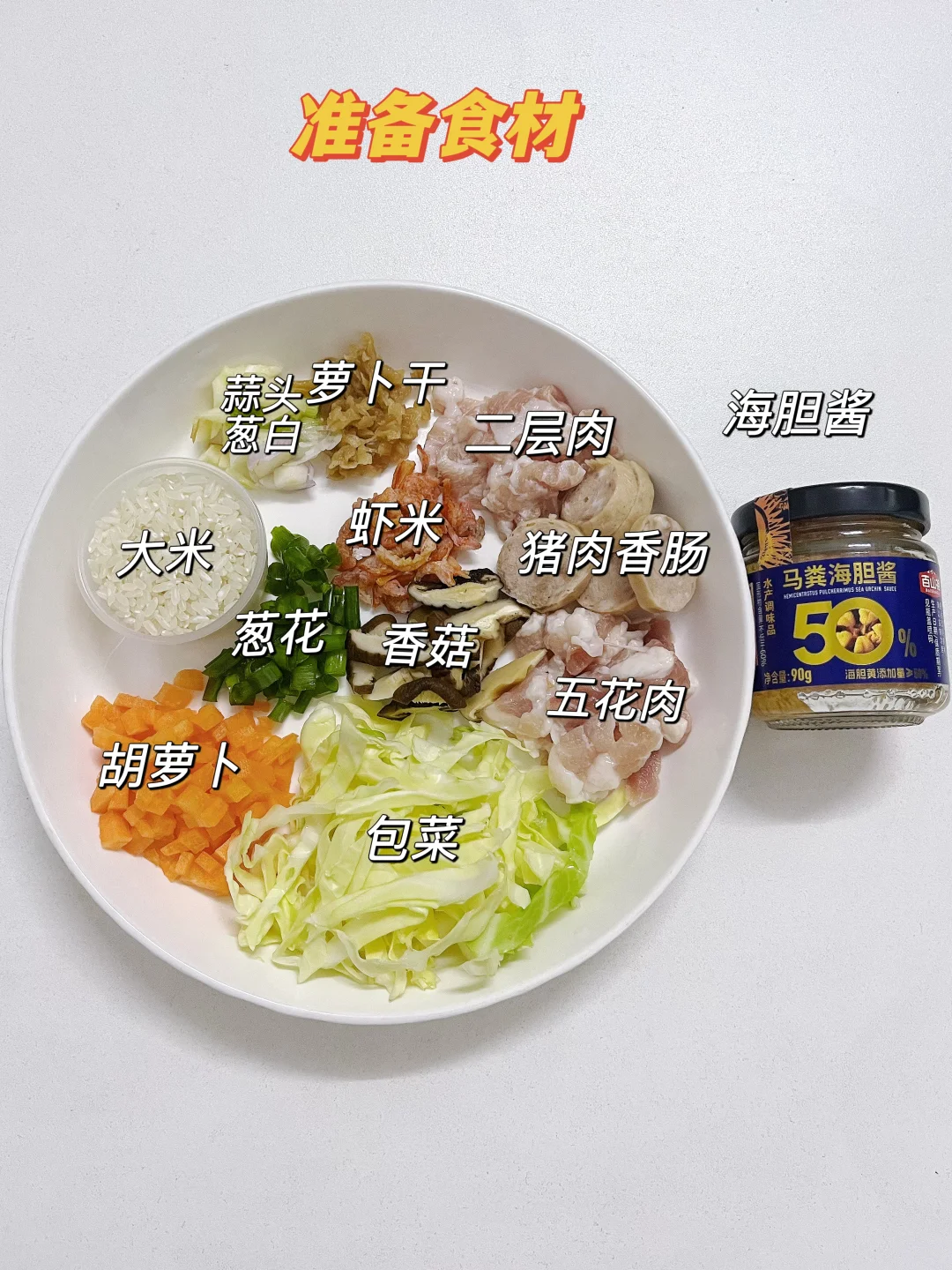 大米、五花肉、二层肉、猪肉香肠、虾米、香菇、包菜、胡萝卜、葱花