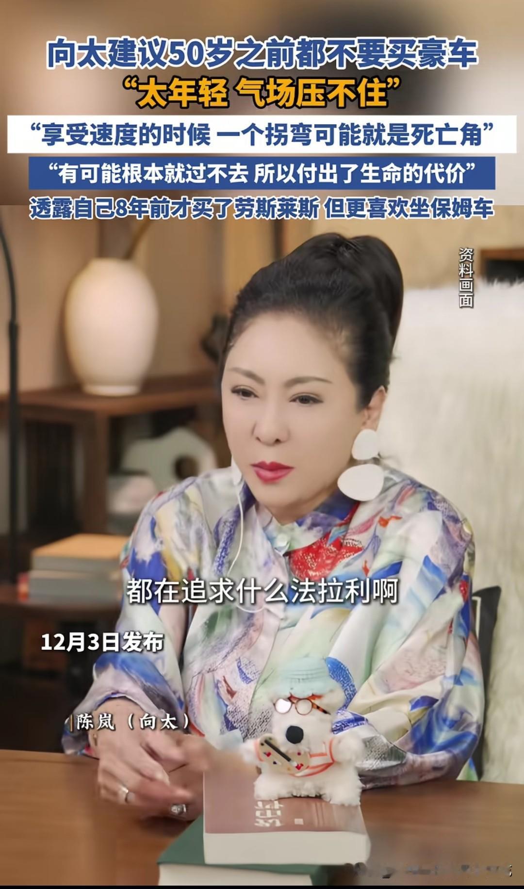 向太建议大家50岁之前不要买豪车,她说人太年轻气场压不住,你买了肯定不会太顺,生活会遇到一些波折,严重的话会付出生命的代价。 向太此番言论可能来自见惯了网上年轻人开好车频发的车祸,因为太年轻,技术不过关,频繁导致车祸发生,然后一辈子就这样毁了。向太早期发家就深知这点,因此50岁之后才开始买的豪车,这个时候的她早已不需要豪车压场,因此车已经成了名副其实的交通工具,是实实在在的给自己提供了便利。 很多人也许会觉得50岁之前不买,难道等老了再去享受吗?压不住是命,和年纪没关系,能享受的东西趁早享受,年纪大了就完全不一样,现在戴个劳力士,戴个百达翡丽去大学上学,和你40岁再去戴完全是不一样的感觉。 说真的,买不起的始终买不起,买得起的不需要向太的建议。有刚需的需要确实豪车撑场面,如果没有,就会提前走下坡路。没有刚需的,有足够的经济实力,再去购买豪车,它只是一件普通的交通工具,买与不买,跟人生顺不顺就已经没有太大的关系了。