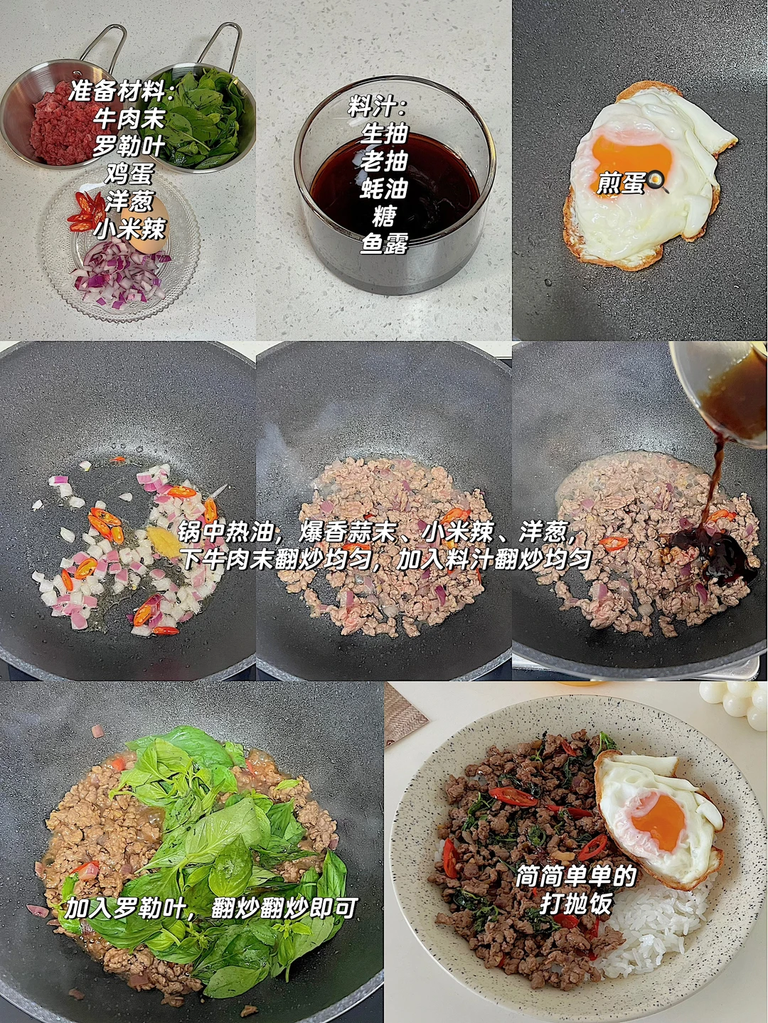 这就是一口一口吃饭的快乐❗️ 做法: ✨准备一碗料汁:生抽、蚝油、蚝油、糖、鱼露(如没有可不加) ✨锅中热油,爆香蒜末、小米辣、洋葱,下牛肉末翻炒均匀,加入料汁翻炒均匀 ✨再加入罗勒叶,翻炒翻炒即可 ✨再煎一个太阳蛋,摆盘即可