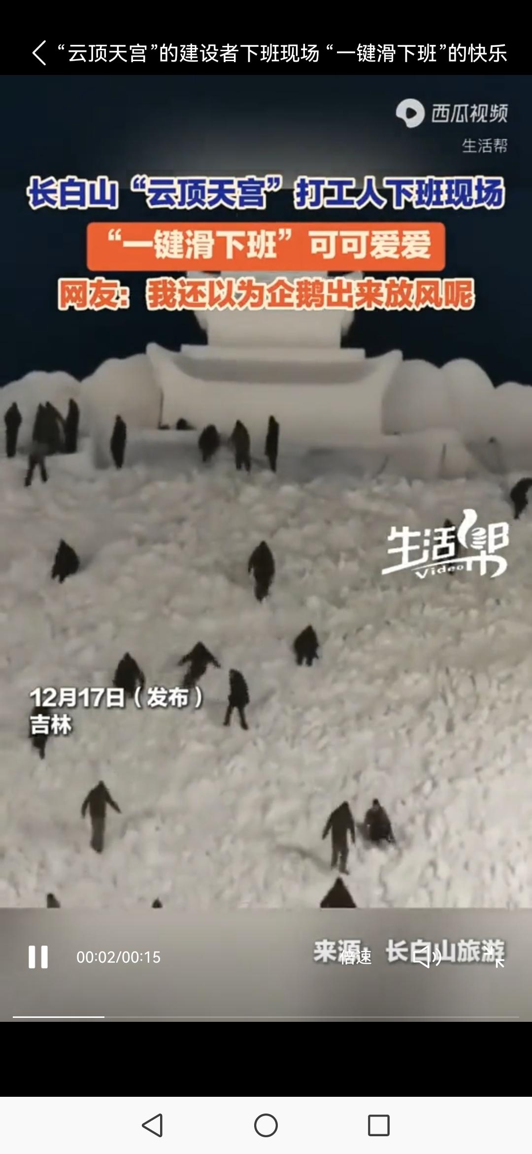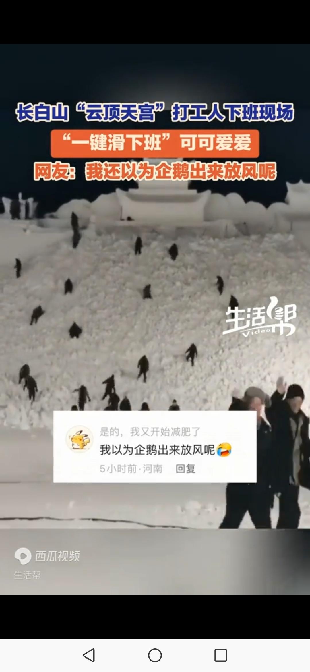 “云顶天宫”的建设者下班现场 “一键滑下班”的快乐 长白山的寒风裹着雪粒呼啸,可“云顶天宫”的下班路却热闹得像场冬日派对。一群裹着厚重棉衣的建设者,踩着简易雪板,顺着作业区的缓坡“一键滑下”,棉帽上的雪沫子随风飞扬,笑声穿透了零下二十度的严寒,网友调侃:“远远一看,还以为是企鹅军团集体放风!” 谁能想到,这火遍全网的快乐瞬间,背后是建设者们日复一日的坚守。这座占地1.5万平方米、用雪量达8万立方米的巨型雪雕,是他们在极寒中一铲一凿雕出来的“童话城堡”。从清晨到日暮,他们顶着刺骨寒风修整雪坯,手指冻得通红仍精准勾勒线条,只为还原《盗墓笔记》中那座神秘的天宫盛景 。 “滑着下班可比走回去轻松多啦!”一位师傅擦着额头的热汗笑着说。陡峭的雪坡让步行返程又累又滑,有人灵机一动用上雪板,没想到成了全员效仿的“下班标配”。没有精致的装备,就用木板绑上绳索当“雪具”;没有固定路线,就循着积雪压实的路径顺势而下,每一次滑行都藏着朴实的智慧。 这“一键滑下班”的快乐,戳中了无数打工人的心。我们看的不是酷炫的滑雪技巧,而是成年人在辛劳中的自愈力——他们用最简单的方式,把极寒作业的疲惫,变成了雪地里的撒欢时光。比起网络上的精致摆拍,这种源于生活的真实快乐,更让人觉得温暖又治愈。 有人留言:“这才是打工人的理想下班状态!”也有人感慨:“他们用双手造梦,用笑容对抗严寒,太酷了!” 其实生活从不缺辛苦,缺的是把疲惫酿成快乐的勇气。热点话题 云顶看风景 云顶滑雪场