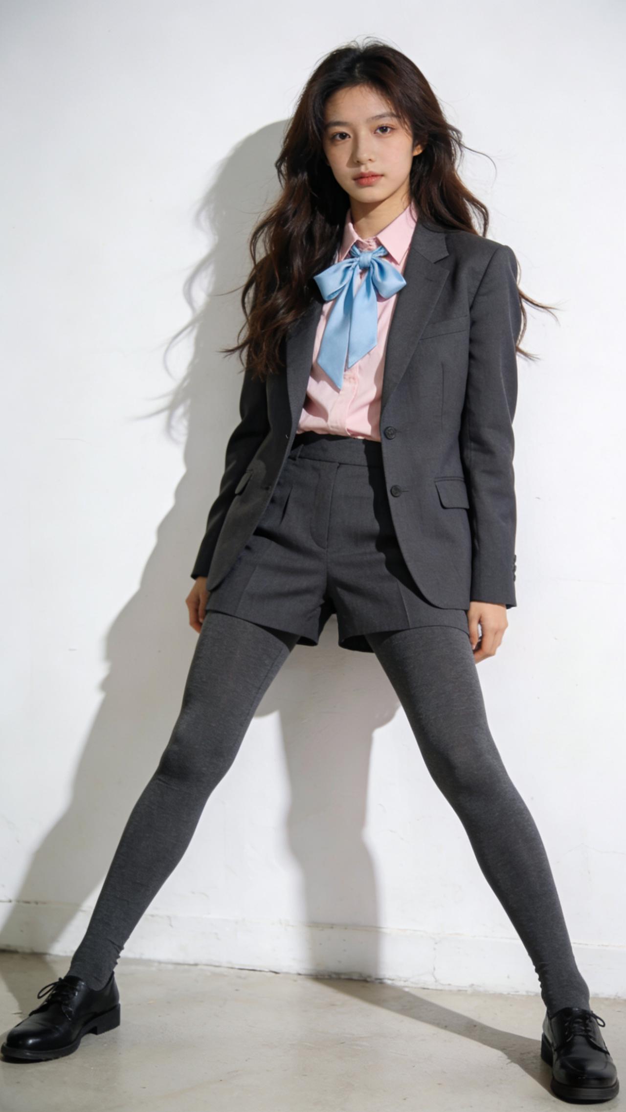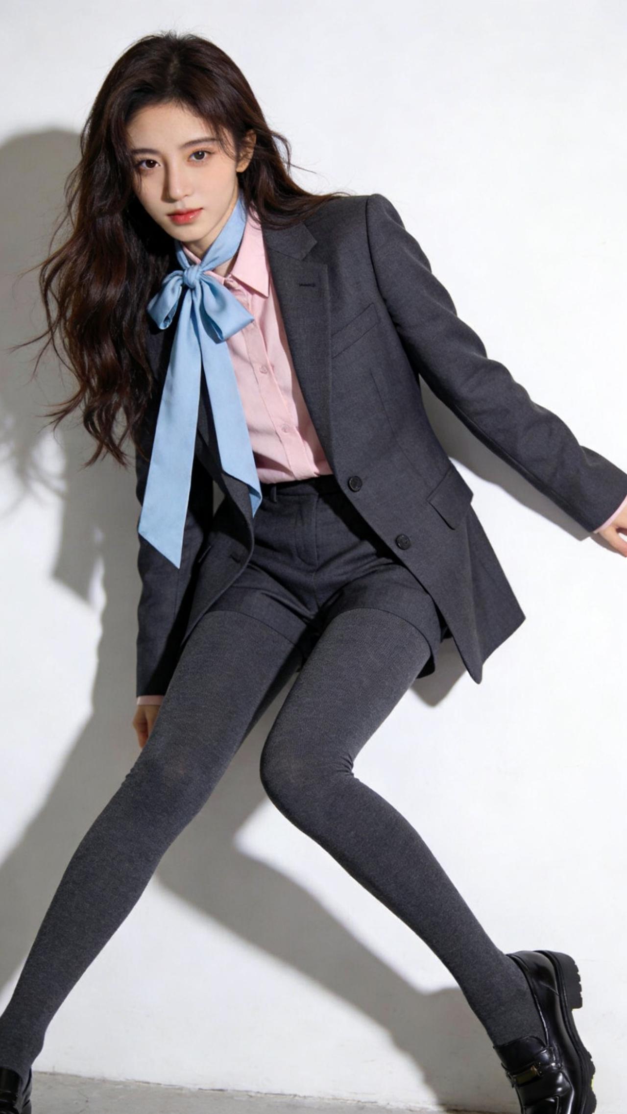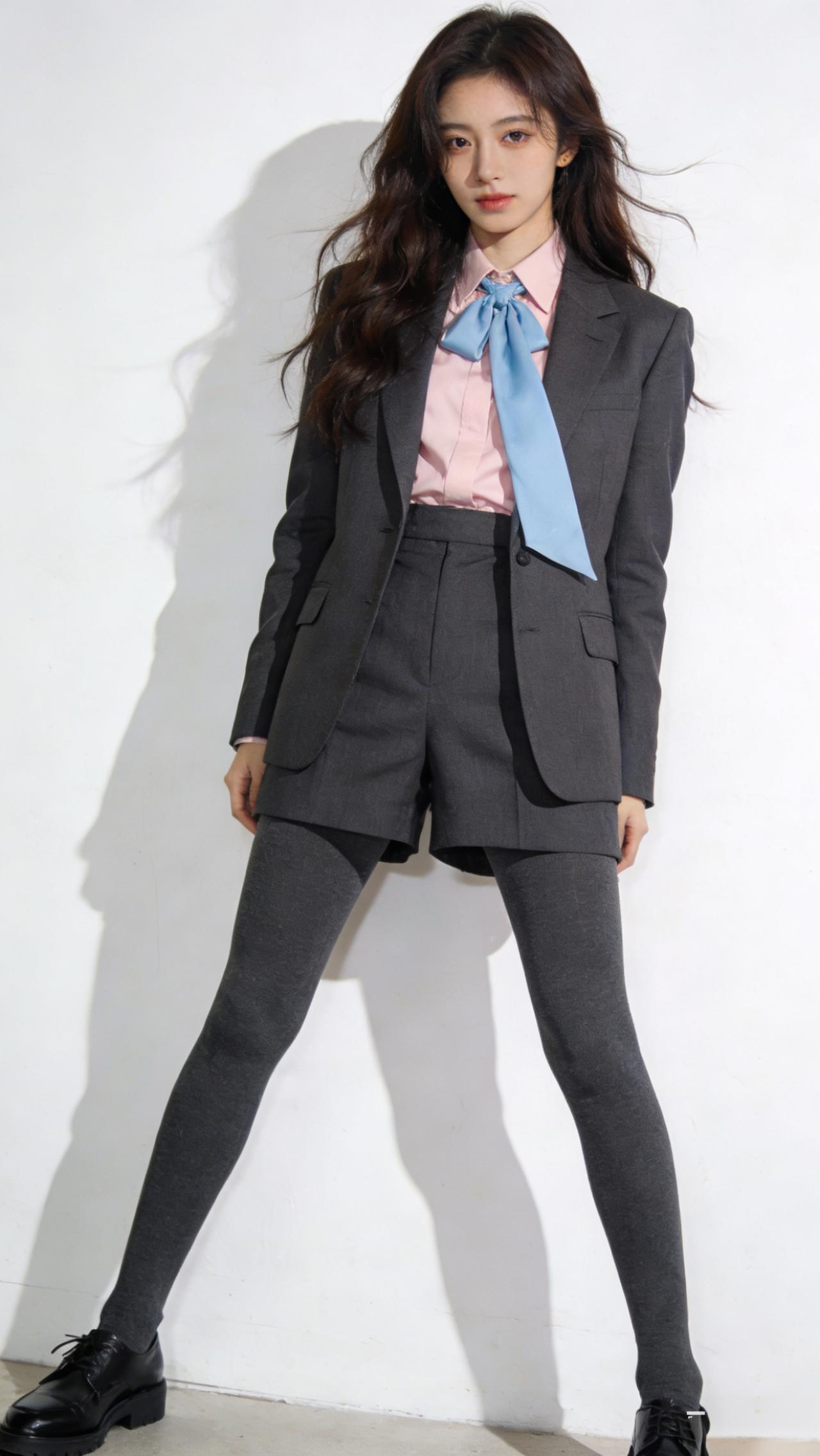 优雅职场风,粉色衬衫+灰色西装,搭配蓝色蝴蝶结,时尚又干练!女孩子怎么穿搭既时尚又好看?