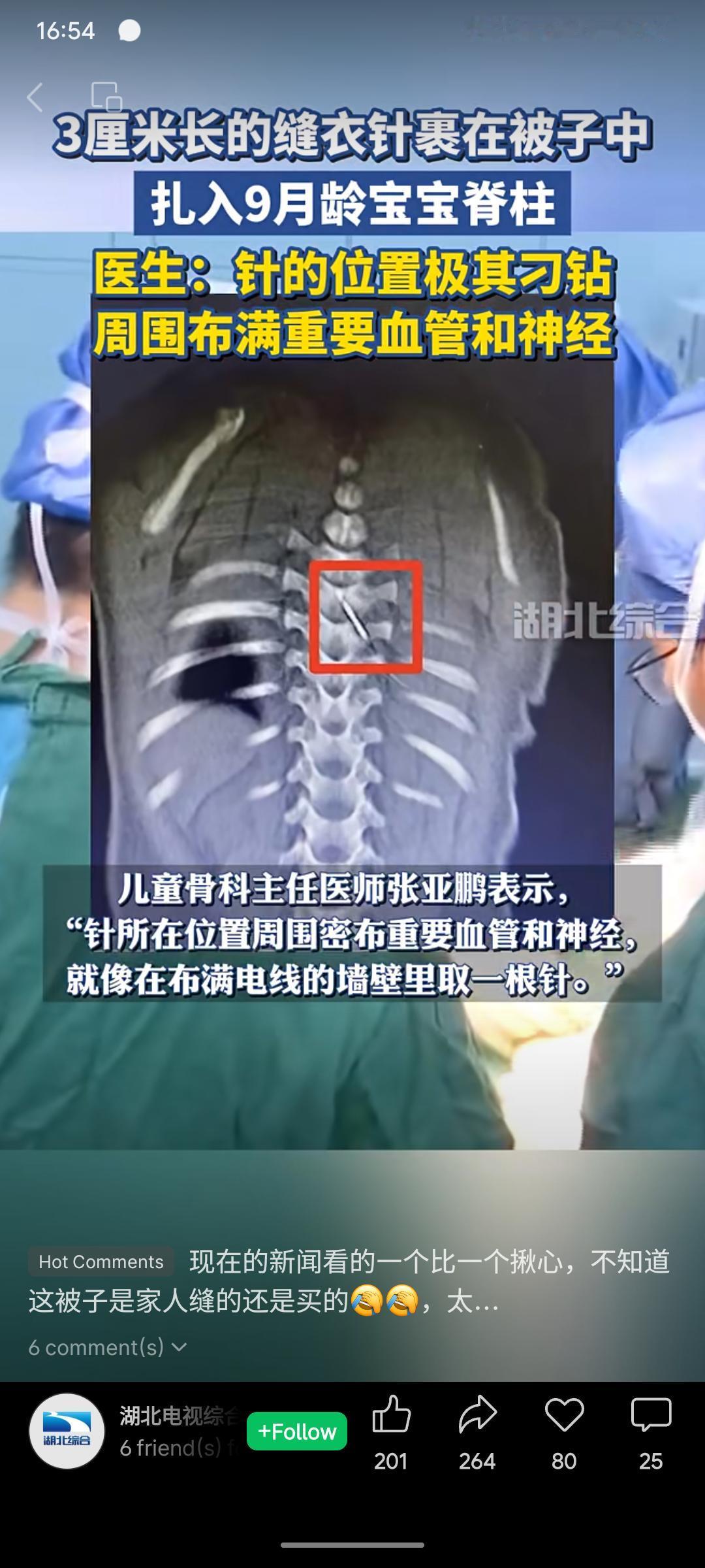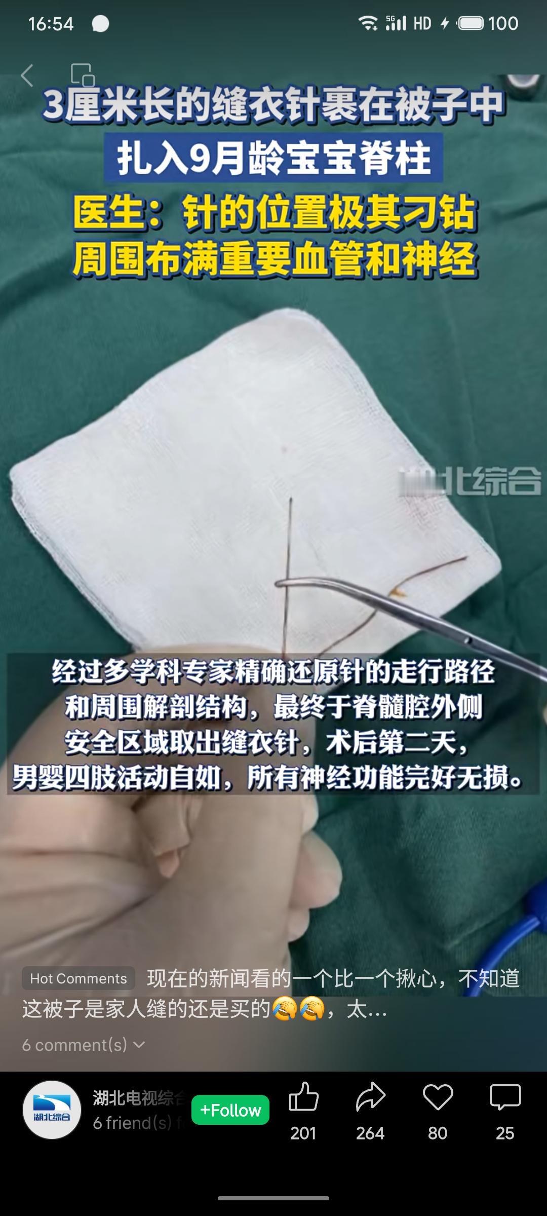 3厘米缝衣针裹于被中,意外扎入9月龄男婴脊柱,位置紧邻重要血管与神经,手术风险极高。经多学科协作精准施术,最终从脊髓腔外侧安全取出。术后宝宝四肢活动自如,神经功能未受损。