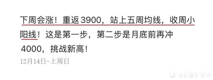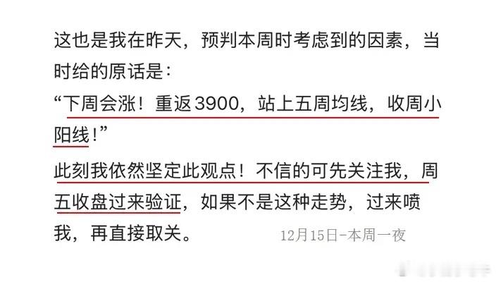 不见风雨,就没有彩虹!这句话在本周股市中演绎的淋漓尽致!尽管没能站上3900,但却在五周均线上方,收出周小阳线!给了所有看空者,一记响亮耳光!早在本周一晚,我就再次强调上周日观点,即本周会重返3900,站上五周均线,收周小阳线!甚至还撂下狠话,先关注我,周五收盘验证,如果不是这种走势,喷完再取关。这非自负,而是看清方向后的绝对笃定。但凡将上周日和本周一晚的内容认真看完,就知道我绝非虚言!因为那两篇内容结合主力动向与资金博弈,从行情到宏观,再从政策到情绪,已将本轮行情律动本质,拆解的明明白白。但也因此,我忽略了短线波动,让周二的那根中阴线,把我打得鼻青脸肿。可这种跌后再跌,连出新低的走势,极易击穿大家心理防线。所以那天我直到夜里才发文,且内容特别,没谈行情,只用一颗真心,稳住大家慌乱的情绪。其中主要提到三点:第一,可不见风雨,就没有彩虹。第二,所谓三浪下跌只是借口,归因都是资金面的换筹,以及让后知后觉的人出局。第三,高手不看技术看大势,这次蛰伏非同寻常,只为将A股旗帜插向更高峰。这种润物细无声的表达方式,只为传递我坚定看涨的信念。但方向归方向,毕竟说了单日预判就得认,尤其从上周一到本周一,我一路看涨,行情却接连创新低。于是我索性整固思路,等周四或周五再和大家聊。此刻,已是周五收盘!日内最高3902.67,而后虽有所回落,定格在3890.45。细节虽不完美,但方向上,确实如我所言,站上了五周均线,收出周小阳线!给了所有看空者,一记响亮耳光!因为上周至今的市场舆情,都以看空为主,表面是从4034至今,技术上出了三浪下跌的形态,给市场蒙上了一层恐慌性阴霾。但真正的杀招,却是既得利益的空头,放大外部利空预期,即前阵子疯炒的日方将在今日加息,或引发全球暴跌之类的言论。以此借套息平仓或外资外流等借口,恫吓部分伪专业资金,放大散户恐慌,持续收割低位筹码。所以我才在12月9日夜里,以长文单篇提到此事,核心论点是:日方从去年至今已加息三次,次次都没引发所谓黑天鹅,这次无非是从0.5%加到0.75%,但在美日汇率上仍有近3个点的套利空间,一般人都不会为了不到1%的收获,放弃近3%的收益。结果今天上午,日方确实加到了0.75%,全球股市不仅没跌,反而普涨。如果这是重大利空,就不存在利空落地转利好。所以就如当时我给的结论所言,这次日方加不加息,根本不值一提。该提的是前两周的不少利好,都因扭曲的看空氛围而埋没,眼下已进入利好密集的堆积期,随便一个引爆点就能再燃行情!比如眼下不仅有降息降准的中期预期,更有俄乌和谈的全球性与全局性的潜在利好。这事早从11月就已提上日程,尤其美方提出28点和平计划后,更为此事注入了实质性进展的信号,现已至最后的谈判节点。不仅因为俄乌双方都有和谈共识,还有乌方已在近期公开表示,不会再加入北约。而此利好一旦落地,我认为起码能让全球股市普涨5个点以上!因为此事不仅能稳住能源波动,降解地缘冲突的前期溢价,更会让市场重估全球供应链预期,而后打开全球经贸与货币宽松的全新空间。到时A股更易触发凌厉大涨,因为主力不会放过这种低成本拉升的绝佳机会。等那时再反应过来就迟了,这也是我坚定看涨的原因之一。因为A股不止是底层逻辑在优化,还有政策托底加长期资金的稳固,会推动科技质变的必然趋势,过程中A股当然有更高概率,走出各方所需的长期慢牛。用超前眼光来看,这已是一种时代性的价值重估。其中蕴藏的机会,自然只属于提前布局,坚持到底的人。但这观点不是所有人都能理解的,因为菜鸟看热闹,高手看门道。而我分享的核心也从不是单日涨跌,而是以此为引,道出行情运行与方向的背后本质,即短线波动不改趋势,方向才是王道!所以这里我再次明确方向,从本年末到春节,再到明年一季度期间,大盘必连破新高,剑指十年前牛转熊的中继顶部4317!过程或仍有波折,但就如前文提到的那句,“不见风雨,就没有彩虹。”看似俗套,却道尽了股市的生存法则。因此我才会在看清方向后,顶住骂声与嘲讽,反复提醒大家别被短线震荡吓跑,要有定力与耐心,终能亲身体会见到彩虹时的幸福。至于质疑,我从不在意,因为我也是过来人,明白那种患得患失的脆弱感。正因如此,我更要拎着真话的大刀,替大家劈开一些别有用心者的鬼话连篇,陪着大家一起,跟着时间见证坚守者的最后胜利!点赞,就是给我分享的动力!