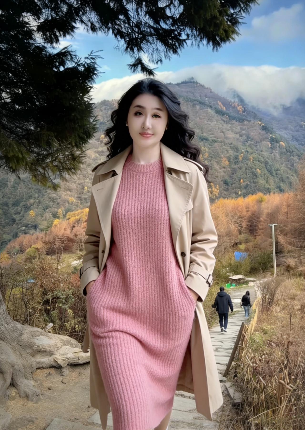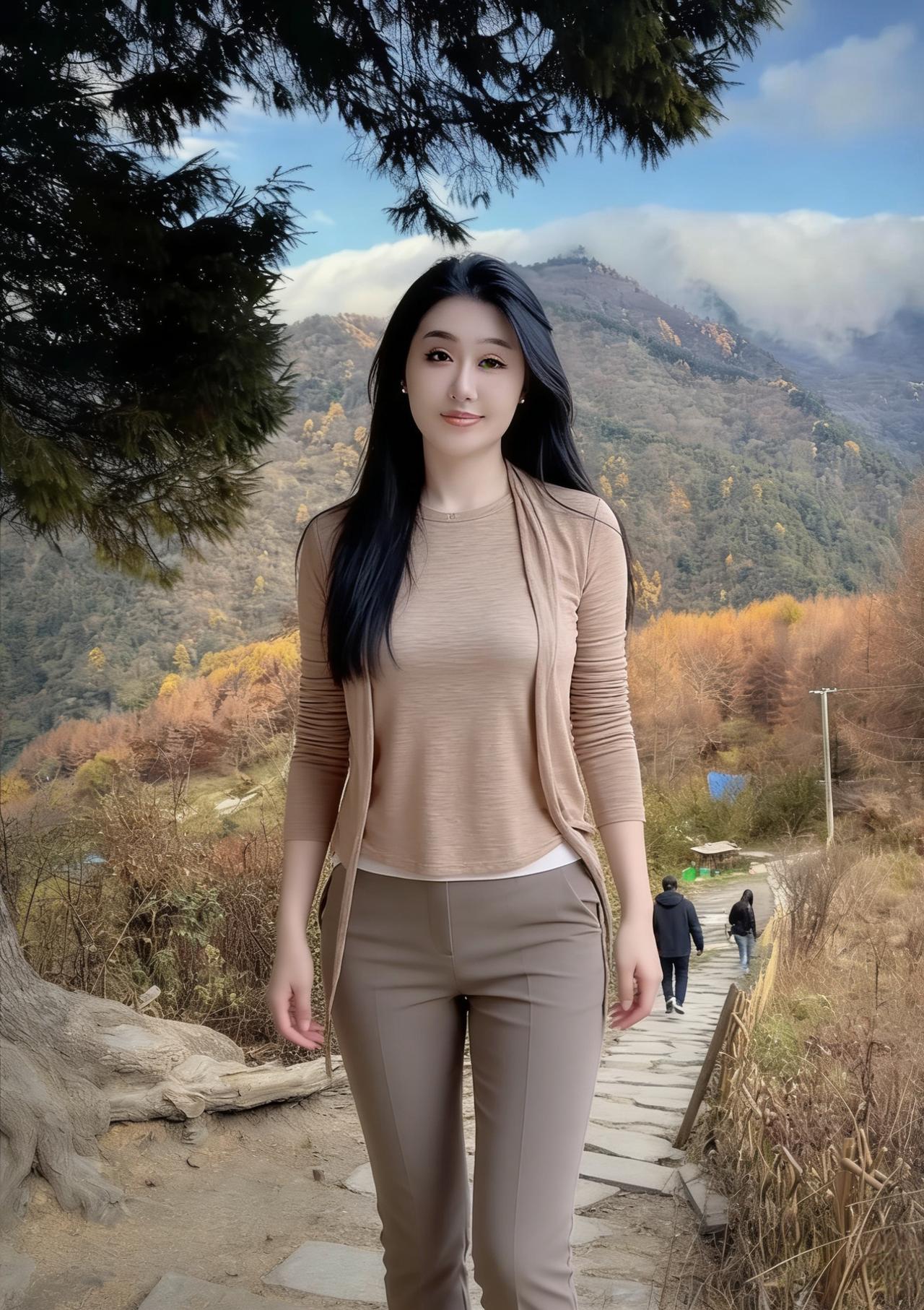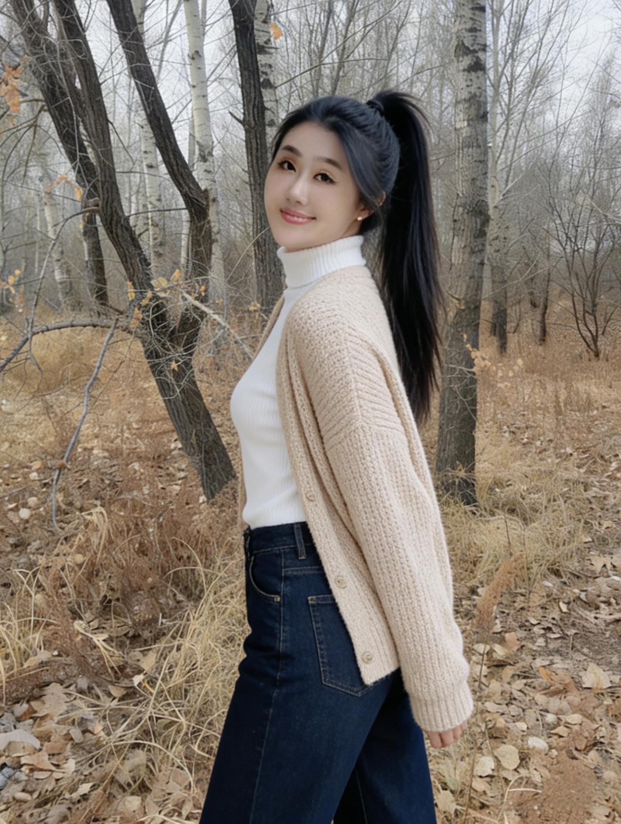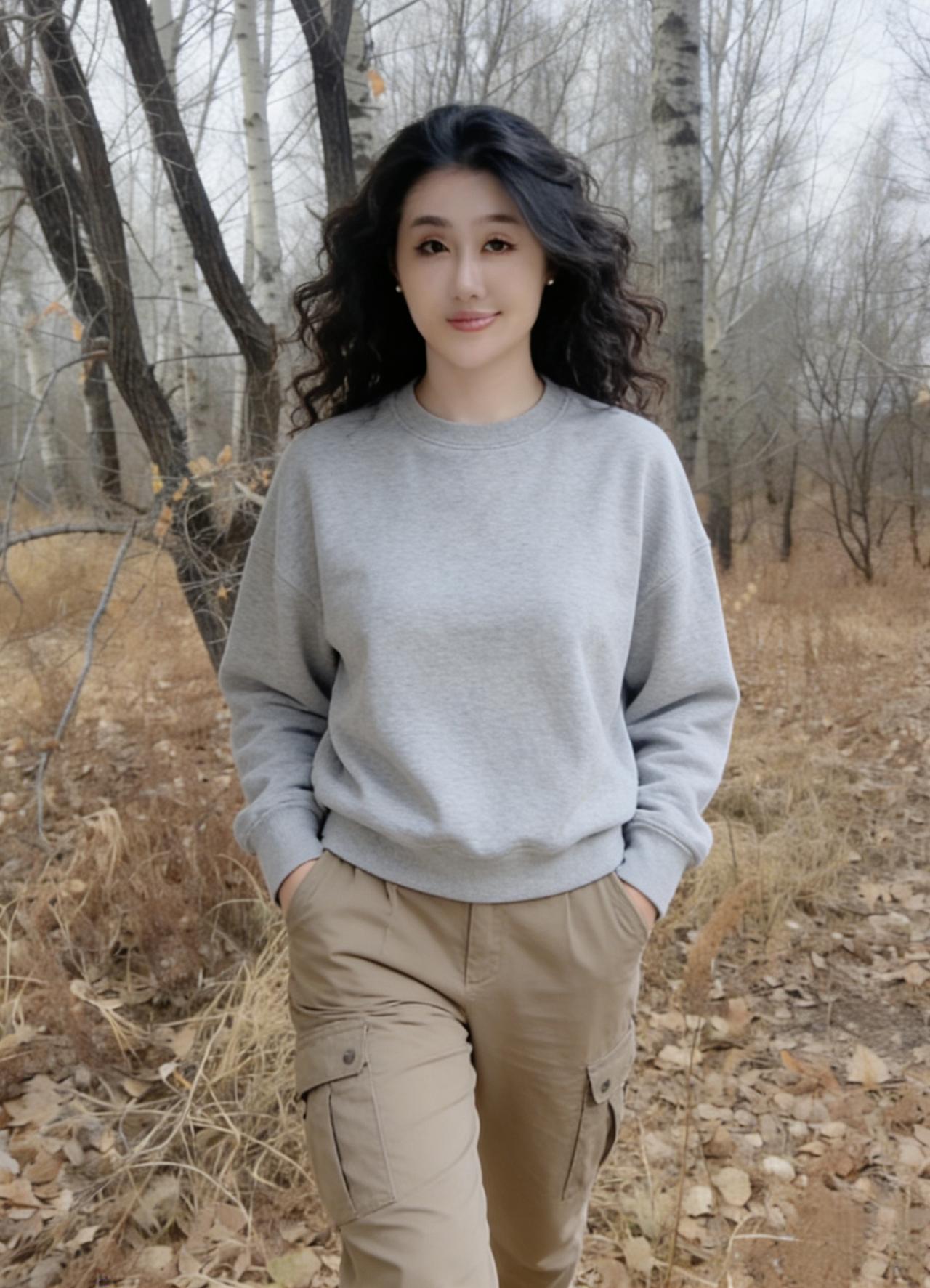 棕衫轻袂立秋林,长发垂肩映素心。 莫道寒林凋落尽,佳人风骨胜春深。