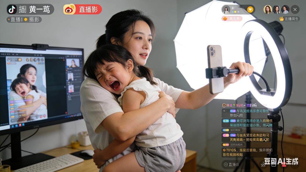 黄一鸣直播遭女儿哭求抱抱:单亲妈妈的两难,戳中千万职场女性痛点 直播间灯光正亮,弹幕滚动不停,黄一鸣刚拿起产品准备介绍,一声软糯又委屈的“妈妈抱抱”突然穿透麦克风。镜头里,两岁的女儿闪闪扒着直播台边缘,红着眼眶反复哀求,瞬间让热闹的直播间陷入温情又心酸的氛围。 黄一鸣下意识转身蹲下,一边轻拍女儿后背柔声安抚,一边无奈向网友致歉:“宝宝闹觉了,稍等一下”。最终她只能一手抱着孩子,一手勉强兼顾直播,小家伙埋在妈妈颈窝的模样,让弹幕瞬间刷屏:“隔着屏幕都心疼”“这就是职场妈妈的日常啊”。这场意外插曲,撕开了单亲妈妈光鲜直播背后的真实困境——她要靠直播撑起母女俩的房租、育儿费等全部开支,却难逃孩子对陪伴的渴求。 更让人动容的是,这个黏人的小家伙早已展现出超越年龄的体贴。此前黄一鸣因长期直播声带结节,闪闪曾拉着她的手说“妈妈不上班了”,稚嫩的话语藏着对妈妈的心疼。这种“依赖与懂事并存”的反差,正是无数职场妈妈的育儿缩影。数据显示,当代家长工作日平均陪伴孩子仅2.61小时,高质量互动占比不足20%,孩子的哭闹不过是对“有效陪伴”的本能索求。 黄一鸣的两难,也是千万女性的共同困境。一边是“赚奶粉钱”的生计压力,一边是孩子成长不能缺席的愧疚,这种平衡难题如今正被“妈妈岗”等政策逐步缓解——弹性工时、托幼配套让职场妈妈不必再做单选题 。但更多像黄一鸣这样的单亲妈妈,仍在独自扛起育儿与谋生的双重重担。 这场直播插曲没有狗血剧情,却因真实戳中人心。无论是聚光灯下的网红妈妈,还是奔波于生计的普通女性,在孩子的哭声面前,都只是想兼顾责任与母爱的普通人。愿每个为生活打拼的妈妈,都能被岁月温柔以待,也愿社会能给予更多包容与支持,让“陪伴”不再成为职场妈妈的奢侈品。 你是否也有过育儿与工作的两难时刻?欢迎在评论区分享你的故事。