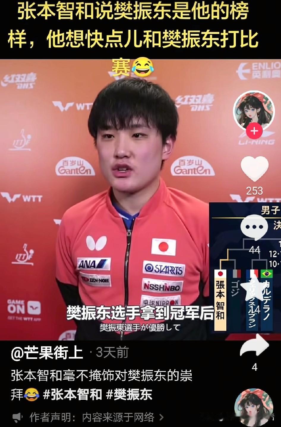 突然就刷到很多人把张本智和和樊振东扯到一起了。这是要给张本智和洗白呢还是要拉樊振东一起下水呢?估计远在德甲,已经离开国际赛事一年半的樊振东都懵了吧!这都不打比赛了,怎么还能把他跟一个刚刚提了高市早苗的人整一块去了呢!真服了这些过度解读的人!
