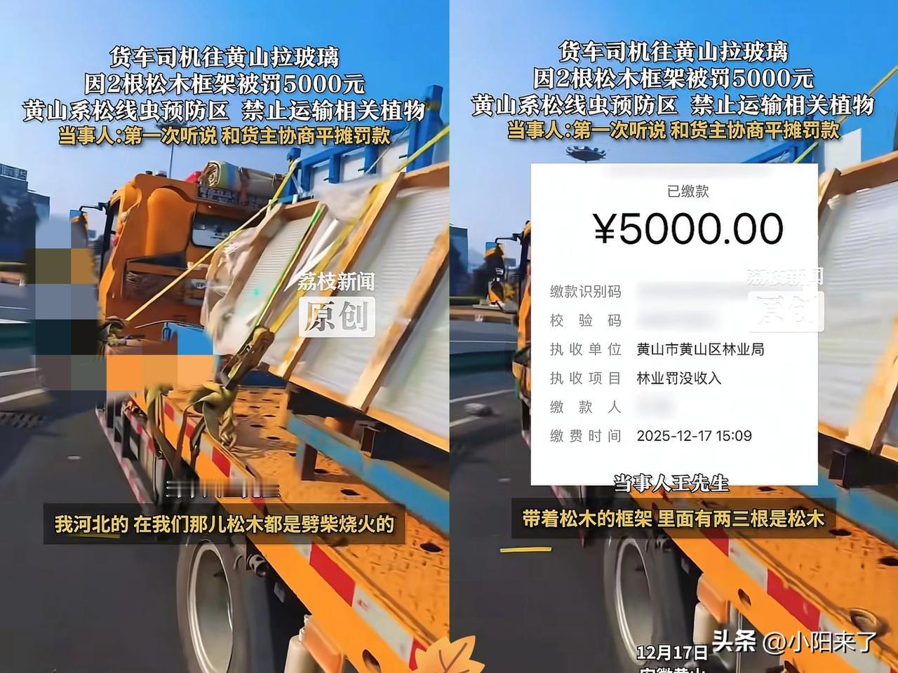 “冤不冤?”安徽黄山,一外地司机来送玻璃,结果下高速时被工作人员拦下,理由是保护玻璃的框架是松木制成的,罚款5000元! 跑一趟活儿没赚着钱,反倒倒贴一大笔,换谁不得憋屈得慌! 很多人不清楚,黄山禁松木入境,是为了防松材线虫! 这虫子简直是松树的“致命杀手”,一棵遭殃整片遭殃,为了护住迎客松和满山松林,这规定确实有必要! 但司机的冤屈没人替他说!他压根不知道这规矩,货主也没提前吱一声! 货运这行,货主明明该主动说明货物包装的特殊禁忌,凭啥要让司机为这种信息差买单? 规矩是死的,人是活的。守护生态没错,但也得让外地司机有处知晓这些特殊规定,别再让老实人吃亏!