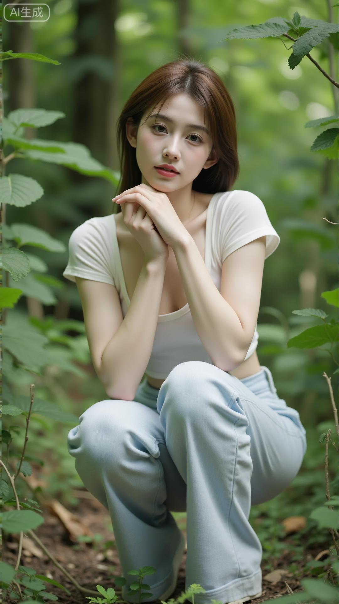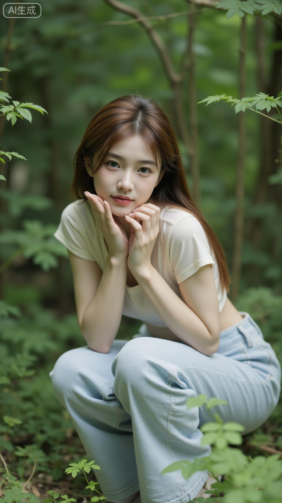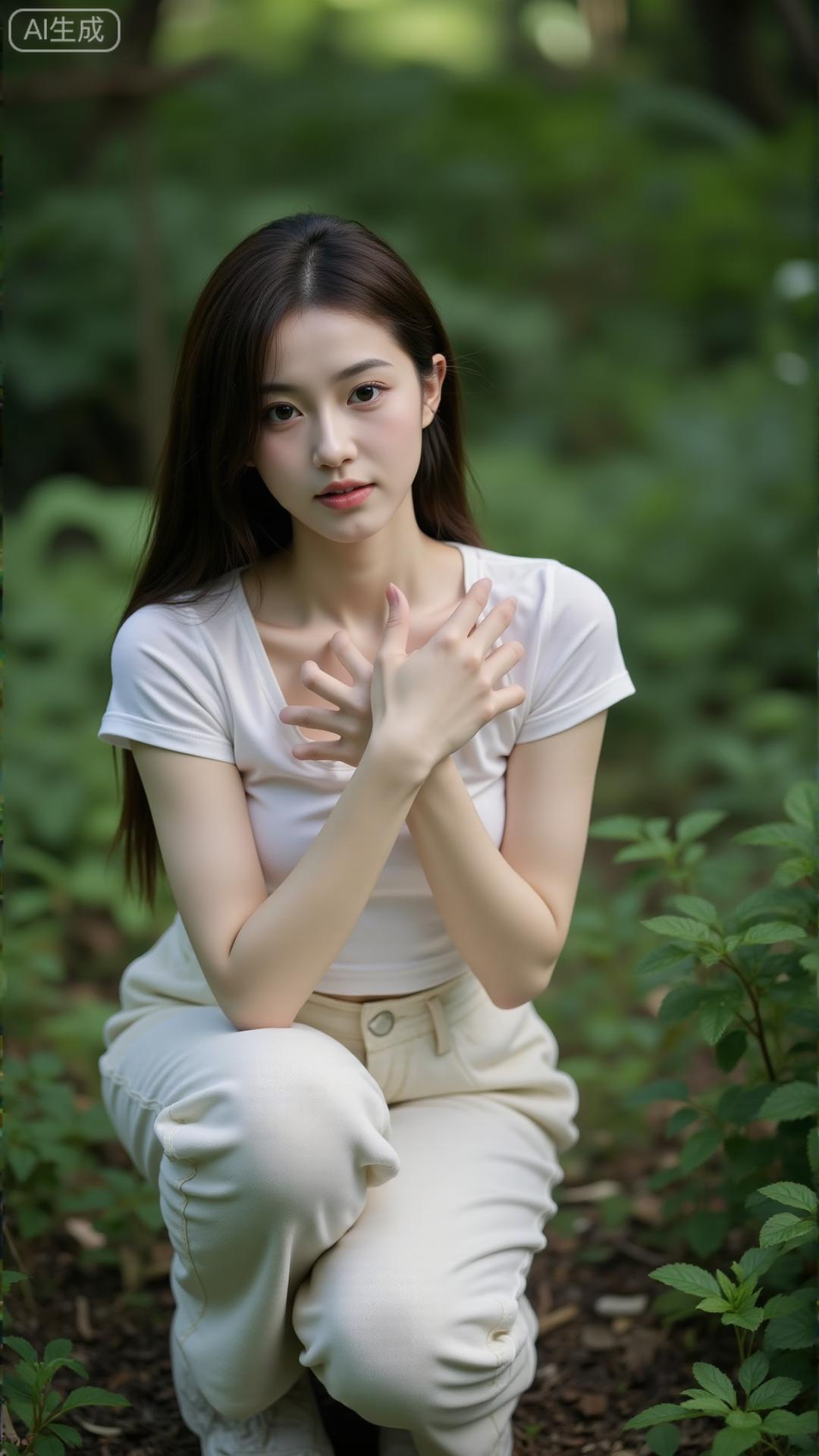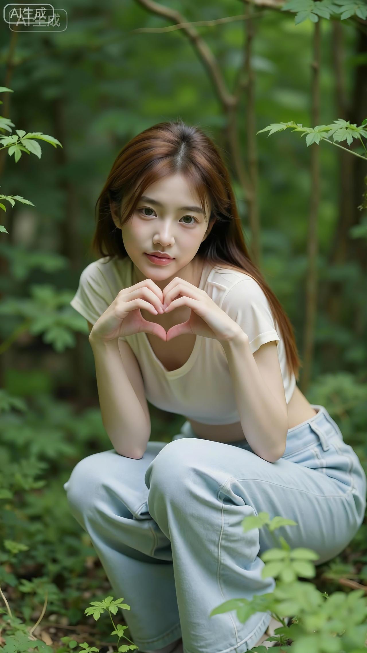 林雾裹着软光,白衫碰了浅蓝裤的甜,指尖叠出心型的暖