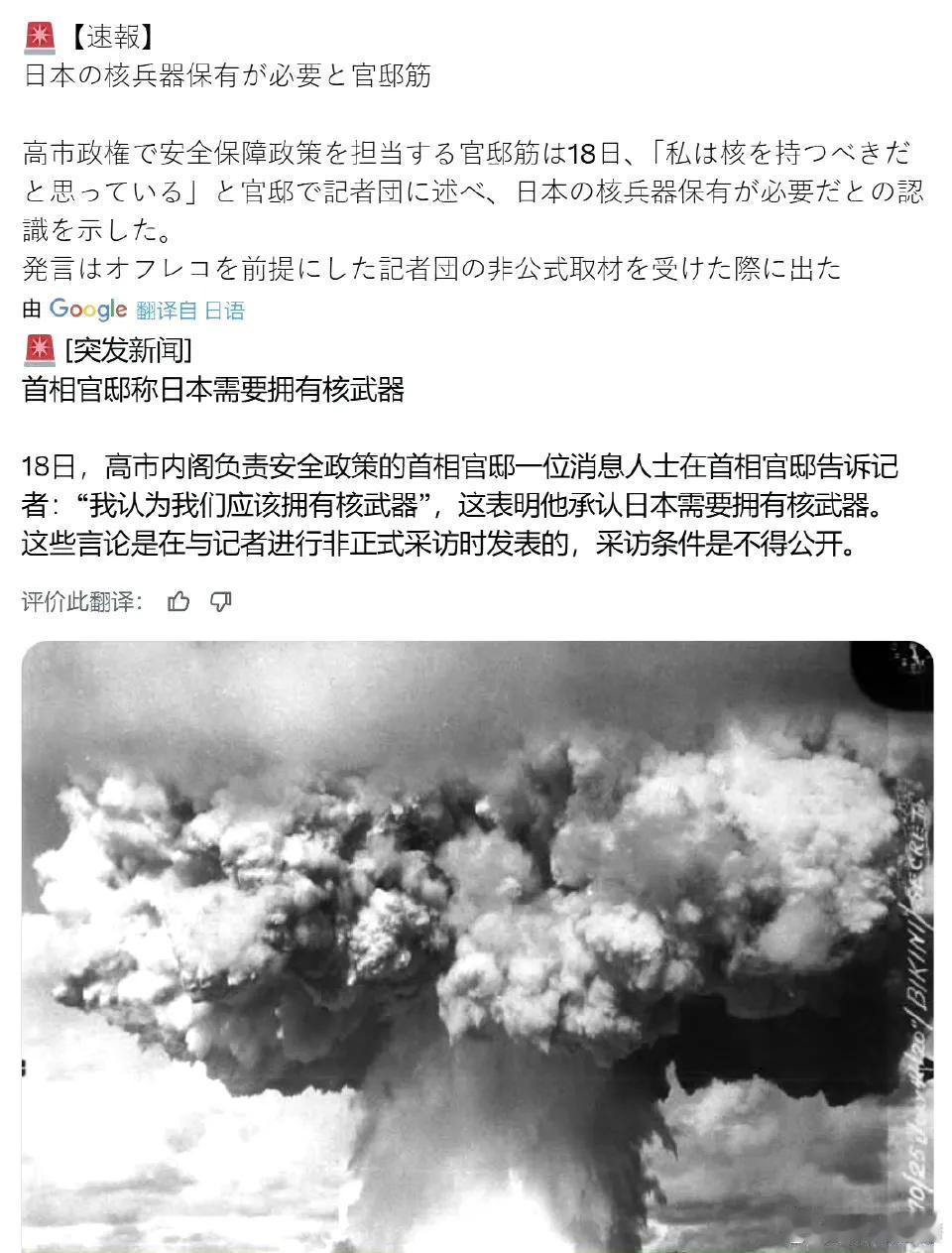 啥?小日子像拥核,这不是把狗头伸过让人砍吗? 尽管没有实际动作,只是口头一说,但这已经犯了大忌,作为二战战败国,说出拥核言论,已经实属大逆不道,任何国家任何国际法都是不允许的。 现在美国想让日本当狗咬我们,所以肯定不会管。考验我们的时候到了,必须要让小日子知道自己在干什么说什么,让他知道要付出什么代价,它想甩掉战败国枷锁这很危险也是不可能的!