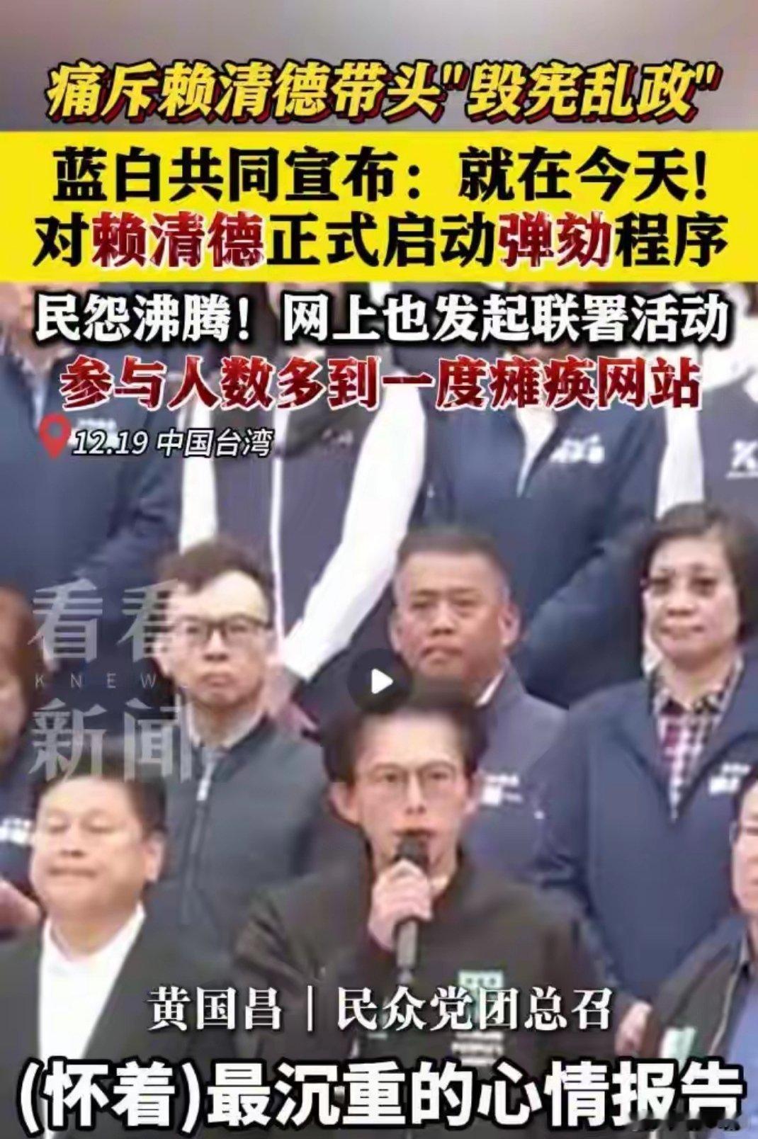 突发公告:国民党、民众党联合通报 弹劾赖清德联署人数破135万 投票平台全线宕机台湾地区一场针对赖清德的弹劾联署活动引发舆论震荡,汹涌的民意参与热潮不仅让联署人数快速攀升,更直接造成投票网站陷入瘫痪。18日早间,该联署活动的参与人数率先冲破百万大关,短时间内的流量峰值瞬间压垮平台服务器,致使系统无法正常运行。前民意代表蔡正元在《中天辣晚报》节目中指出,此次联署的人数增长呈现出“迅雷不及掩耳的爆发态势”。截至18日晚间21时30分,联署活动的累计参与人次已高达135万。不少民众在联署页面留言表态,“已完成签名,对现状早已忍无可忍”,更有声音直言,要让赖清德成为“台湾地区首位遭弹劾的政治人物”。事实上,这场席卷全岛的网络联署,不过是台湾民众对赖清德当局施政不满情绪的一次集中释放,其背后潜藏的深层民意诉求,远不止于此。