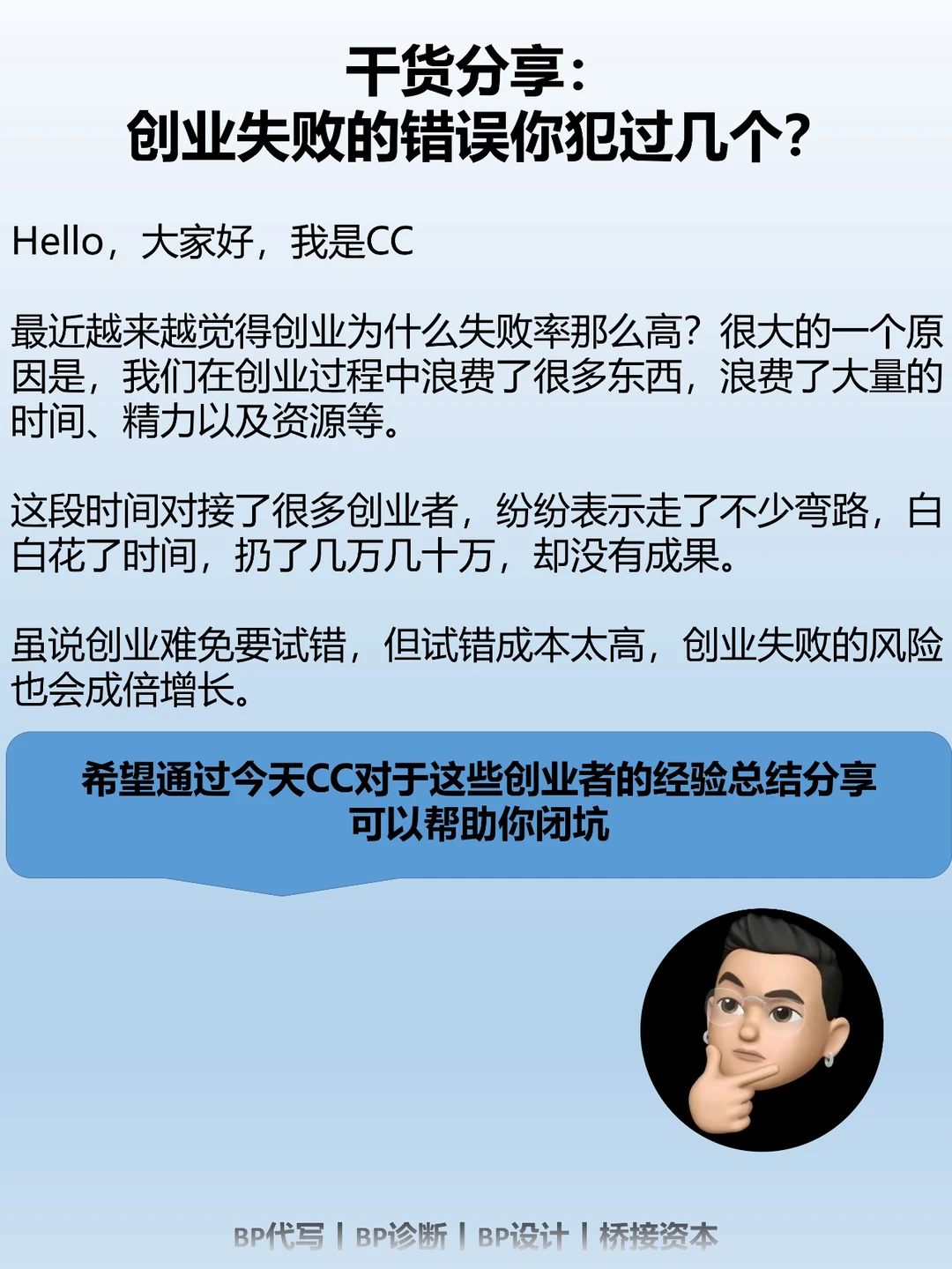 Hello,大家好,我是CC 最近越来越觉得创业为什么失败率那么高?很大的一个原因是,我们在创业过程中浪费了很多东西,浪费了大量的时间、精力以及资源等。 这段时间对接了很多创业者,纷纷表示走了不少弯路,白白花了时间,扔了几万几十万,却没有成果。 虽说创业难免要试错,但试错成本太高,创业失败的风险也会成倍增长。 希望通过今天CC对于这些创业者的经验总结分享 可以帮助你闭坑