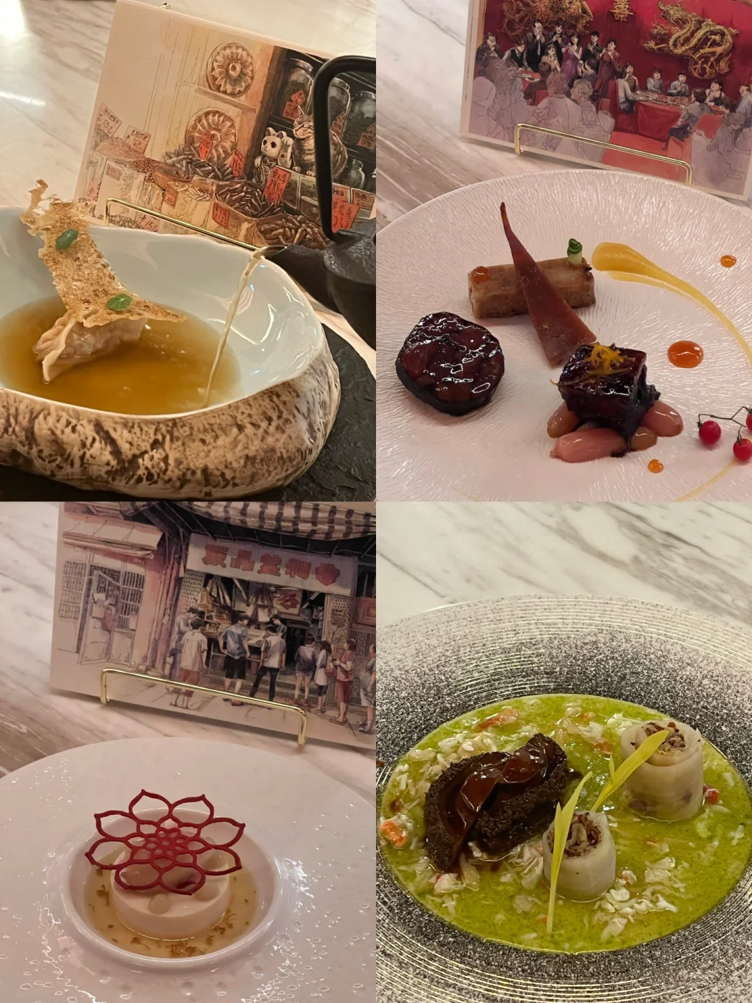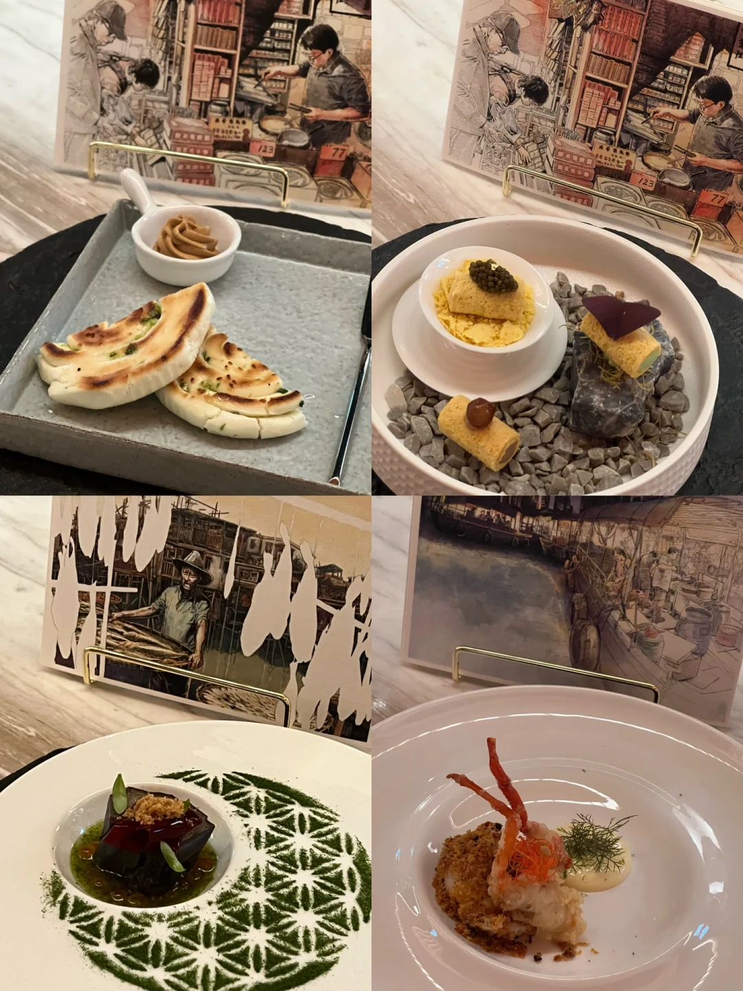 1111的的装修风格好似羚羊谷 店面不大但很有艺术感 - 这里的每道菜都有其背后的故事 之前的菜单是主厨 Will Leung 以香港得奖风景摄影师 Kelvin Yuen 的作品为灵感而创作的一系列 粤菜和香港味道特色fusion菜式 这次的新菜单是与著名香港漫画家合作 以特色香港街头巷尾为故事背景的系列 - 每道菜都会讲述卡片上的故事及创作灵感 前菜葱油饼超好吃 蛋卷爱好者对第二道三种不同口味的蛋卷也没抵抗力 红绕肉和叉烧也不错 全部吃下来真的撑到爆炸 总来说是很满意的 - 🟠店名:1111 ONES Restaurant and Lounge ⏰时间:周一至周六 18:00-0:00 💰价格:$1,288/六道菜和$1,688/八道菜 📍地点:香港中西区中环安兰街18号11楼 - 我太难了…到底怎么码才能不违规[哭惹R][哭惹R] -
