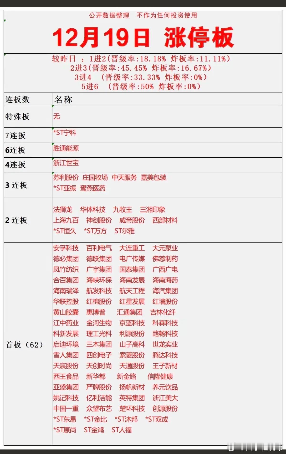 12.19周五 涨停板股票:复盘总结!7连扳 *ST宁科6连板 胜通能源4连扳 浙江世宝3连板 苏利股份 庄园牧场 中天服务 嘉美包装 *ST亚振 鹭燕医药