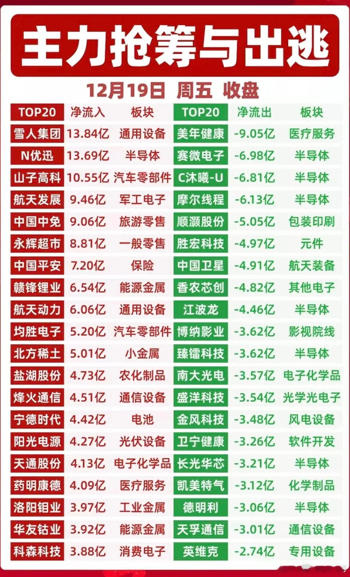 12.19周五 收盘 主力明暗资金 抢筹监测!1.半导体,资金大幅流出2.汽车、无人驾驶,获资金关注3.能源金属,碳酸锂涨幅靠前4.旅游,零售,食品饮料5.保险,稀有金属,尾盘抢筹