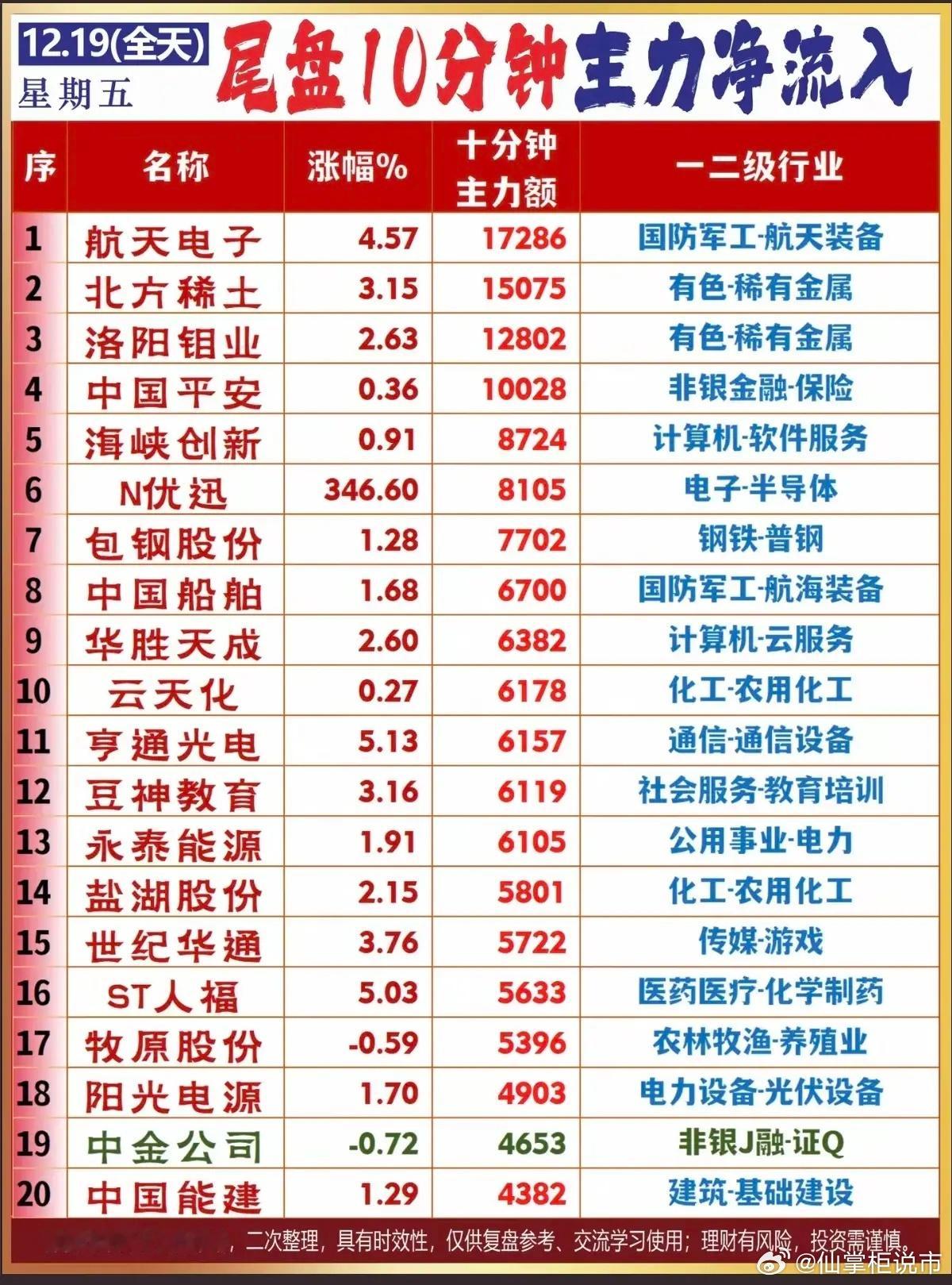 12.19周五 尾盘10分钟主力净流入个股!尾盘抢筹,大资金看好的板块个股榜:1.有色,稀有金属2.计算机软件服务3.通信设备4.国防军工,航天设备5.光伏设备