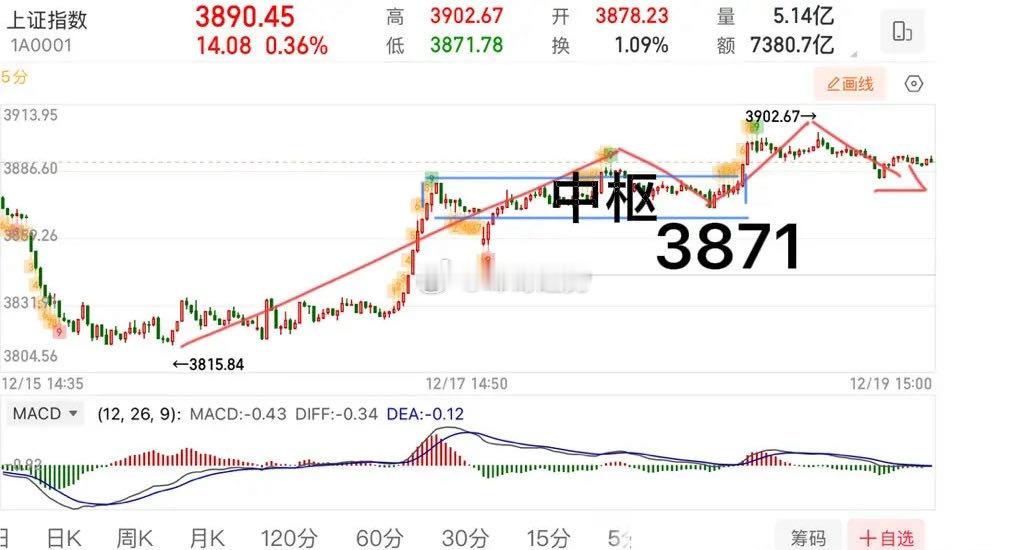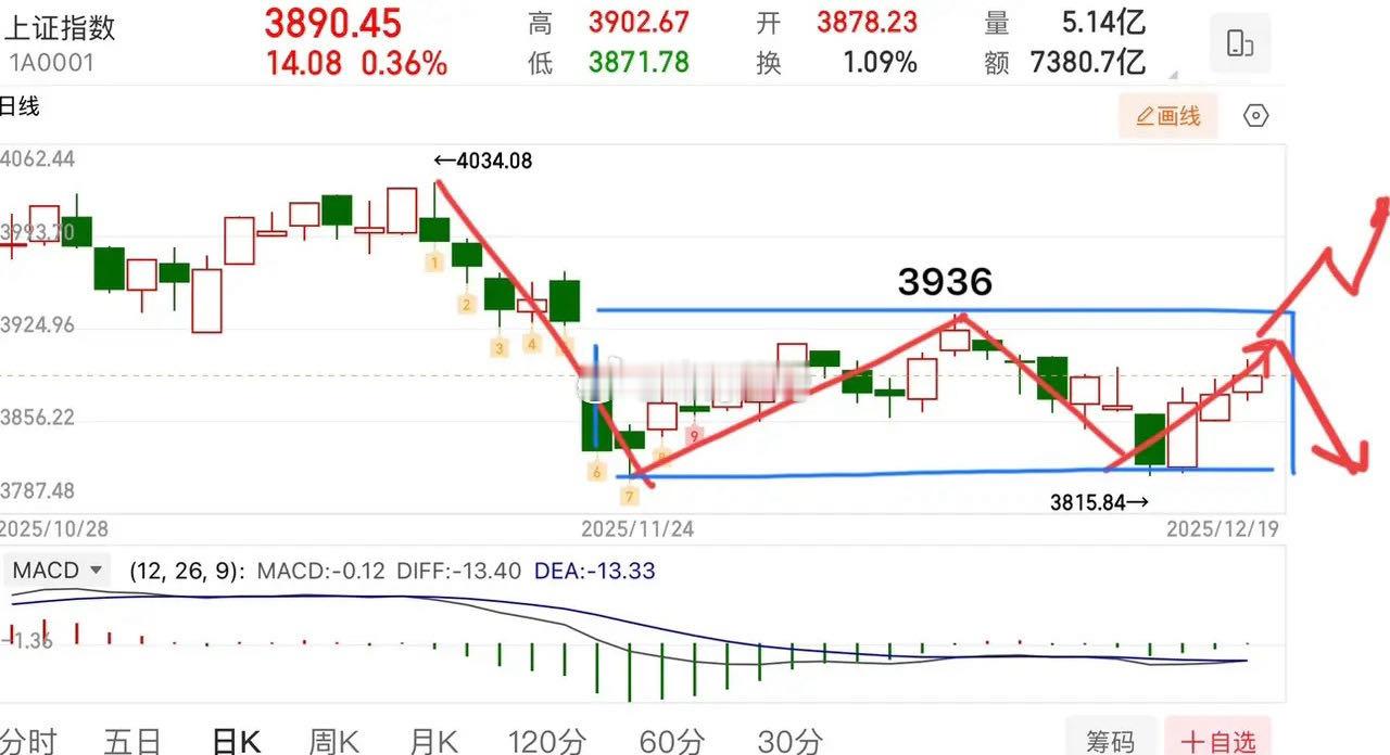 2025.12.19周五收评: 指数三连阳,但方向还未真正选择。 指数来讲,下午没有继续扩大涨幅,核心还是量没有明显放大,说明当下这个位置资金还是不愿意积极进场,说明市场还是得磨。总的来说,指数当前仍处于变盘周期当中,未真正选择方向,日/周均线粘合,还需要等市场共振变盘。 从结构上看,可以看作是中枢区间震荡,上轨3936,下轨3815,当前走势从3815开始的向上反弹,正往上轨3936附近靠拢,后续的关注重点👉走势分类:1.突破站稳3936出3买;2.突破不了则继续围绕中枢震荡,就还有可能再往下考验下轨支撑,图1所示。 短线来讲,图2所示,从3815开始的向上走势,当前运行小中枢内,目前来看走势还处于正常的震荡范畴,3871不破,问题就不大,还有可能继续向上往上轨3936靠拢,从均线的思路看,不破5日线还都是正常的走势。 板块上,当下主流的方向还是大消费、商业航天等,但需要注意的是大消费像零售,爆发之后会有内部分化,尽量不要去追涨,商业航天也是高位震荡分化,关键还是在于个股。 个人观点,仅供参考!A股今日看盘丝芭维权索赔100万被驳回