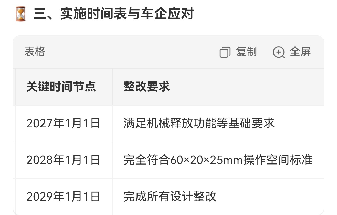 明确禁止全隐藏式门把手新规要求所有非尾门车门必须配备可徒手操作的机械外把手了!即使车辆采用电子锁止系统,事故断电后仍需确保车门可通过机械结构直接开启,整改也有了明确时间表,2027年先达机械释放基础要求,2028年需符合60×20×25mm操作空间标准,2029年完成全部设计整改,车企合规升级进入倒计时!