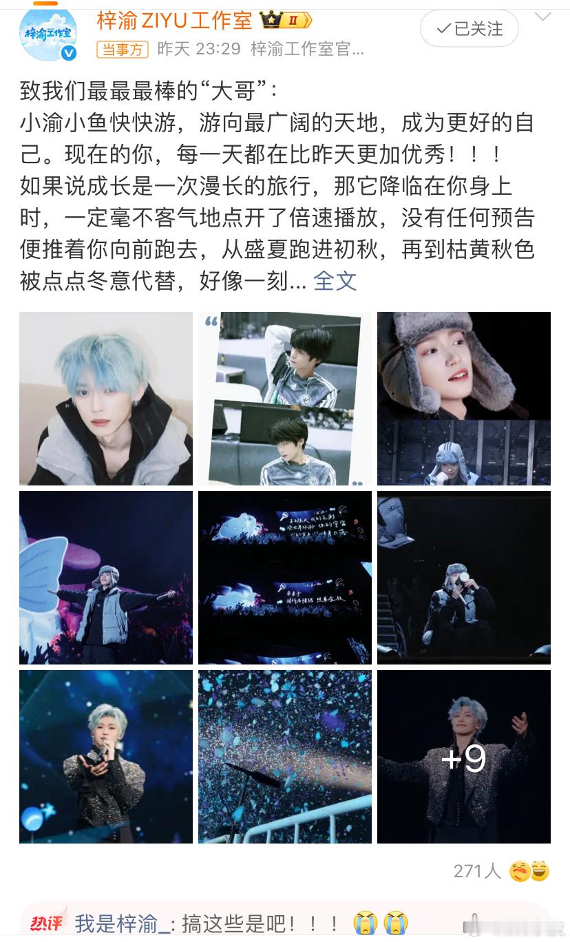 工作室写给梓渝的信工作室叫梓渝大哥,感谢小室用心地记录了梓渝的成长历程,这信写得怪走心的,好真诚的小室看哭了都让我们一起对努力准备演唱会的小渝说一句:辛苦了,你一直一直都是让大家最放心的存在,要更自信一些,你目光所至的前方,一定是永不落幕的朝阳。天地阔,且徜徉。这段旅程还在继续,我们会陪你一起探索这个世界,一起去完成你一个又一个的梦想!00后新生代热点捕捉计划