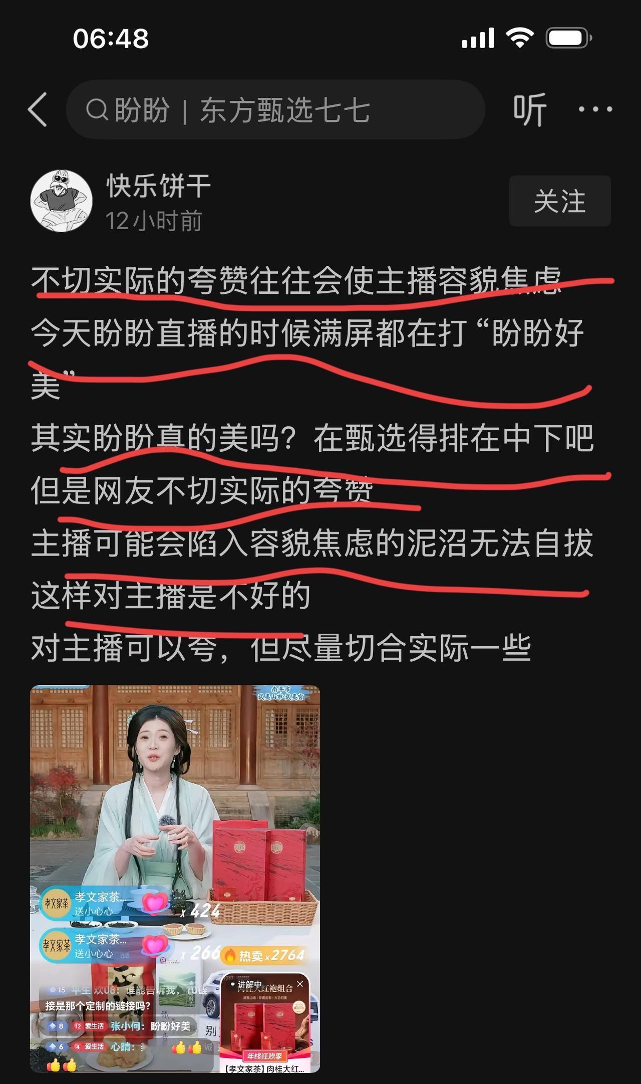 盼盼这次福建外场的装扮很美很仙, 特别是公司给她拍的宣传视频, 一身湖蓝色的长裙, 一把纸伞,一转身,一回头, 宛若林间精灵, 简直就是仙气飘飘。 “巧笑倩兮、美目盼兮”这两个词被盼盼具象化了。 可是那个什么“快乐小饼干”却不愿意了, 她说盼盼的颜值以前在老东家那边, 只能算是中等。 也许以前的盼盼的美不是不出挑, 而是没有被“突出”, 她的才华和颜值一直被“雪藏”。 也许盼盼以前在老东家那边真的是不出彩, 现在蜕变成了一个大美女, 这是意味着老东家那边风水不好? 还是与辉同行的水土更养人? 盼盼的美不美, 这不是你能定义的, 一切还得大家评判。 美丑这个问题, 每个人都有自己标准。 有的人眼里胖为美, 有的人眼里瘦为美。 美不美, 也得看和谁比, 和刘亦菲比, 盼盼的确比不上, 但是和你们一姐比较, 和数字主播比, 和背手姐比, 在我眼里盼盼美的是倾国倾城。 盼盼一张国泰民安的脸, 一双会笑的眼睛, 不胖不瘦的身材, 这还不够吗? 盼盼有颜值焦虑吗? 肯定没有, 因为人家还年轻着呢? 正值青春年华, 已经很美了, 还焦虑个啥。 不信你看盼盼一头浓密的头发, 发际线也很正常, 起码上播不需要戴假发片。 当然, 盼盼没法和娇滴滴的, 眼神拉丝的圆圆比。 话说像圆圆这样有颜值有能力有手段的美女, 实属凤毛麟角, 能有多少呢? 也只有你们高大上的上市公司, 才配拥有圆圆。 盼盼没有颜值焦虑, 散会! 董宇辉 与辉同行
