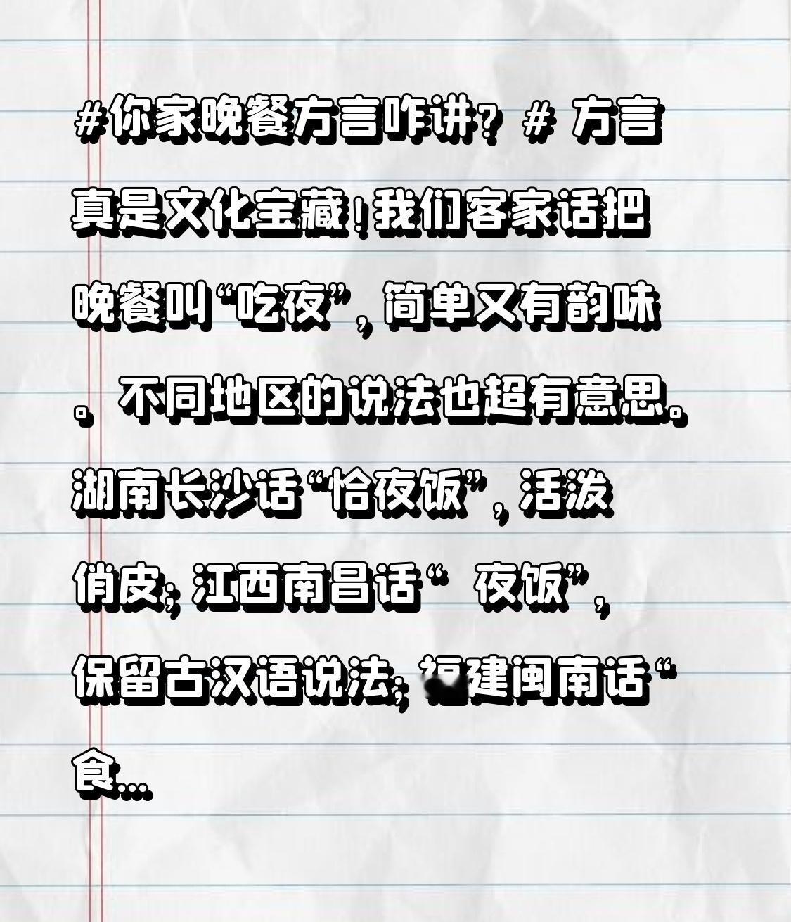 方言真是文化宝藏!我们客家话把晚餐叫“吃夜”,简单又有韵味。不同地区的说法也超有意思。湖南长沙话“恰夜饭”,活泼俏皮;江西南昌话“喫夜饭”,保留古汉语说法;福建闽南话“食暝”,简洁表意。 山东济南话“揍饭吃(晚上这顿)”,实在接地气;安徽安庆话“吃夜之饭”,念起来有别样风味。吴语区的上海话、苏州话“吃夜饭”,一个软糯,一个温婉。粤语区广州话“食晏饭”,“食”字常用。方言体现着各地文化,太有趣啦!