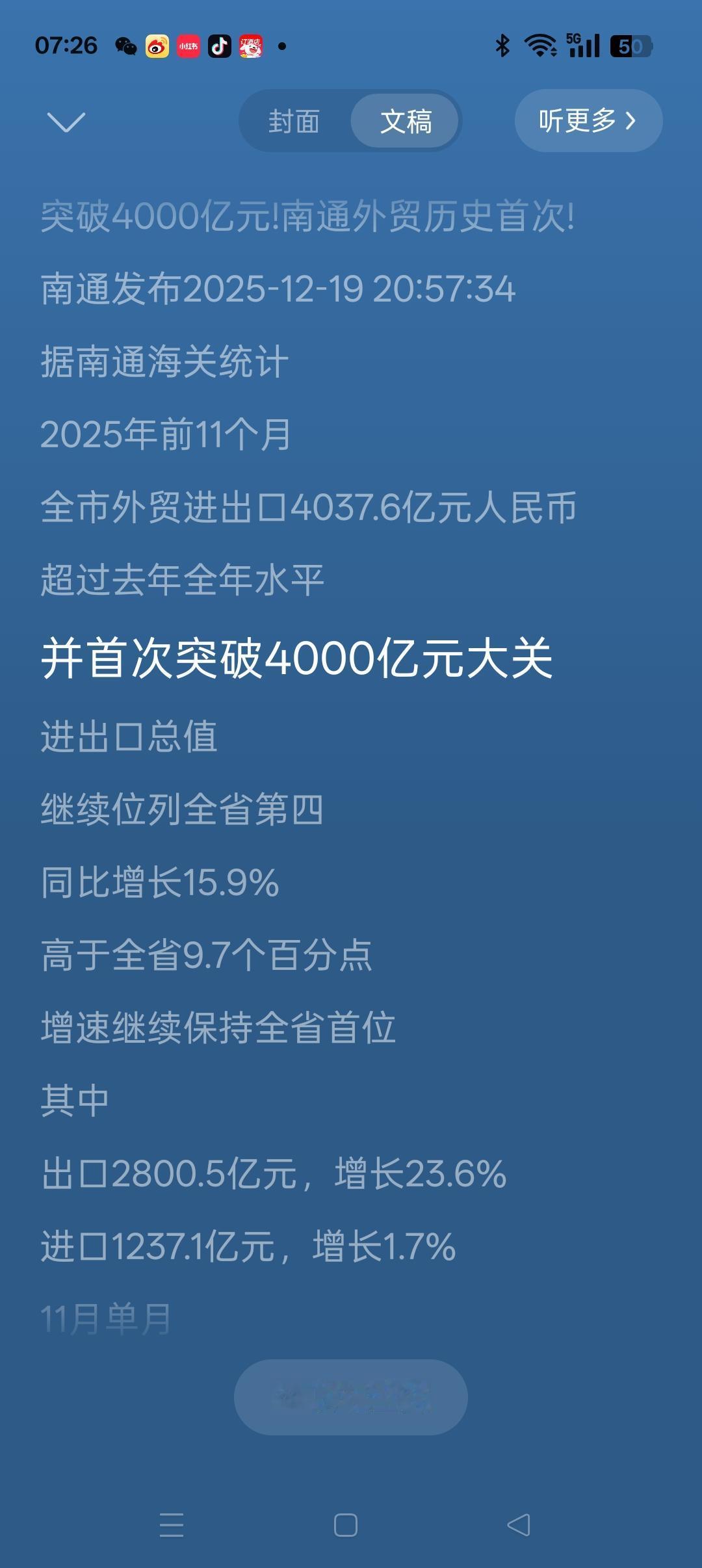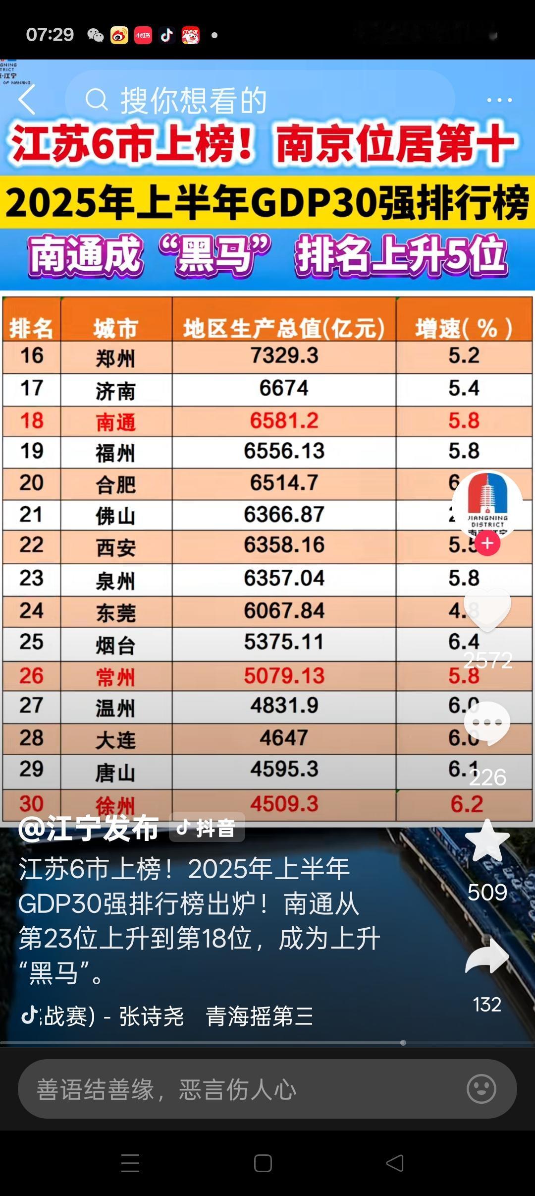 南通2025年全年经济发展预评估 南通市2025年前三季度地区生产总值(GDP)为9788.9亿元,按不变价格计算,同比增长5.4%,高于全国水平(5.2%)。而在上半年,南通经济则发展迅猛,GDP增速达到5.8%,GDP30强排名也从第23位上升到第18位,足足提升了5个位置,成为一匹上升的黑马。而在第三季度,GDP增速却回落到4.8%,足足下滑了一个百分点,排名也回落到第21位。全年GDP预计可达到1.3万亿元,较上年同期增长4.8%,排名重回2024年的第23位,十四五规划指标完成率约为96.48%。 第三、四季度增速放缓的主要原因包括外部环境复杂严峻、国内结构调整压力较大,以及部分政策效果边际递减等因素。例如,上半年宏观政策靠前发力支撑经济良好表现,但下半年政策力度相对减弱,对经济的托底作用减弱;同时,居民消费意愿有待提振,房地产投资持续低迷,也影响了整体增速。 尽管GDP增速有所放缓,但南通经济仍保持增长,全年预计规模以上工业增加值同比增长7%左右,高技术制造业增加值增长11%左右,特别是出口增长迅猛,增幅高达23%左右。1-11月份,进出口总额首次突破4000亿元大关,增速高于全省平均增速9.7个百分点,增速位居全省之首。 同时南通的海洋经济也得到蓬勃发展,1-11月份南通出口大型船舶增长101.6%,大型海工产品增长107.2%,均居全国地级市之首,船舶、海工产品的订单已经排到2028年及2030年,且正向高、新、全、优方向发展,显示南通的经济结构持续得到优化,发展潜力巨大 。