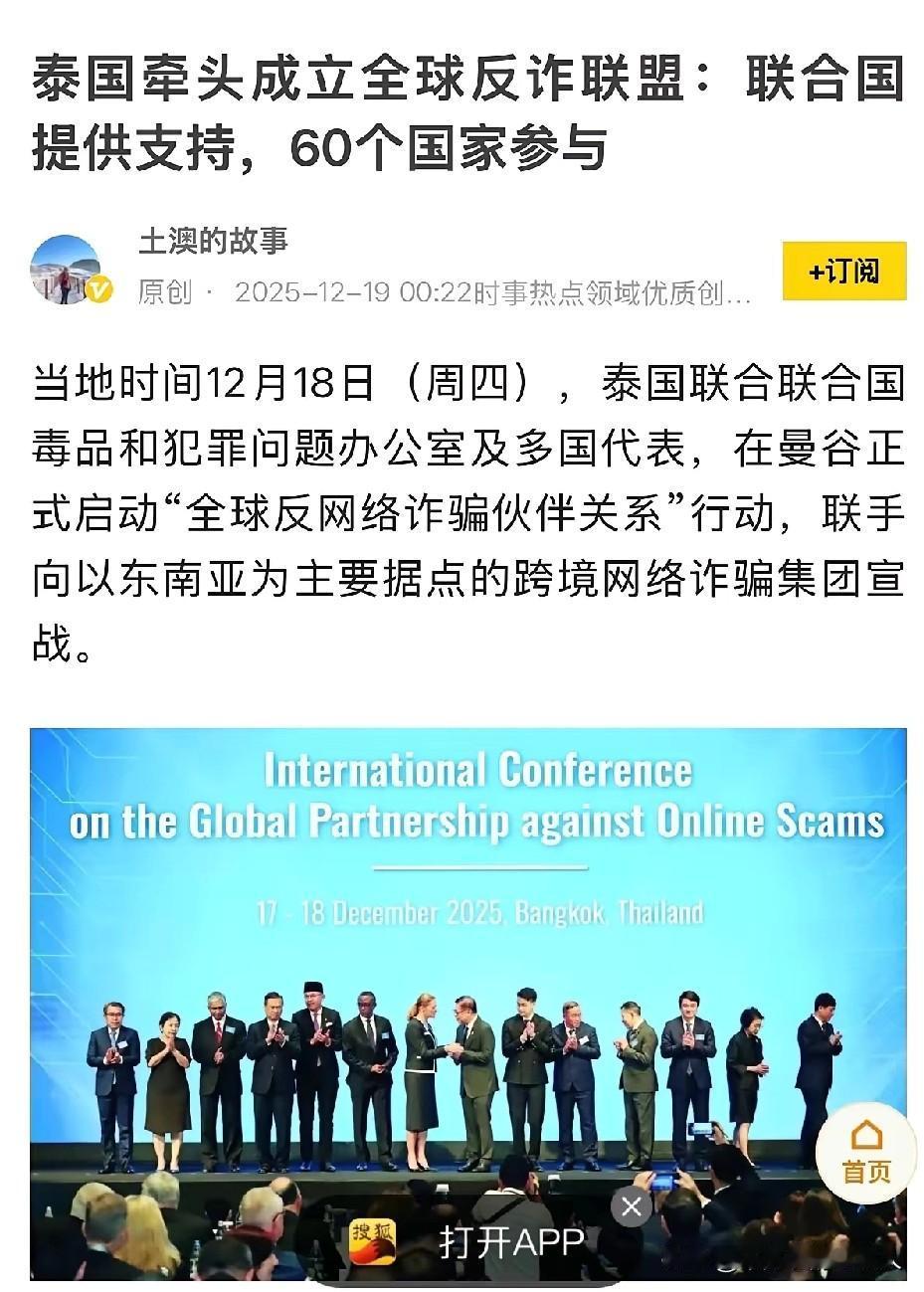 这次真得给泰国点个赞。 当地时间12月18日(周四),泰国外交部与联合国毒品和犯罪问题办公室(UNODC)联合主办国际会议,于曼谷正式启动“全球反网络诈骗伙伴关系”行动,携手向以东南亚为主要据点的跨境网络诈骗集团宣战。 不得不说,泰国这招十分高明,硬是把一场领土争端战争转化成了正义的打击电诈行动。泰国通过高举打击全球公害——网络诈骗的旗帜,瞬间占据道德高地,不仅有联合国助力,还有60个国家响应参与。 会议直接针对以东南亚为据点的犯罪集团。柬埔寨作为被点名的诈骗中心之一且未参会,在舆论和外交上陷入被动。本就难以抗衡,如今在舆论和道义上都处于劣势,接下来就更艰难了。 电诈的危害已引起全世界高度关注。据联合国估计,2023年全球诈骗受害者损失高达180亿至370亿美元。诈骗犯罪常与人口贩运、强迫劳动等其他严重犯罪相关联。 我们中国也是此次会议的积极参与方,Meta、TikTok等科技公司也参与支持,成为首批私营部门成员。所以,泰国牵头成立的全球反诈联盟,对我们中国老百姓来说绝对是好事,以后能少受电诈侵害。