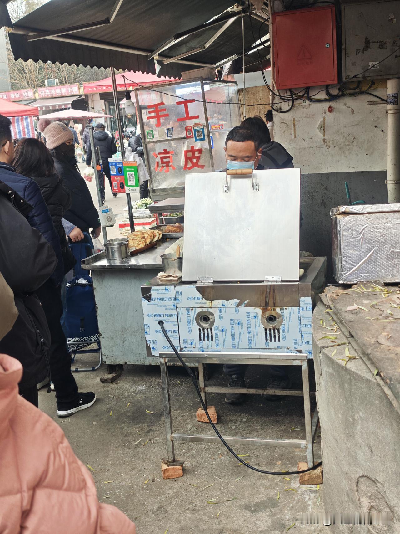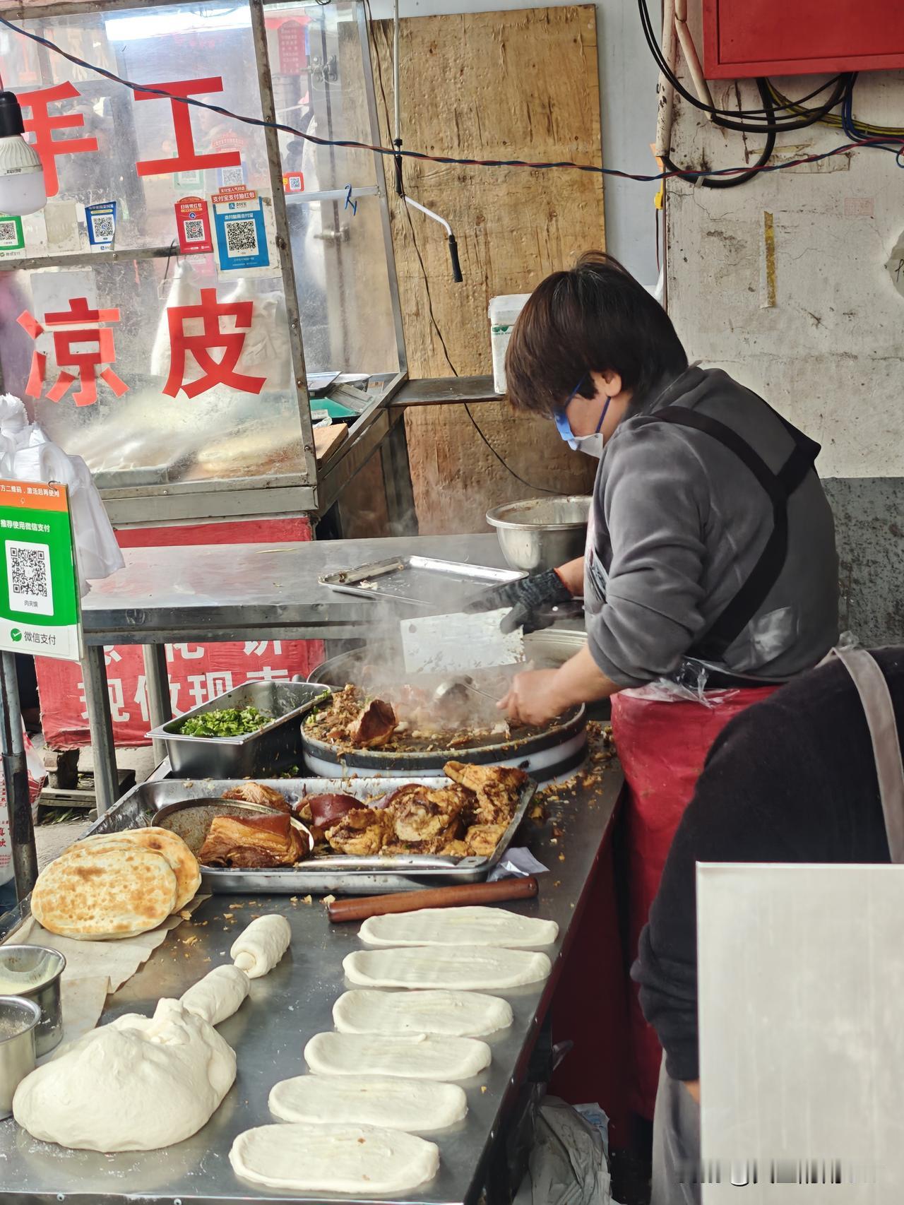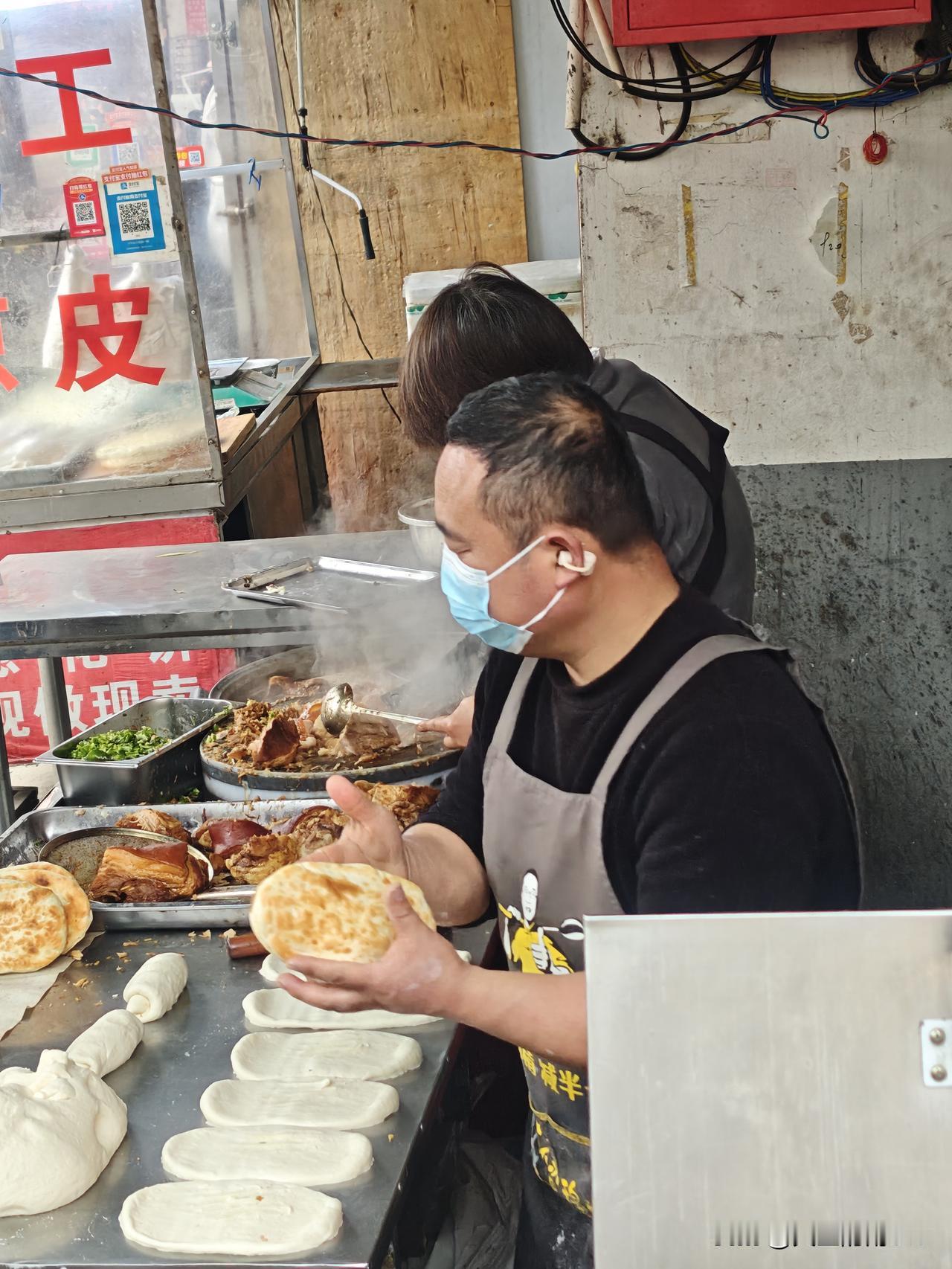 今天早上没事去西航花园菜市场逛逛,发现一家小店卖肉夹馍的竟然排队。我也就跟着排队,买一个尝尝。
