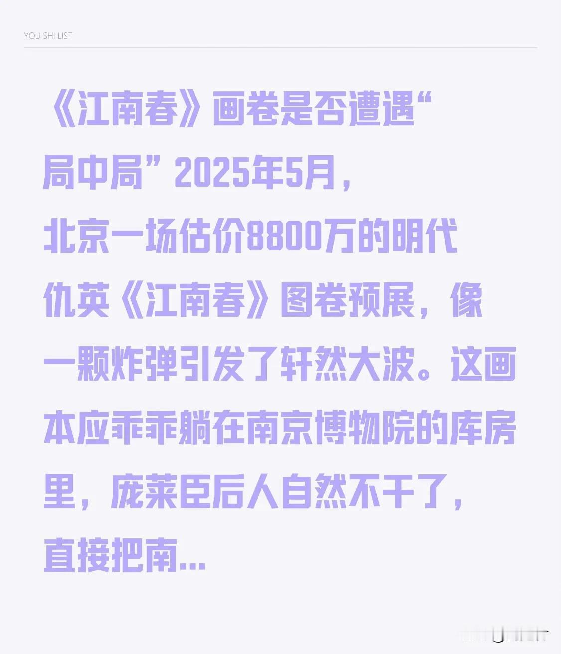 《江南春》画卷是否遭遇“局中局” 《江南春》画卷是否陷入“局中局” 2025年5月,北京一场估价8800万的明代仇英《江南春》图卷预展如炸弹般引发轩然大波。此画本应存于南京博物院库房,庞莱臣后人不满,直接将南博告上法庭。 上世纪50年代,庞家后人向南博捐赠不少古画。多年来,他们多次要求查看藏品,直至今年6月查验,发现《江南春》等5件古画不见踪影。南博称这些均为伪作,早已处理,并出示上世纪60年代鉴定为“伪作”的记录。奇怪的是,多年纠纷中这些关键证据为何一直秘而不宣?《江南春》是否遭遇“局中局”,背后有无暗箱操作,着实令人怀疑。 仇英作品价格 江南百景园仇英 江南画作