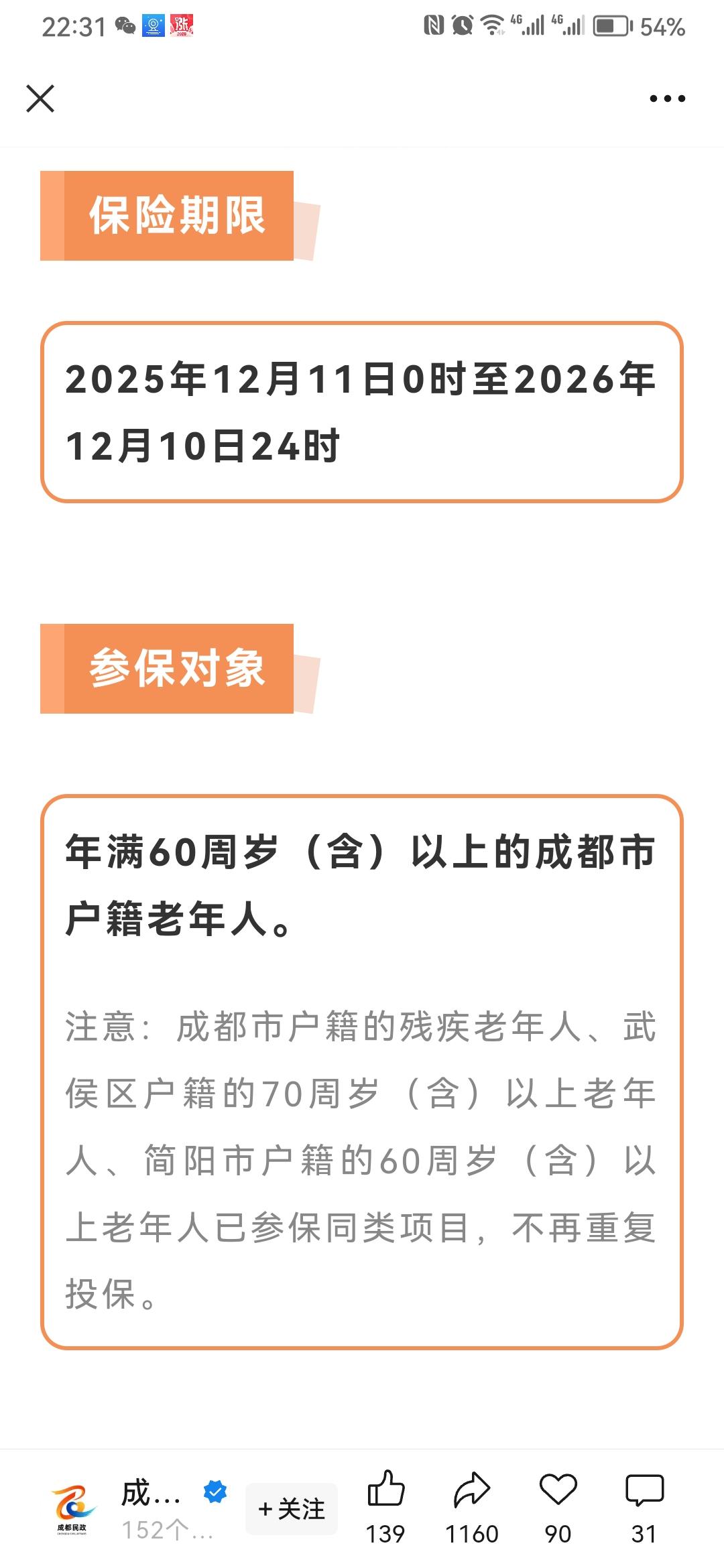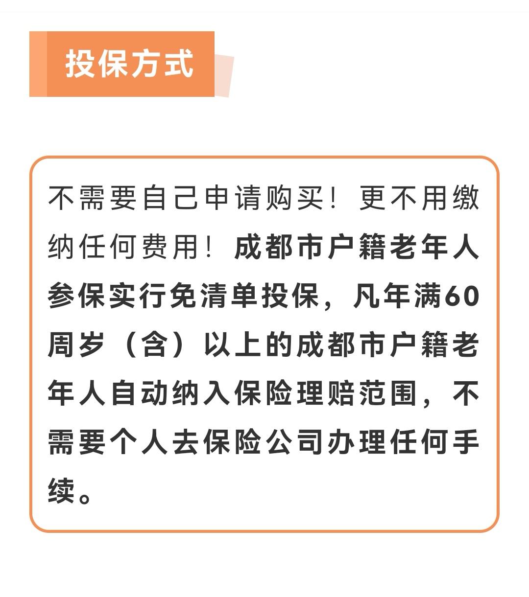 成都户籍年满60岁的老年人注意了,不需要自己申请购买!更不用缴纳任何费用! 因为,成都市已为你们准备了一份保单。 话说,2024年12月,成都为全市户籍老年人购买了一份意外伤害保险,一年来,这份保障已理赔支付3500余万元,为老年人带去一年心安! 今年,这份 “平安保障” 准时续档! 投保时间从2025年12月11日0时起,至2026年12月10日24时止,参保对象为年满60周岁(含)以上的成都市户籍老年人。 投保方式出乎意料,不需要自己申请购买!更不用缴纳任何费用!成都市户籍老年人参保实行免清单投保,凡年满60周岁(含)以上的成都市户籍老年人自动纳入保险理赔范围,不需要个人去保险公司办理任何手续。 这份保单希望你们永远也用不到,如果不幸遇到了也可以给你兜一个底! 你们说,成都是不是一个温暖的城市了?