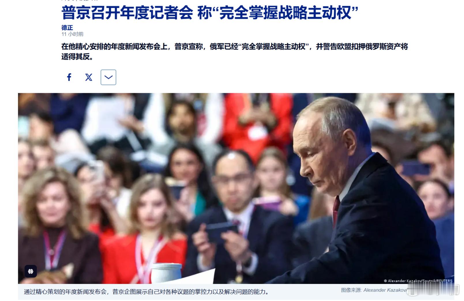 普京召开年度记者会,称“完全掌握战略主动权”。普京强调,俄罗斯部队正在乌克兰战场推进,并表示如果基辅不同意俄罗斯的和平谈判条件,克里姆林宫有信心通过军事手段实现目标。请大家记住:苏联解体后,俄罗斯人当时是普遍亲西方的,包括普京!他们为了融入西方付出了解体休克的代价,对北约东扩都一让再让,积极推动俄罗斯加入欧洲的各种组织,希望成为西方的一员。换来的是什么?西方公开支持俄罗斯的分裂势力、在俄罗斯境内和周边国家搞颜色革命、把俄罗斯的邻国都培养成俄罗斯的敌人,跟同源同种的兄弟之国反目成仇,被制裁围堵至今。如果你是普京,或者任何一个把国家和民族荣誉和利益放在第一位的俄罗斯人,除非你是个忍者神龟,这一仗,俄罗斯这一代人不打,早晚也会有人打,普京选择打!结果大家也看到了,只要你敢打,你能打赢,除了能为国家和民族以及子孙后代拓展生存空间不说,最起码能拿回原本就属于自己的东西。