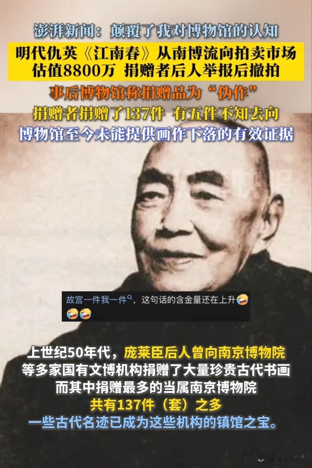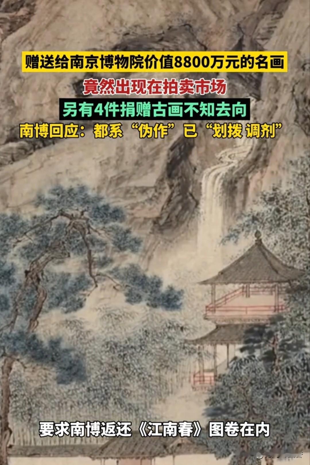 6800元贱卖后 估价8800万!南博捐赠 名画风波,新华社撕开遮羞布…? 新华社权威报道引爆热议:1959年庞家无偿捐赠南京博物院的仇英《江南春》,经两次专家鉴定为“伪作”,1997年被划拨至省文物总店,2001年以6800元《仿仇英山水卷》名义售出。 如今这幅画现身拍卖市场,估价高达8800万,庞家后人才发现藏品“失踪”,已起诉南博并申请强制执行。网民炸锅:“专家眼盲还是流程有猫腻?”“捐赠品岂能悄悄贱卖?” 个人认为,文物鉴定有时代局限可理解,但捐赠品处置需透明合规,更应尊重捐赠人知情权。目前江苏文旅已成立专班调查,真相待解。 你觉得这幅画是“赝品逆袭”还是“处置失当”?欢迎评论区聊聊!仇英作品价格