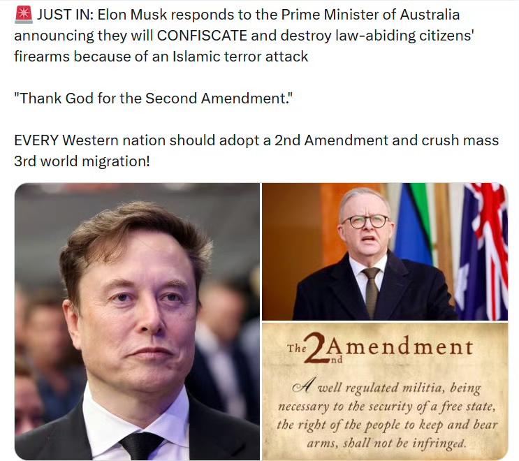 埃隆·马斯克回应澳大利亚总理宣布:因一起伊斯兰恐的美好袭击,将没收并销毁守法公民的枪支一事: “感谢神赋予《第二修正案》。” “每一个西方国家都应该采纳第二修正案,并彻底遏制大规模的第三世界移民!”