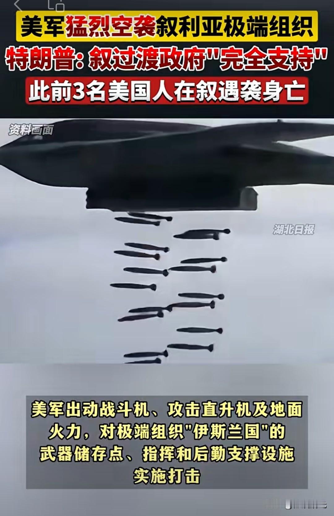 【忽发消息】美国向叙利亚“伊斯兰国”发动猛烈攻击… 2025年12月19日美军在叙利亚发动“鹰眼打击行动”,以回应12月13日极端组织“伊斯兰国”(ISIS)造成美方3死3伤的袭击,打击叙中部70多个ISIS目标,约旦协同支援 … 美军这次动用了F-15E、A-10战机和AH-64阿帕奇直升机,海马斯火箭炮,100+精确制导导弹,看来是真的冒火了! 美国这次搞这么大的动劲,应该不仅仅是为了给前面那“3死3伤”的美国大兵报仇吧?