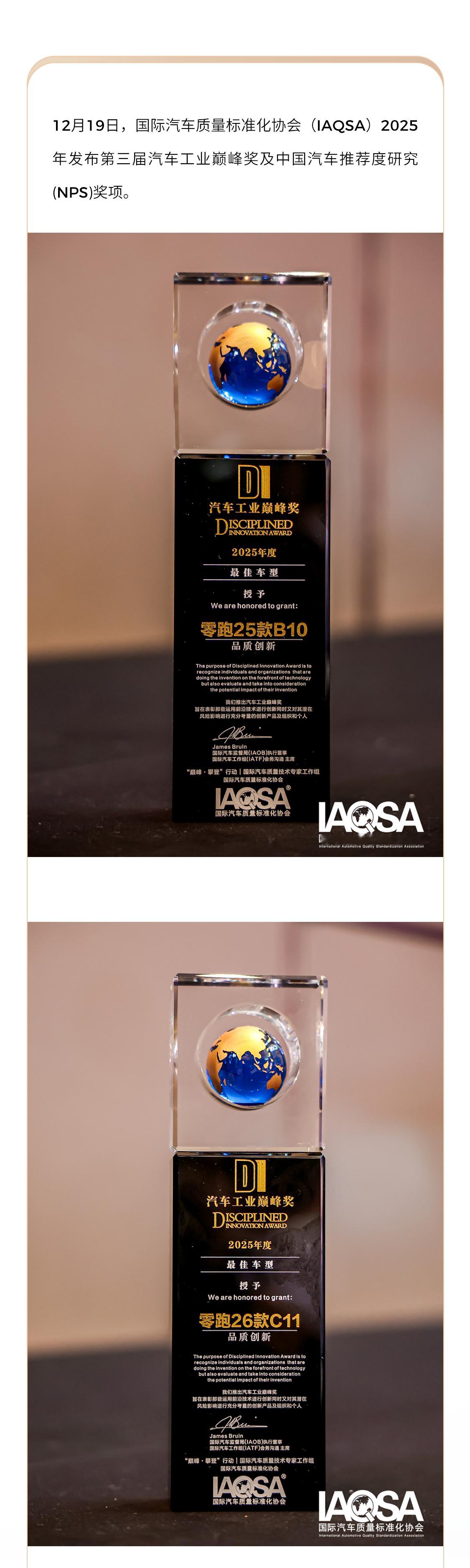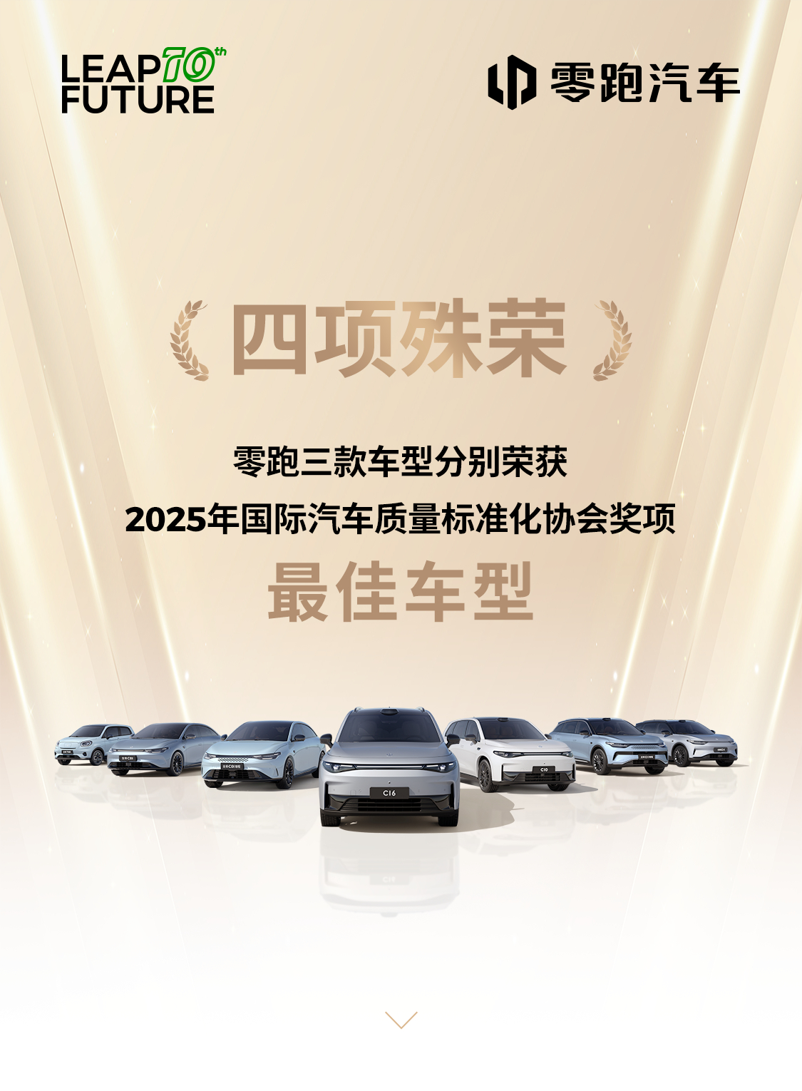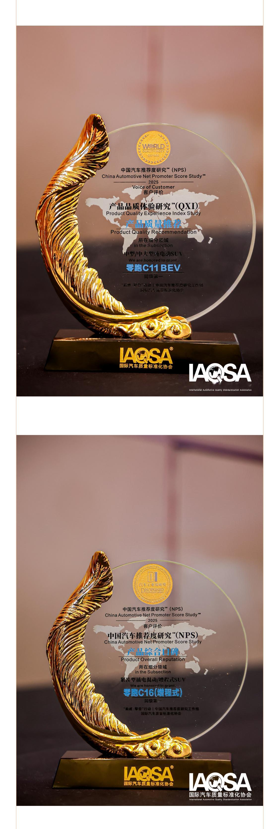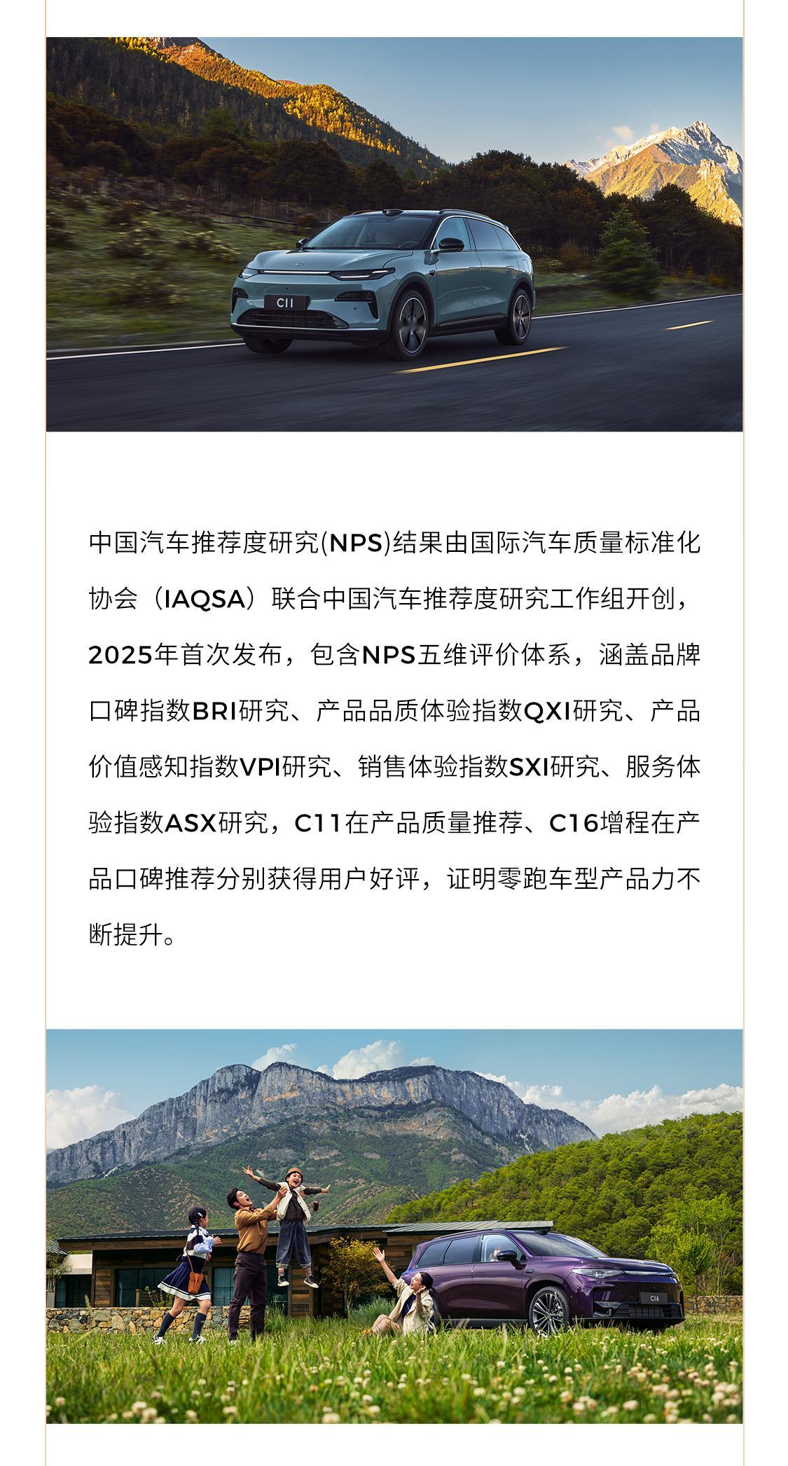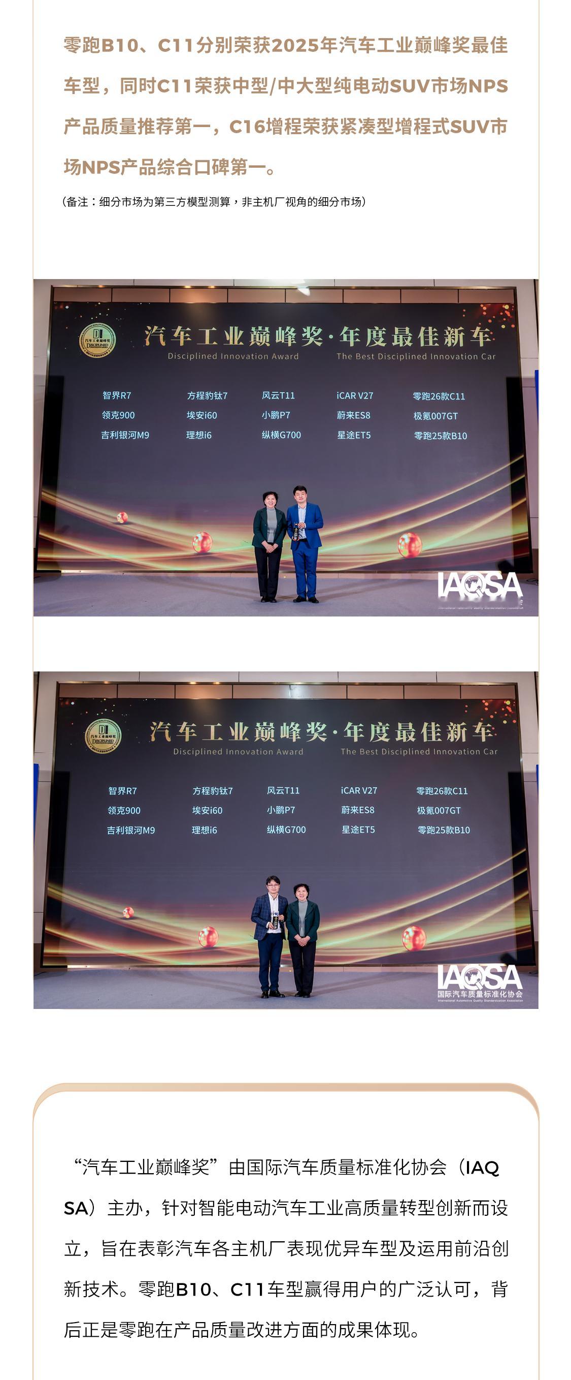 以质量为先,用实力说话零跑各车型在行业权威奖项评选中脱颖而出!🏆零跑B10、C11分别荣获2025年汽车工业巅峰奖最佳车型🏆零跑C11荣获中型/中大型纯电动SUV市场NPS产品质量推荐第一🏆零跑C16增程荣获紧凑型增程式SUV市场NPS产品综合口碑第一零跑将持续聚焦全域自研,打造好而不贵的产品和零居们一同解锁高品质出行体验!零跑B10零跑C11零跑C16