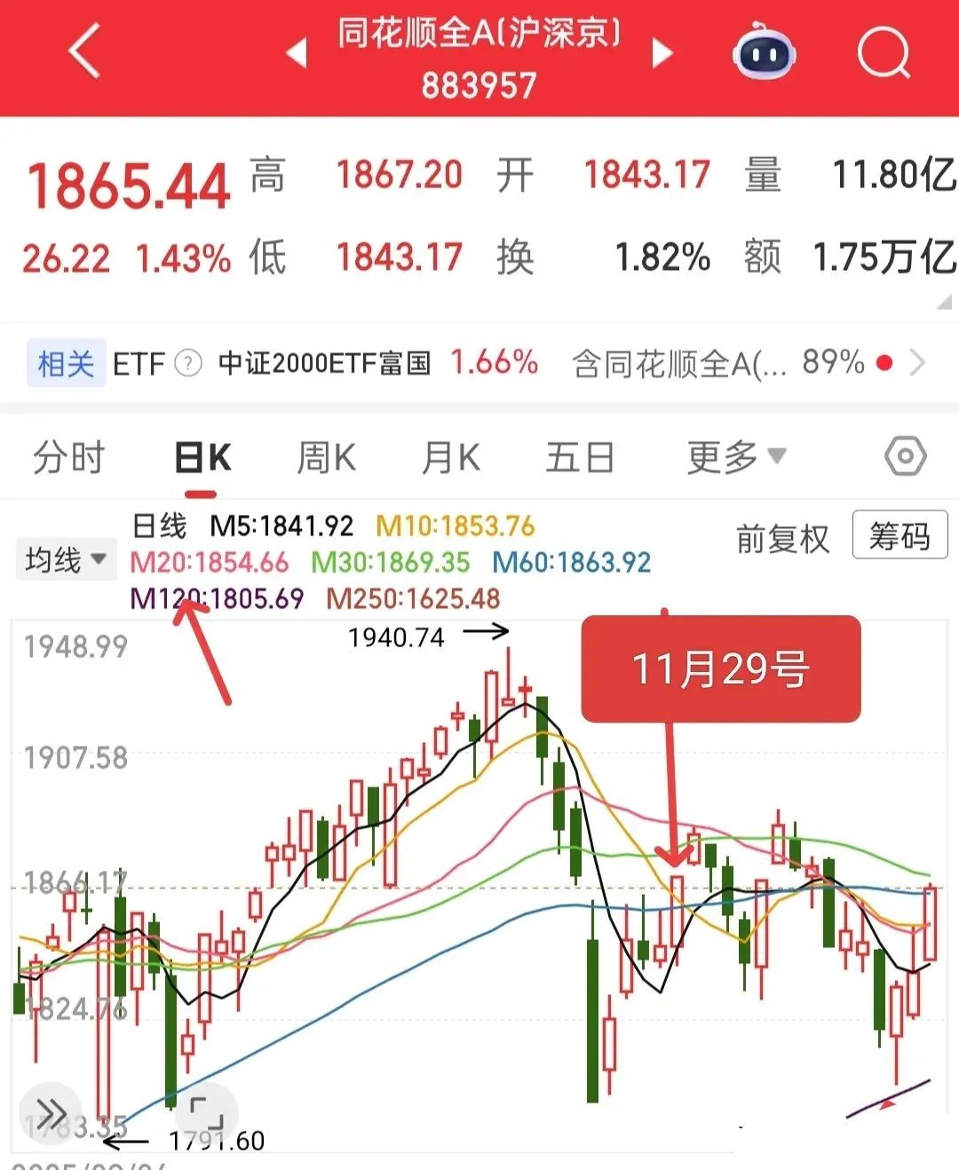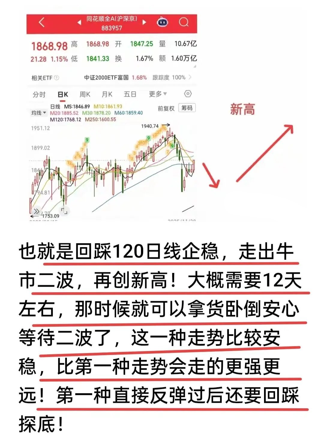 牛市二波开启了吗?后续走势与短中线应对策略全解析全A指数已然回踩120日线,大家最关心的问题来了:牛市二波是不是要启动了?今天咱们就顺着关键信号和盘面细节,一步步把逻辑捋清楚。熟悉林哥的朋友都知道,11月29号的文章我就明确说过,全A啥时候回踩120日线,我就啥时候把那篇文取消置顶。先看时间线印证,从11月29号到12月17号全A精准回踩120日线,刚好是12个交易日!绝非事后马后炮,就是不想被人无端嘲讽,这份预判经得起盘面检验。但问题来了,全A已经回踩120日线,是不是牛市二波就直接启动了?答案是:还需耐心等一等,震荡整理期尚未结束。咱们看盘面两个关键整理箱体就能明白,左侧箱体足足震荡了约44个交易日,而右侧当前放量震荡仅22个交易日,还差22个交易日的整理周期。更关键的是,右侧箱体每个交易日的量能均大于左侧,量能打底之下,足以推断全A还会在右侧区间整理2-3周,直至突破1889点关键点位!对应到大盘指数上,全A突破1889点的核心前提,就是大盘成功站上3928点。从日线级别来看,A股历来有个规律:每一个重要压力位,往往需要3-4次冲击才能有效突破。结合这个规律来看,大盘接下来还会围绕右侧箱体震荡2-3周,期间会以波段走势2次触碰压力位,完成蓄力突破的铺垫。那为什么林哥依旧坚定判断,牛市二波必然会启动?核心锚点看富时A50!大家看富时A5010月8号的那个高点,这个位置后续必然会突破。要知道,当前全市场各类指数均已突破10月8号的高点、创下阶段新高,作为市场核心风向标,富时A50跟进突破只是时间问题,风向标定调之下,牛市根基未改。所以结论先给大家吃定心丸:牛市依旧在,当下市场已经彻底安全!林哥平时主打短线操作,思路都是短线风格为主,但考虑到还有很多做中线的粉丝,所以关于大趋势的判断,我都会特意置顶,就是不想让我的短线节奏,影响到中线选手的持仓心态。尤其对于中线朋友,林哥想说,当下这个位置完全没必要再惊慌失措。随着整理周期到位、量能持续打底,大盘后续必然会突破前高,中线坚定持仓即可,不必被短期震荡干扰。至于接下来2周的短线操作,林哥的观点很明确:必须踩准节奏!因为市场还会保持来回震荡走势,大概率是进三退三、进四退三的震荡蓄力行情,追涨杀跌容易来回打脸,短线操作核心就是低吸高抛,跟着震荡节奏做波段,不贪心、不恋战。