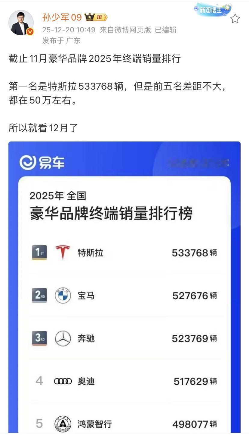 孙少军:截止11月豪华品牌2025年终端销量排行! 第一名是特斯拉533768辆,前5名的区别都不是很大,前11一个月销量都在50万辆左右。 现在就看全年,哪家的销量高了,哪家赢面就非常大。如果把20万元价格以上都算作豪华车的话,很多国产品牌确实挺有优势的。 蔚来和理想他们的产品都没有20万元以下的,所以对于他们来说,这个销量榜单非常具有参考性。