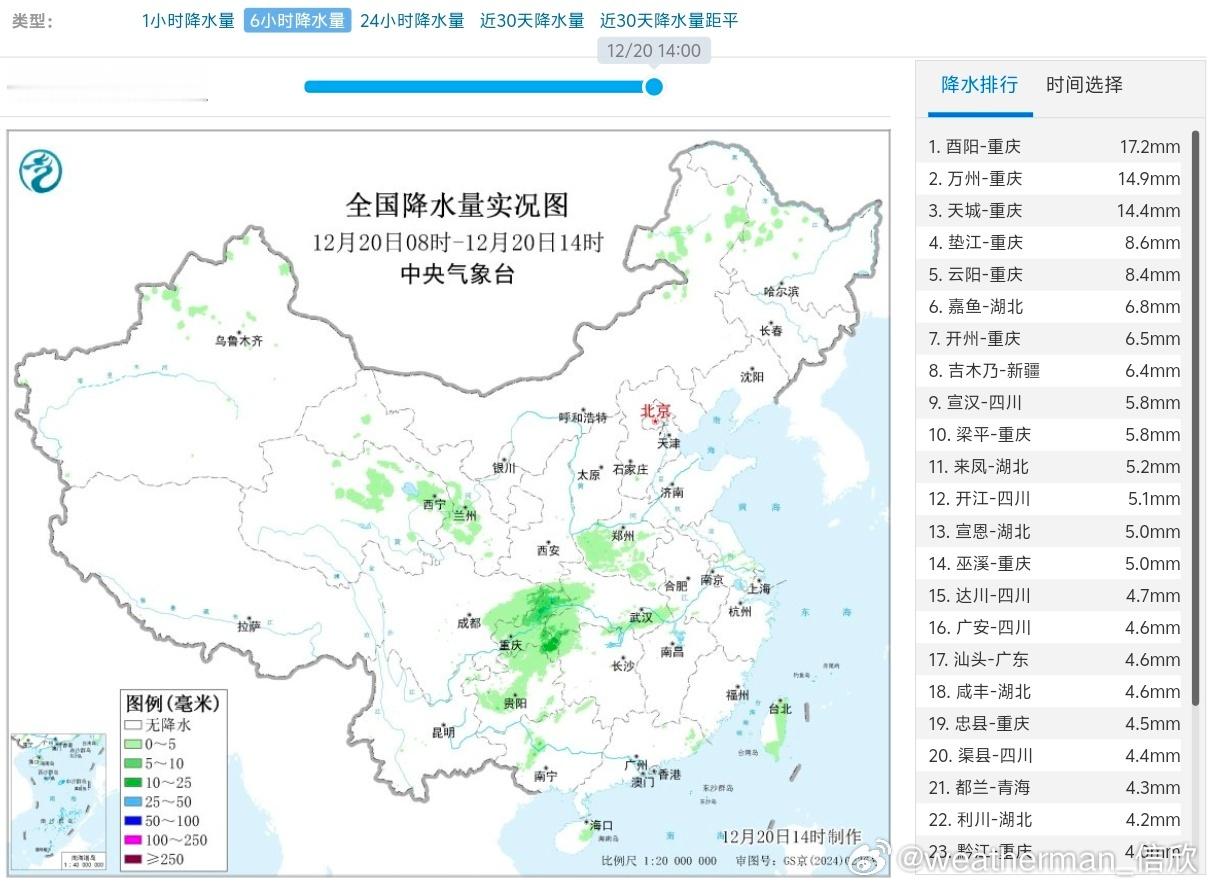 【降水和干燥】今天随着干冷气团南下,辽宁以及华北多地空气明显变干燥。14时相对湿度,辽宁葫芦岛只有9%,北京13%,天津西青16%。今天08-14时,重庆降水发展增多,重庆站点包揽了6小时降水榜前5,酉阳17.2毫米,排名第一。今天下午到明天中午,长江流域降水会进一步增多,降雨为主。陕西重庆湖北交界一带的山区以及新疆西南部山区都可能有强降雪。