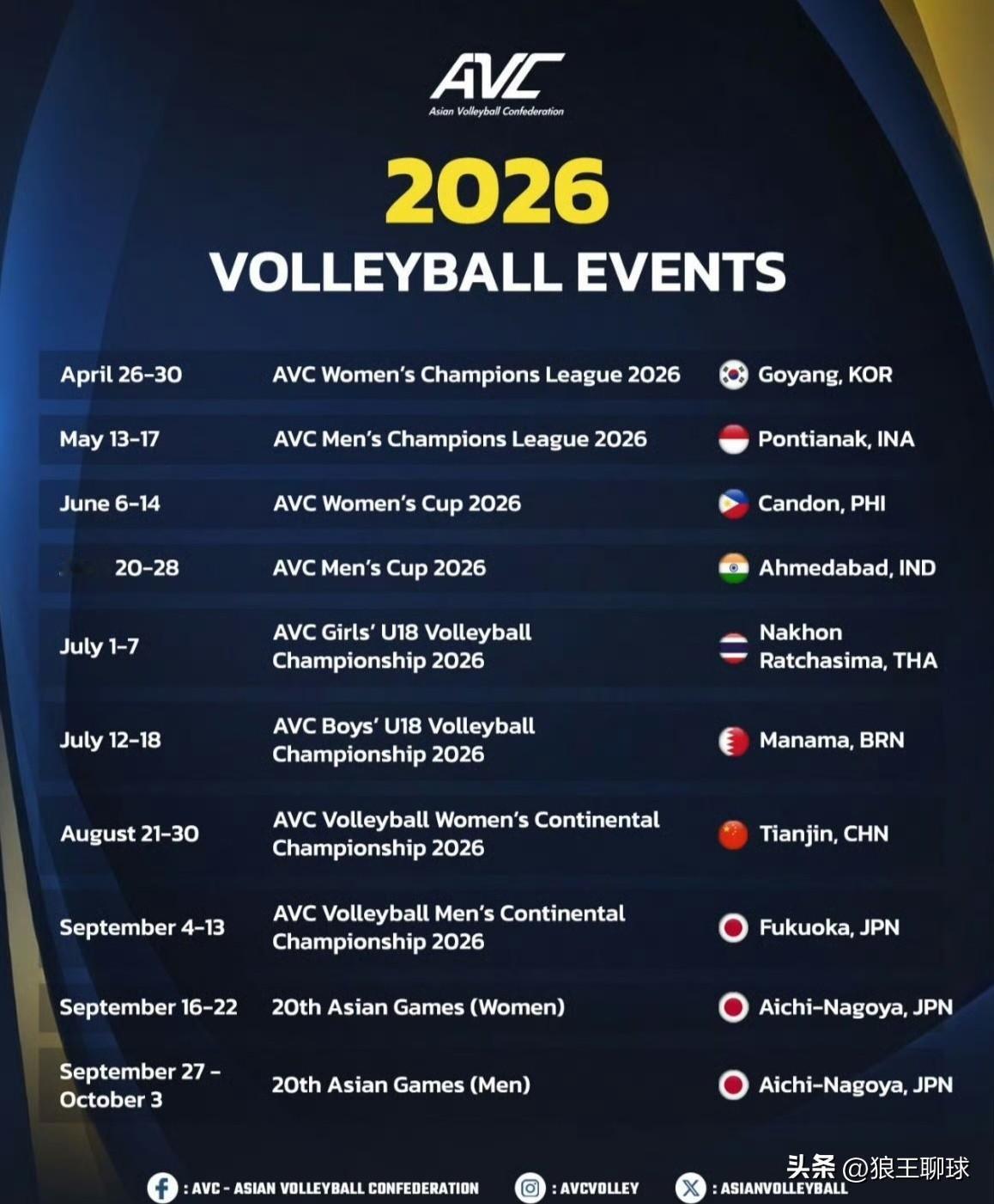 2026年亚洲排球赛事安排: 1.女排亚俱杯 日期:04月26日-04月30日 地点:韩国·高阳 2.男排亚俱杯 日期:05月13日-05月17日 地点:印度尼西亚·坤甸 3.亚洲女排国家杯 日期:06月04日-06月14日 地点:菲律宾·坎当 4.亚洲男排国家杯 日期:06月20日-06月28日 地点:印度·艾哈迈达巴德 5.U18女排亚锦赛 日期:07月01日-07月07日 地点:泰国·呵叻 6.U18男排亚锦赛 日期:07月13日-07月20日 地点:巴林·麦纳麦 7.亚洲女排锦标赛 日期:08月21日-08月30日 地点:中国·天津 8.亚洲男排锦标赛 日期:09月04日-09月13日 地点:日本·福冈 9.亚洲运动会(女排) 日期:09月16日-09月22日 地点:日本·爱知-名古屋 10.亚洲运动会(男排) 日期:09月27日-10月03日 地点:日本·爱知-名古屋 亚洲排联主席拉蒙·苏扎拉对即将到来的2026赛季充满信心:“我们非常激动地呈献这份充满活力且竞争激烈的 2026 年亚洲排球赛历。这些赛事反映了亚洲排球从基层青少年培养到顶级洲际综合性赛事的持续进步。竞技质量的提升、更广泛的地区参与度以及日益增长的全球认可度,都表明亚洲排球正强有力且自信地向前迈进。”