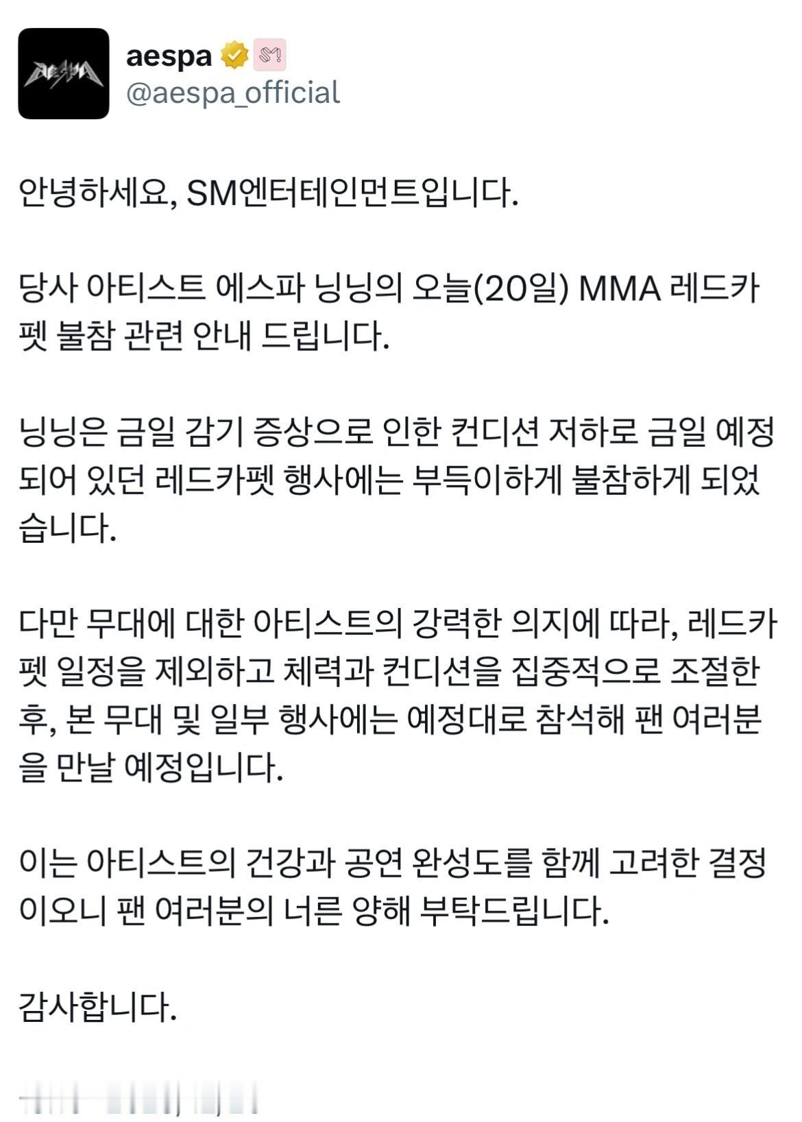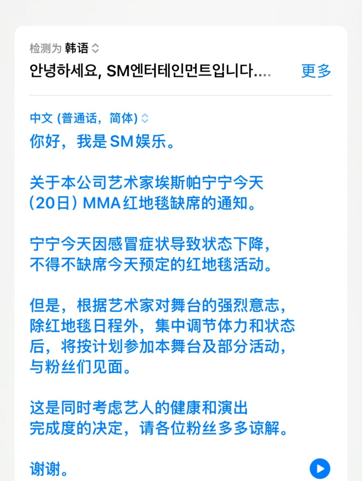 宁艺卓因身体不适缺席MMA红毯“由于艺人对参加舞台的强烈意愿,除红毯行程外,正集中调整状态和体力如期参加后续舞台和其他活动。”