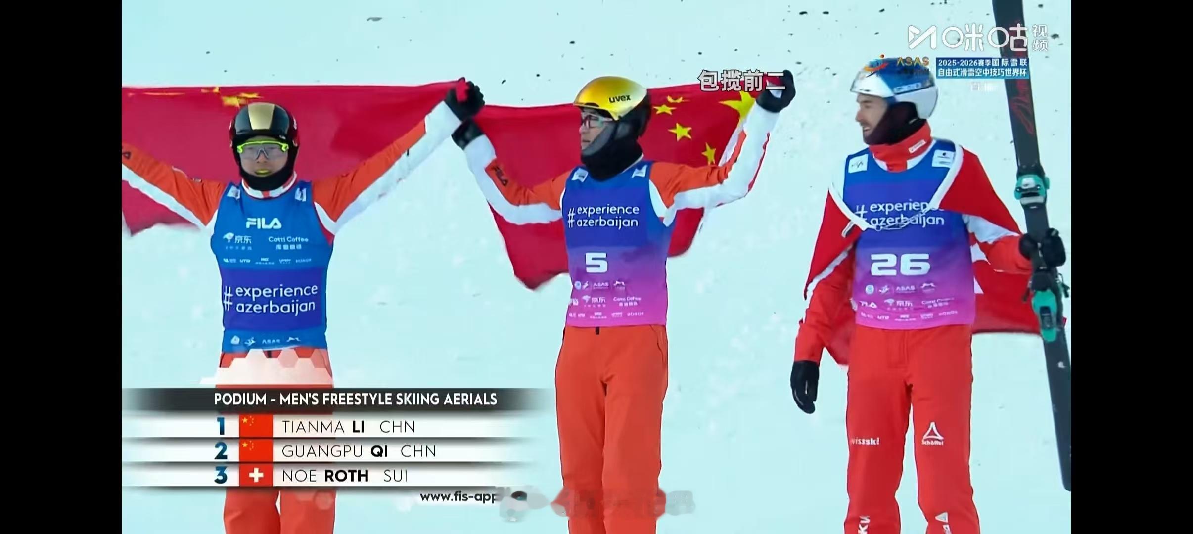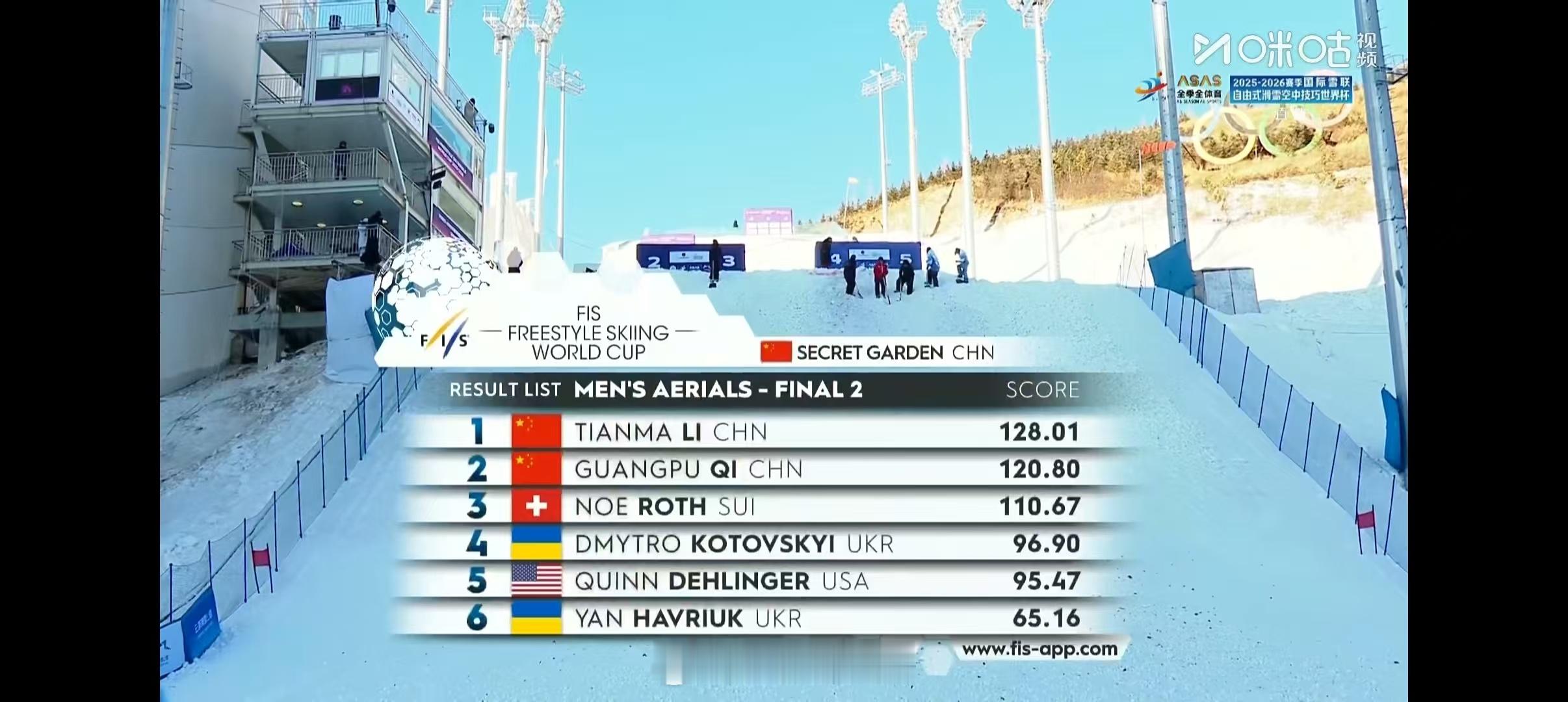 2025-26赛季自由式滑雪空中技巧世界杯第二站🇨🇳云顶站男子决赛第二轮🥇🇨🇳李天马128.01分(bdFdFF5.100难度)🥈🇨🇳齐广璞120.80分(bFdFF4.425难度)🥉🇨🇭罗斯110.67分(bdFdFF5.100难度)4.🇺🇦科托夫斯基96.90分(bFdFdF5.100难度)5.🇺🇸德林格尔95.47分(bdFFF4.525难度)6.🇺🇦哈夫利乌克65.16分(bdFFF4.525难度)