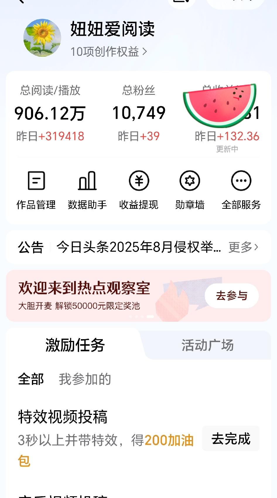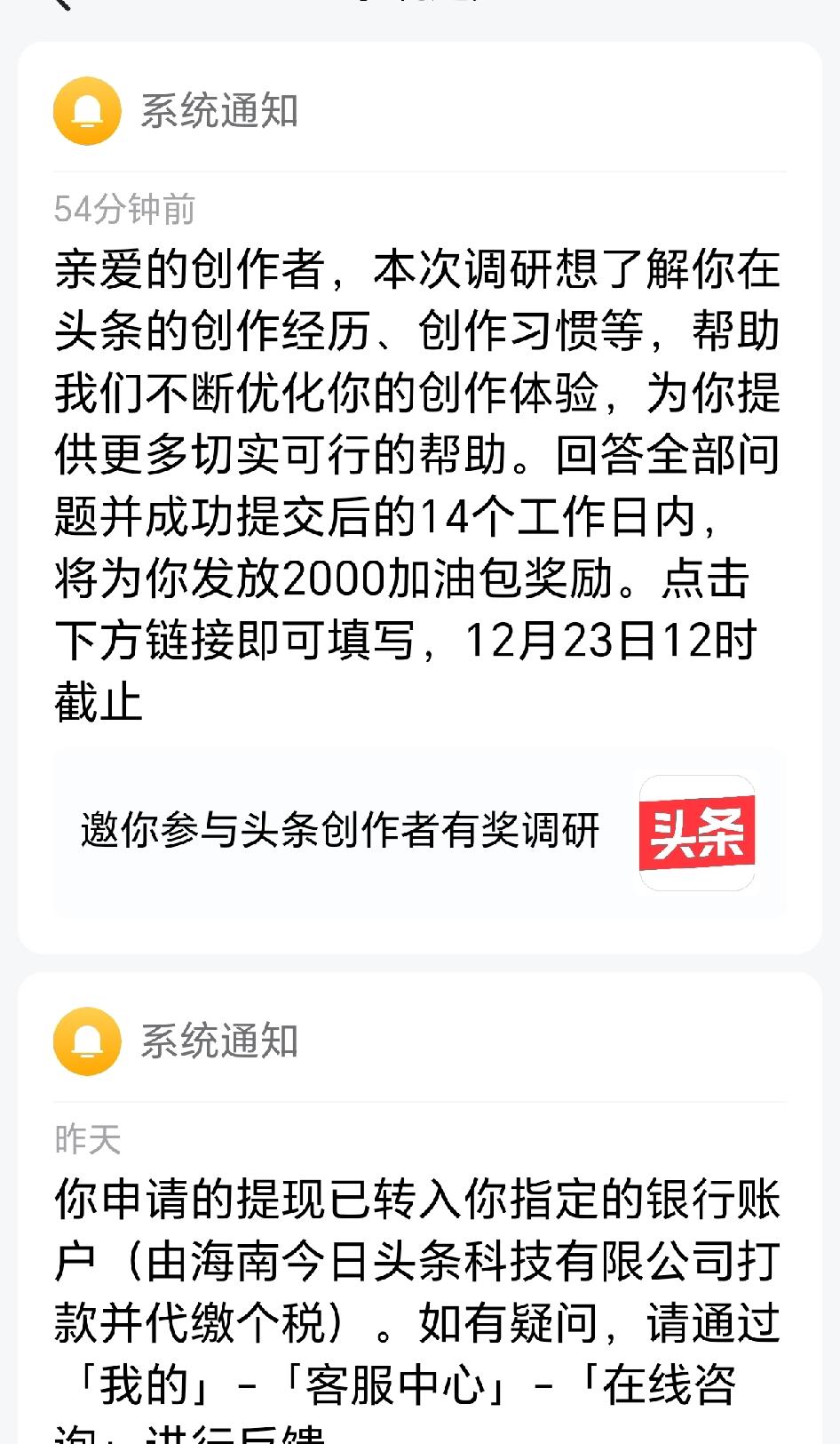 收益出来了,31万阅读,给了132元,千次单价4毛,这是昨天的数据。 昨天爆了两条,今天发什么都没流量,我能说平台又给我发糖豆呐。 就这3-4毛的单价,再多流量也不会有太高的收益,前两天还有过7-8毛的单价,仅仅只有两天价格就降下去了,又恢复原样了。 最搞笑的是,我看到好多条友,发出来的平台邀请活动,有的完成任务了,有的没完成任务。 我就纳闷我怎么都接不到这种活动,就算我所有等级的活动都能完成,又能领多少奖金呐? 昨天实在忍不住问客服人员,“我”为什么接不到邀请活动?平台回复:让我耐心等待,唉!我也是搞笑的很,接不到活动居然跑过去问客服。 最搞笑的是过了不到5分钟,我在私信里居然收到调研邀请,填好问卷,两个星期后会有2000个加油包,作为奖励。 这是次平台第一次回应,而且还执行了,看来客服不是机器人,也是有血有肉的人在回消息! 问题虽然没解决,但也给你发活动了,而且没有任务,只要填问卷,就有2000个加油包。 以前填问卷是没有任何奖励的。[呲牙][呲牙][呲牙]