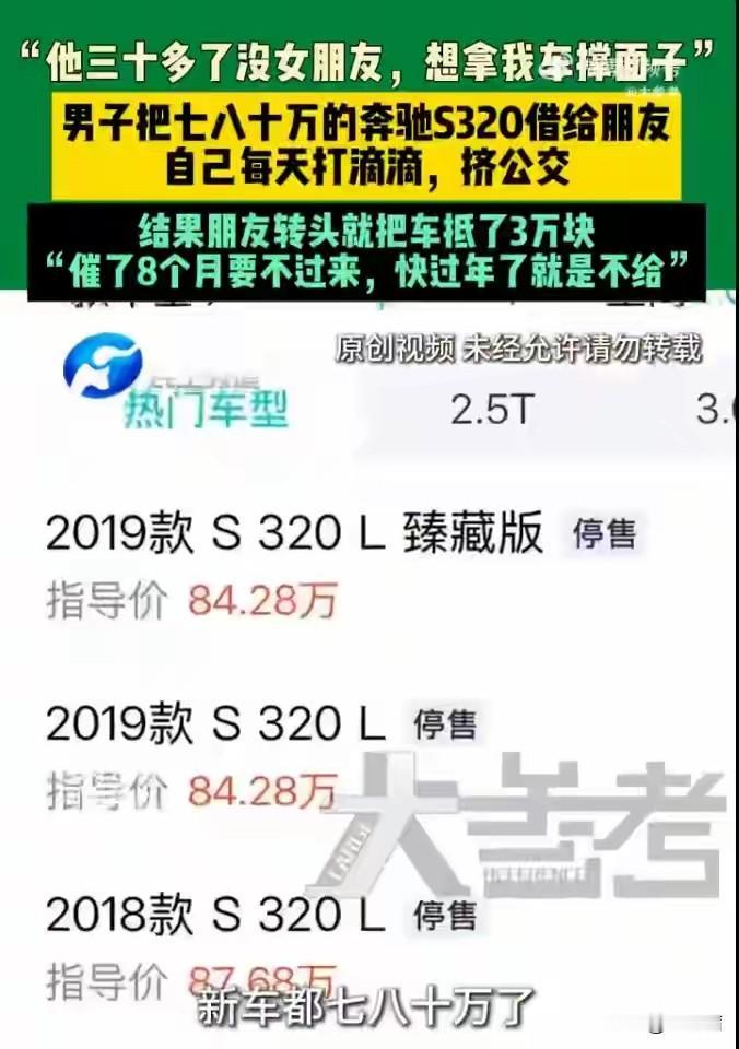 80万奔驰借朋友撑面子找对象,自己挤8个月公交,结局太扎心! 河南郑州有位郑先生最近可以说是肠子都悔青了,只因他一时心软借了辆车,把自己坑得够呛。 郑先生辛苦攒钱给自己买了辆价值80万的奔驰S320,日子原本过得挺舒心,可朋友陈先生的一个请求让他犯了难。 因为朋友陈先生三十多岁还没有对象,说想借奔驰撑撑场面去相亲,还说能不能娶到媳妇全看这回事了。 都说车子就像老婆,该不外借。郑先生原本一开始也是不想借的,可架不住朋友软磨硬泡,抹不开面子的他最终还是把车钥匙交了出去。 可是让他没想到的是,这车一借出去就没了踪影,整整8个月里,郑先生每天要么挤公交,要么打滴滴上下班,每次催朋友还车,对方都找各种理由推脱。 直到郑先生忍无可忍逼问到底,陈先生才说实话:车子早被他以3万元抵押还债了。 80万的豪车只抵了3万,郑先生又气又无奈,直言现在不敢再相信任何人。 目前陈先生也意识到自己闯了大祸,心里满是愧疚,正在想办法凑钱把车赎回来。 现在这社会也真是啥人都有。彼此的诚信都被这些事件给消磨完了。 这么贵的车三万块钱抵出去,也是让人万万没想到,最主要还是别人的车。 这事情也算是给大家一个提醒啊。不管再好的朋友,只要涉及到贵重物品借贷都得谨慎。 毕竟有一句古话说得好:“知人知面不知心”。一时的情面可能会换来难以挽回的损失对此你怎么看?