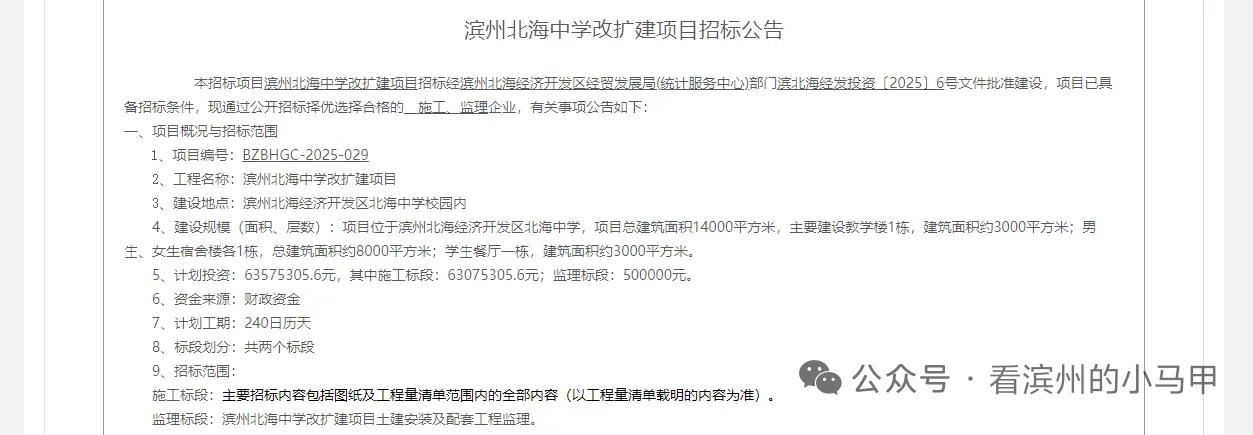 定了!滨州一中学改扩建 12月20日,山东滨州北海中学改扩建项目招标公告发布,该项目的建设地点位于滨州北海经济开发区北海中学校园内:校内建1栋教学楼、2栋宿舍楼、1栋餐厅,总建面1.4万㎡,投资6357.53万,工期240天;该校由魏桥国科托管,办学可消大班额、补北海经开区高中空白,实现幼小高全覆盖。 来源 综合滨州市人民政府官网